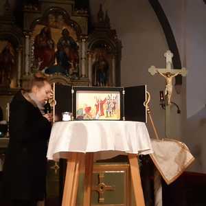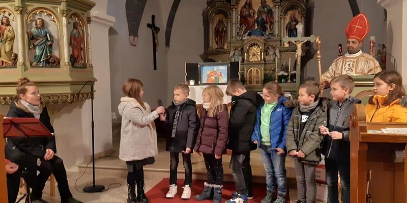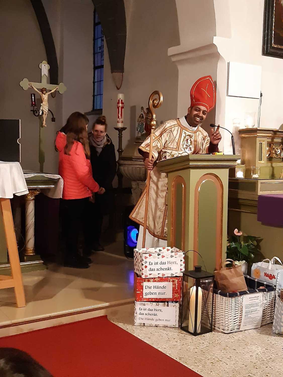 Nach einer kurzen Begrüßung stellten Pfarrer Shinto und Jungscharleiterin Katja den Heiligen Nikolaus vor, in dem sie in Form eines Erzähltheaters eine Geschichte – die Legende der Schiffsrettung - erzählten und anschließend wurde die Kleidung (Bischofsmantel, Mitra, Zingulum, Brustkreuz und Bischofsstab) des Hl. Nikolaus den Kindern erklärt.