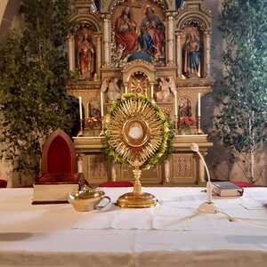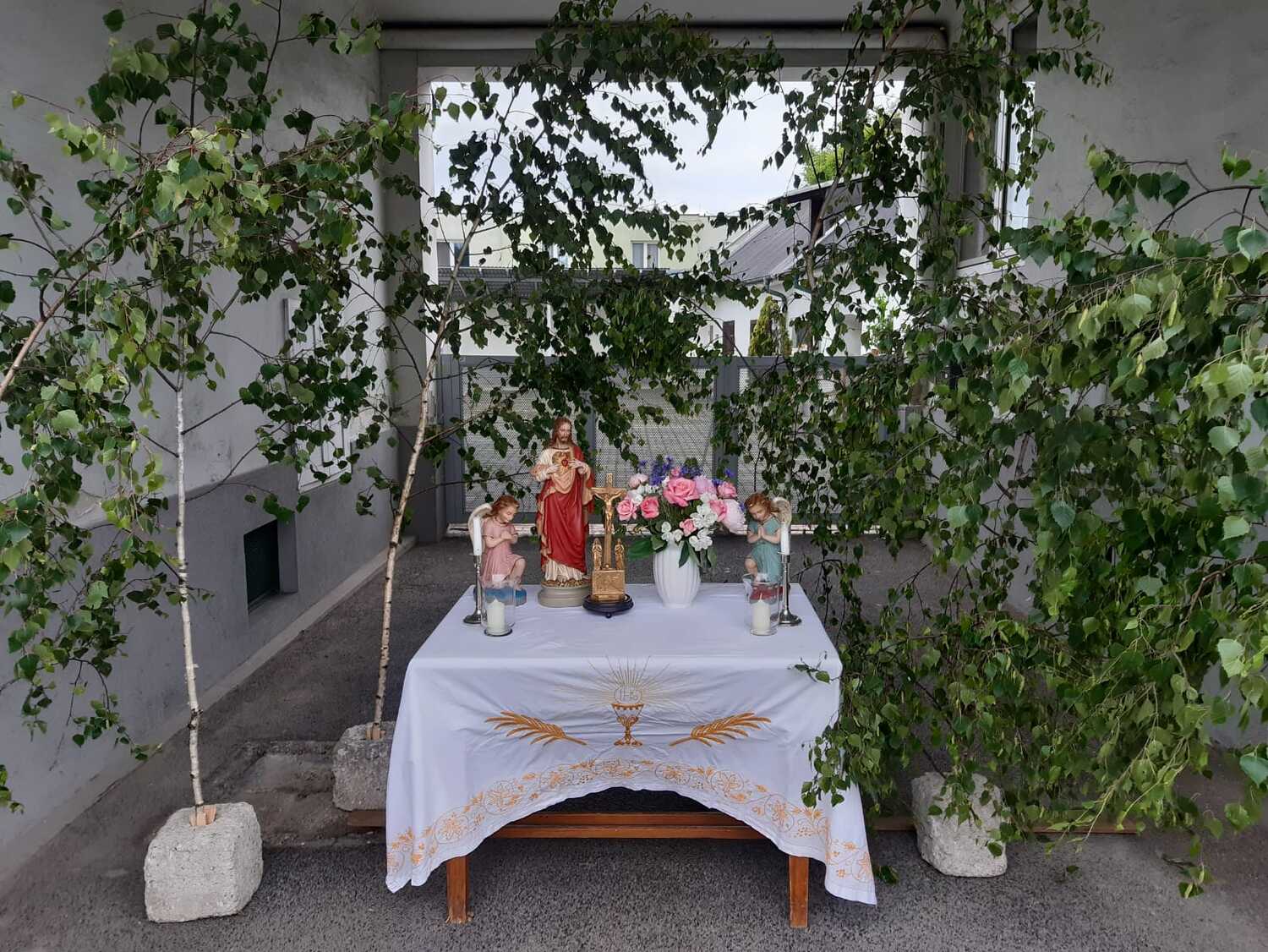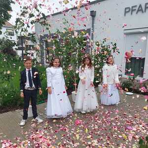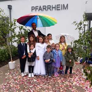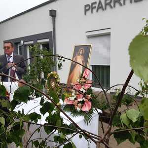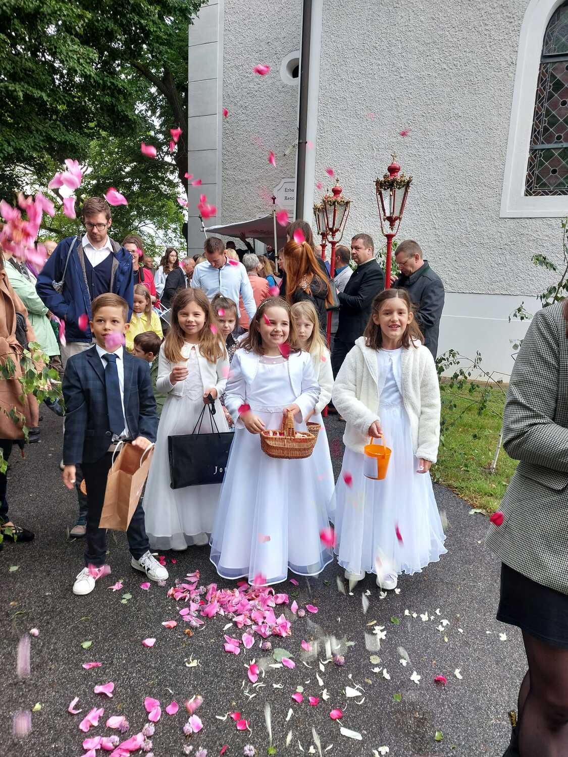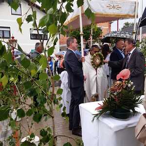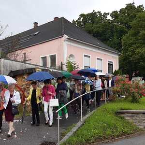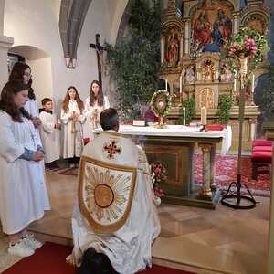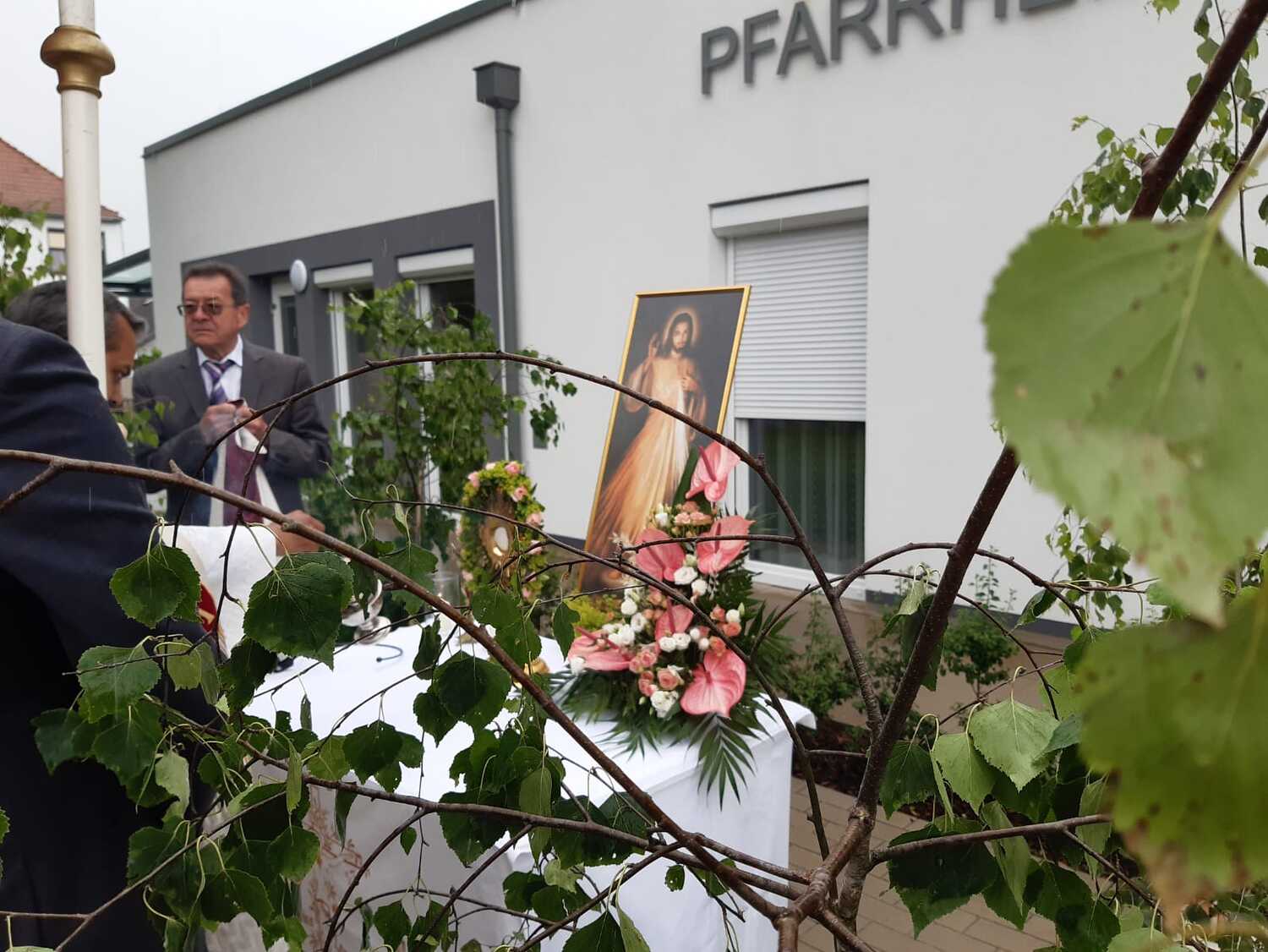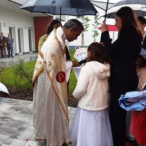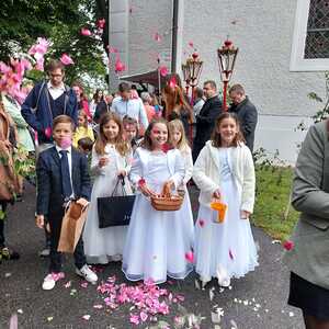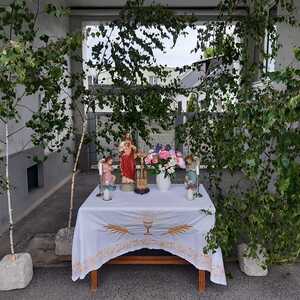 Der Ablauf des Festes musste jedoch wegen des schlechten Wetters kurzfristig geändert werden. Die 1. Station wurde in der Kirche gebetet. Der Weg zum naheliegenden Pfarrheim, wo die 2. Station war, wurde trotz Regen auf sich genommen. Eine besondere Freude hatten die Kinder, die auch ihre Blumen streuen konnten. Die Ministranten und die Erstkommunionkinder haben an beiden Stationen das Vortragen der Fürbitten übernommen.