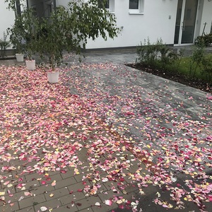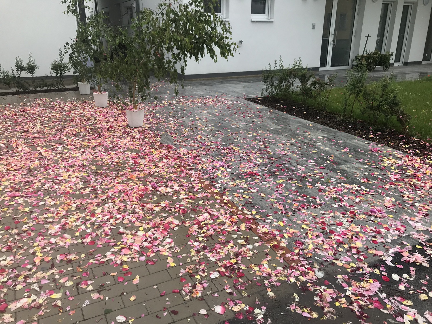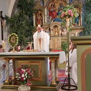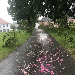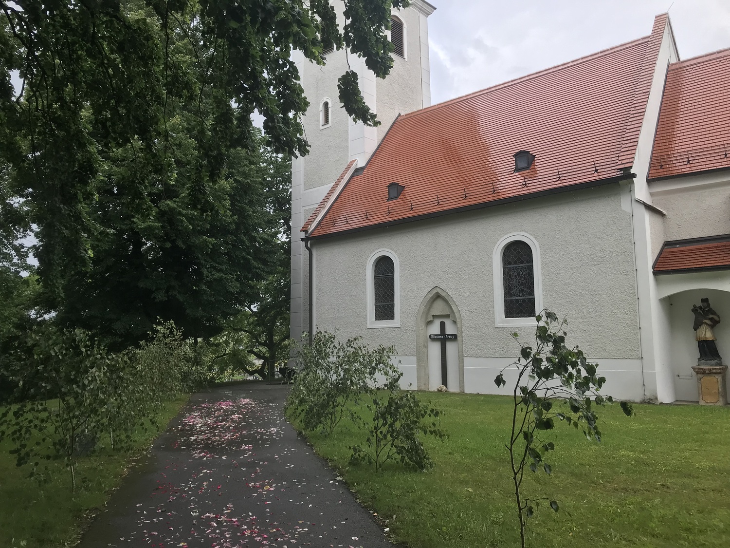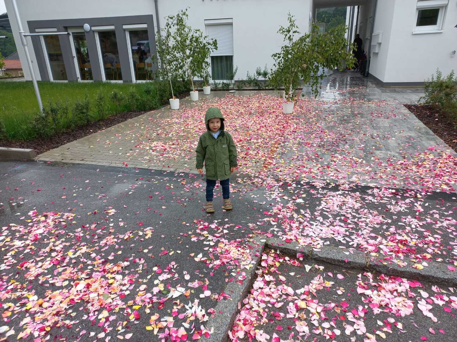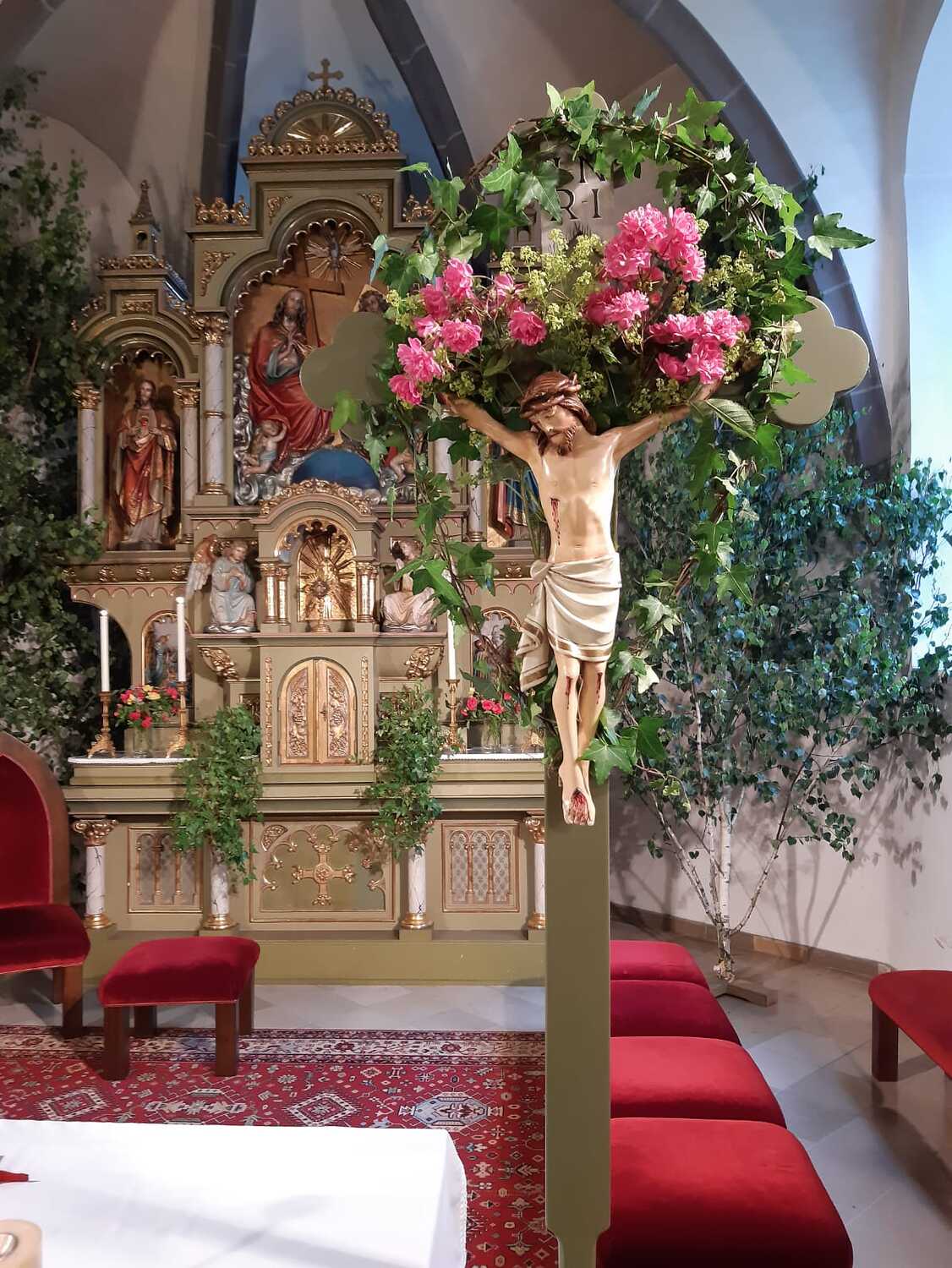 Der Ablauf des Festes musste jedoch wegen des schlechten Wetters kurzfristig geändert werden. Die 1. Station wurde in der Kirche gebetet. Der Weg zum naheliegenden Pfarrheim, wo die 2. Station war, wurde trotz Regen auf sich genommen. Eine besondere Freude hatten die Kinder, die auch ihre Blumen streuen konnten. Die Ministranten und die Erstkommunionkinder haben an beiden Stationen das Vortragen der Fürbitten übernommen.