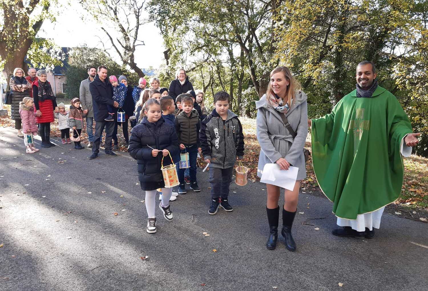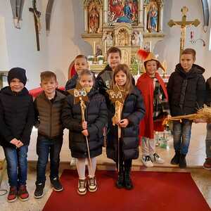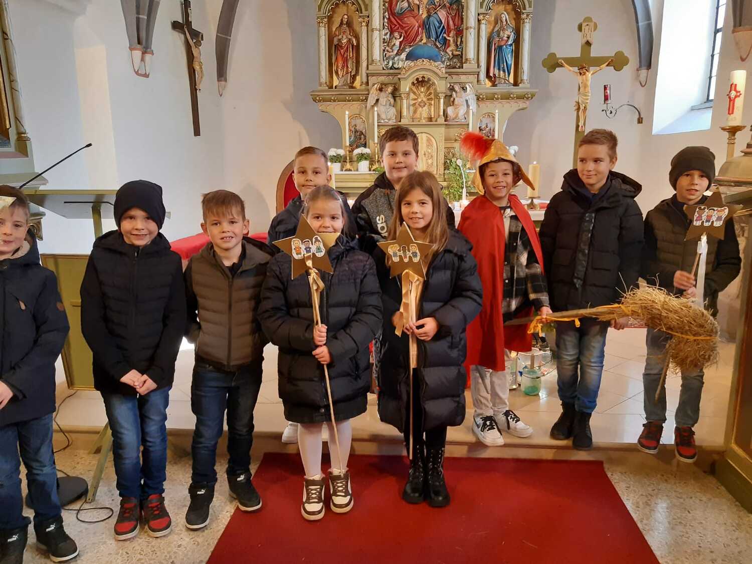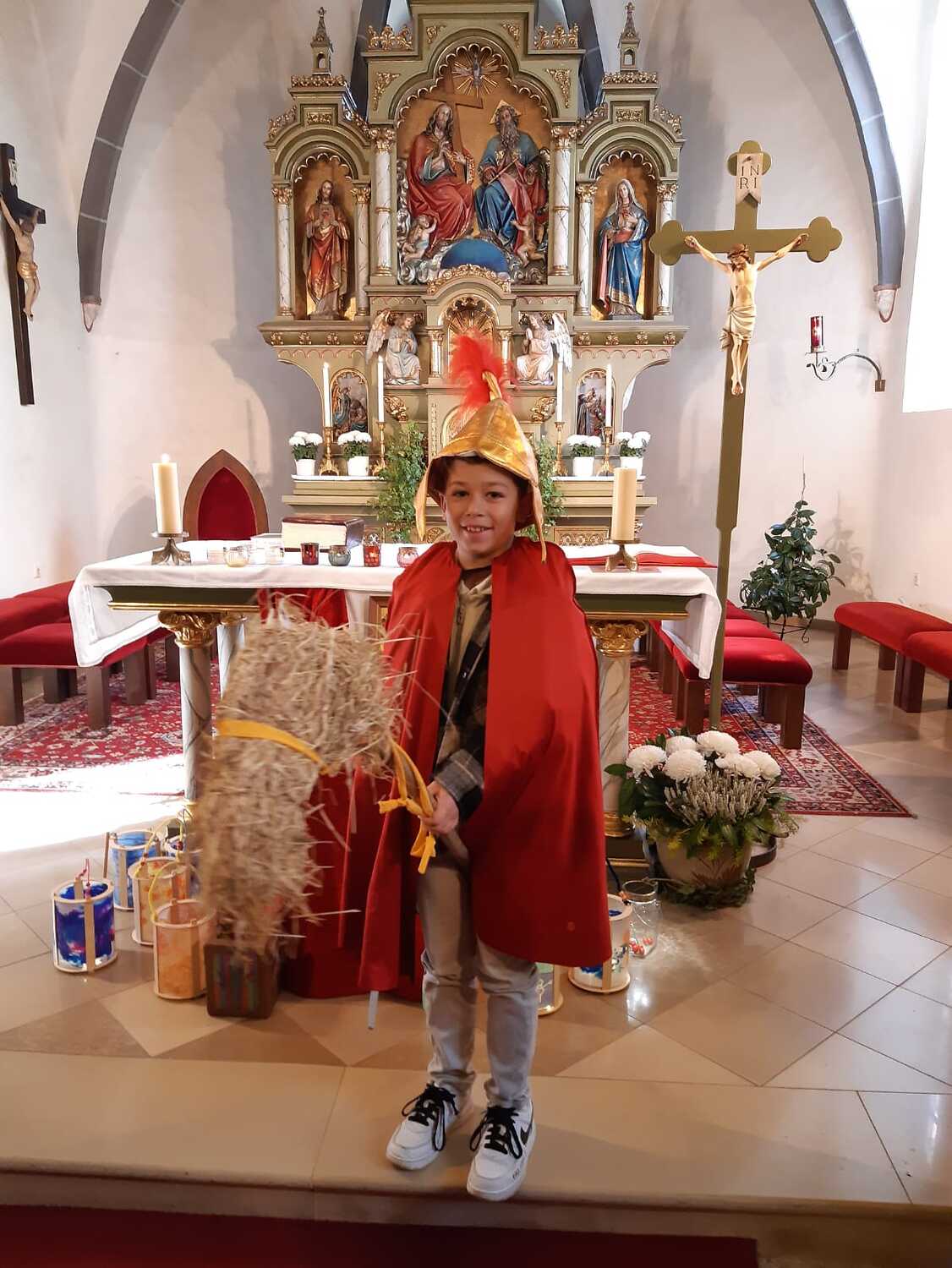 Nach der Predigt präsentierten die Kinder ein Martinsspiel der etwas anderen Art. Der Hl. Martin soll eine wichtige Botschaft in die nächste Stadt bringen und die Menschen wollen ihm dabei helfen und teilen mit ihm verschiedene Dinge für seine Reise. Aber auch Zuversicht und Mut haben ihm die Menschen mitgegeben.