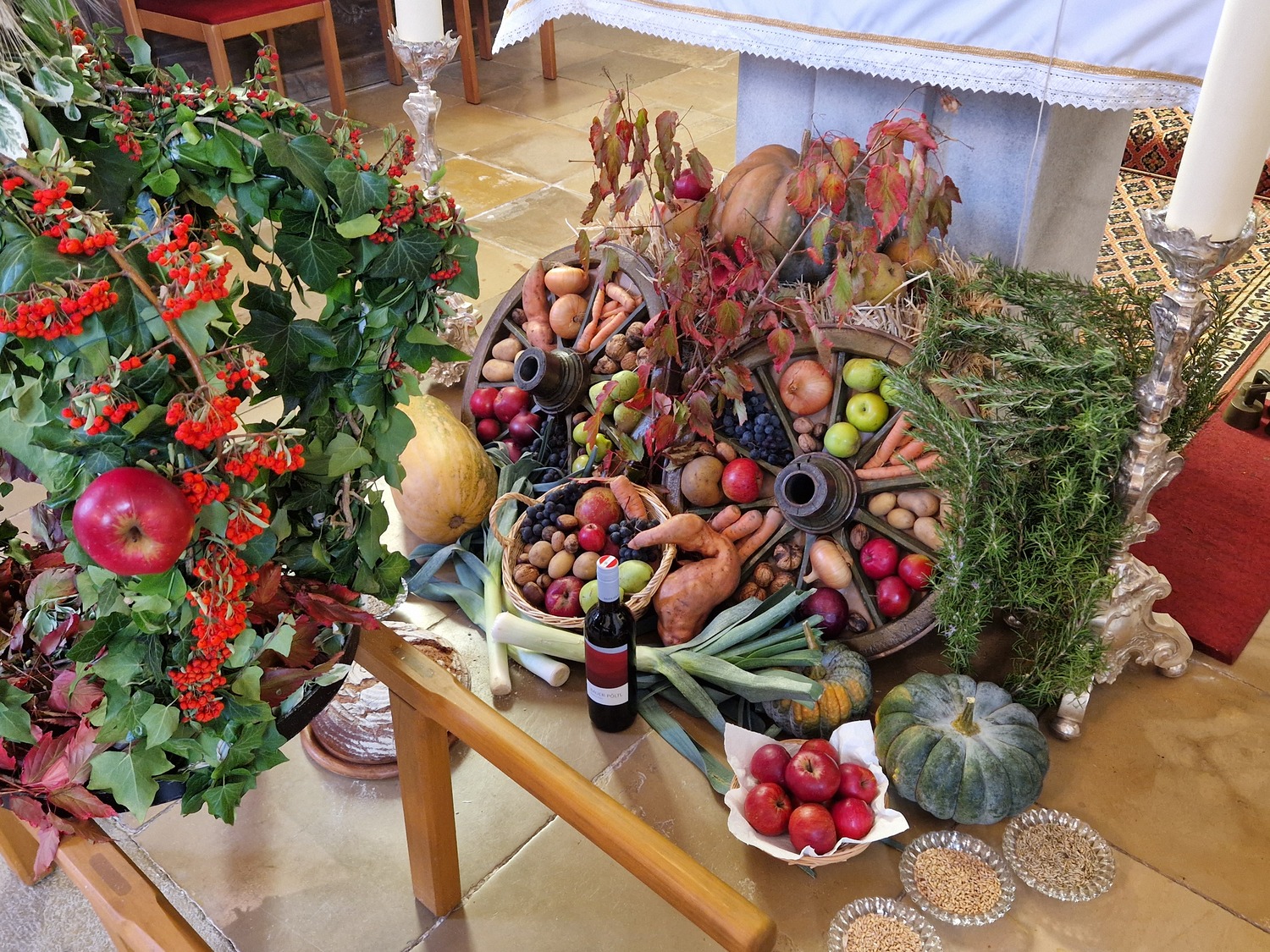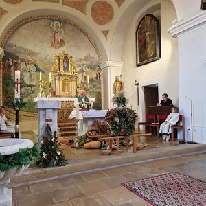Für die Erntedankfeier wurde die Kirche mit viel Obst und Gemüse geschmückt. Beim feierlichen Einzug mit Erntekrone und Gaben hatten die Kinder und Firmlinge alle Hände voll zu tun. Nach der Eucharistiefeier konnten bei der Agape nette Gespräche geführt werden.