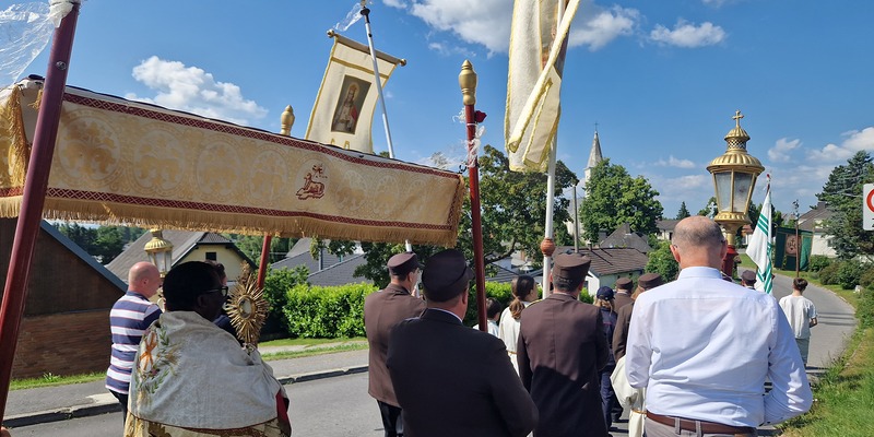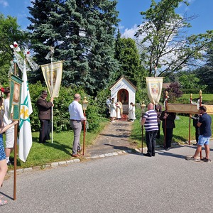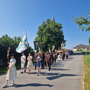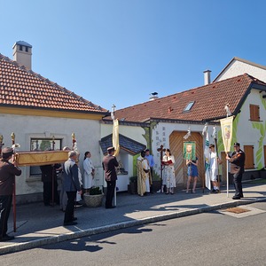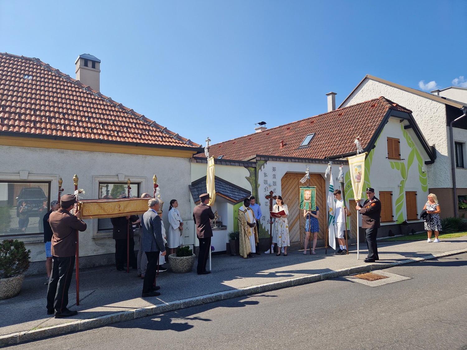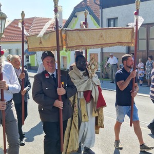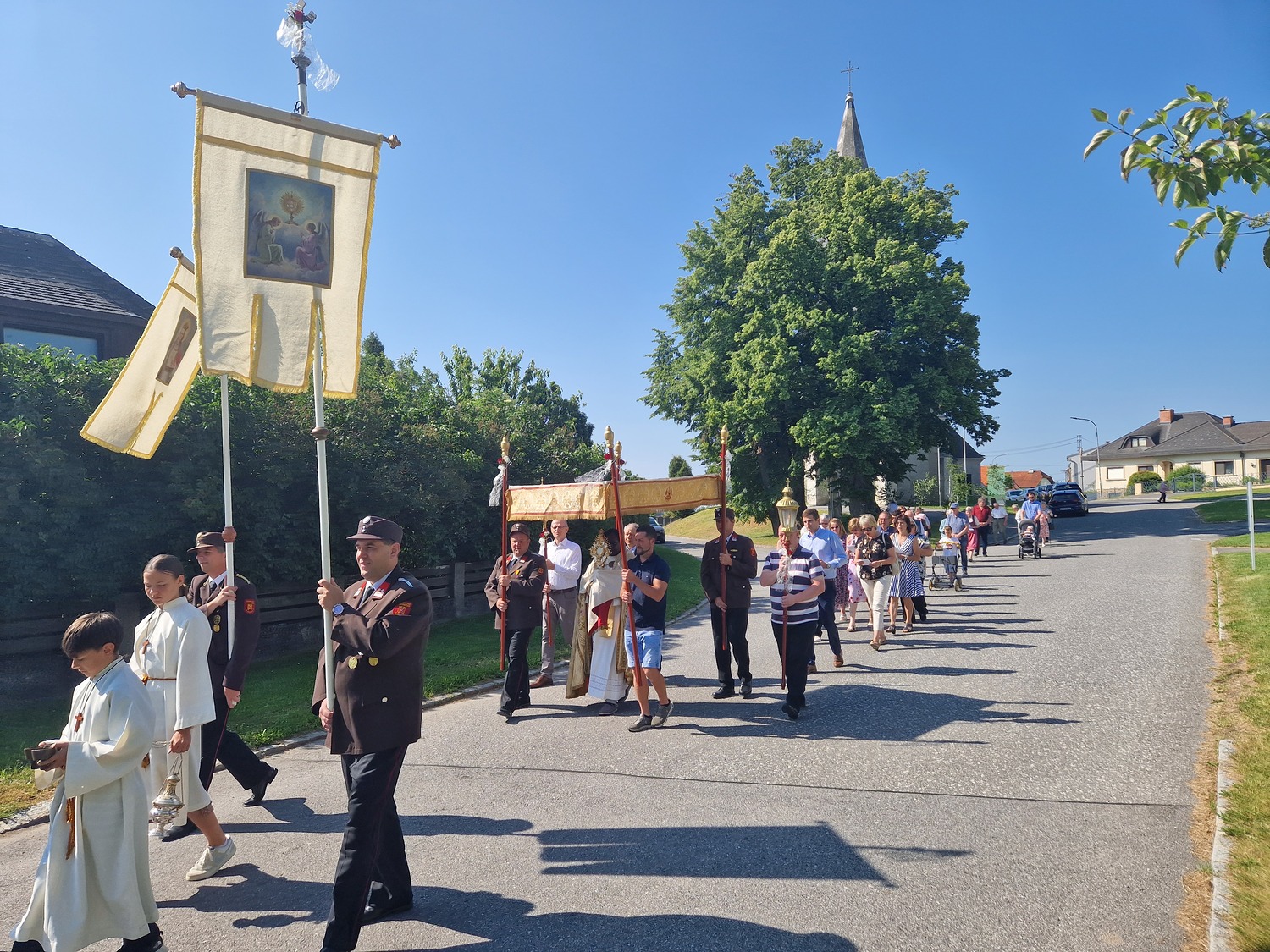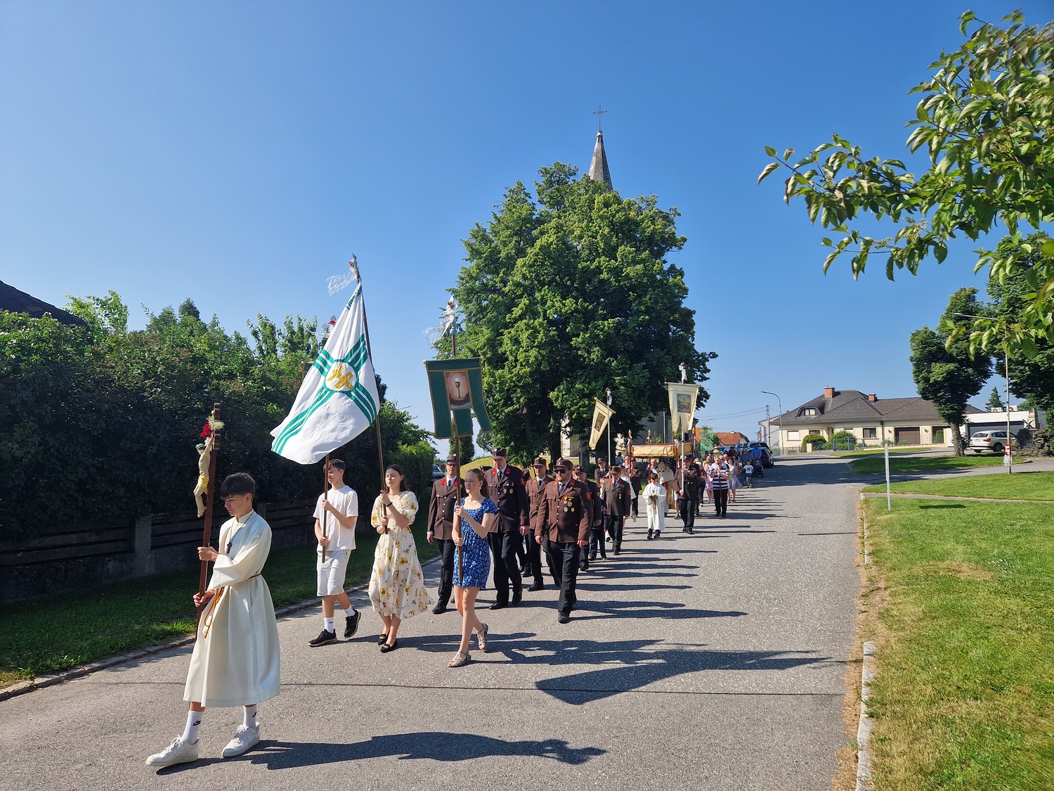 Bei sommerlichen Temperaturen fand nach der Heiligen Messe die Fronleichnamsprozession statt. Die Monstranz wurde durch die Ortschaft getragen und bei zwei Stationen spendete Pfarrer Basil den Eucharistischen Segen.