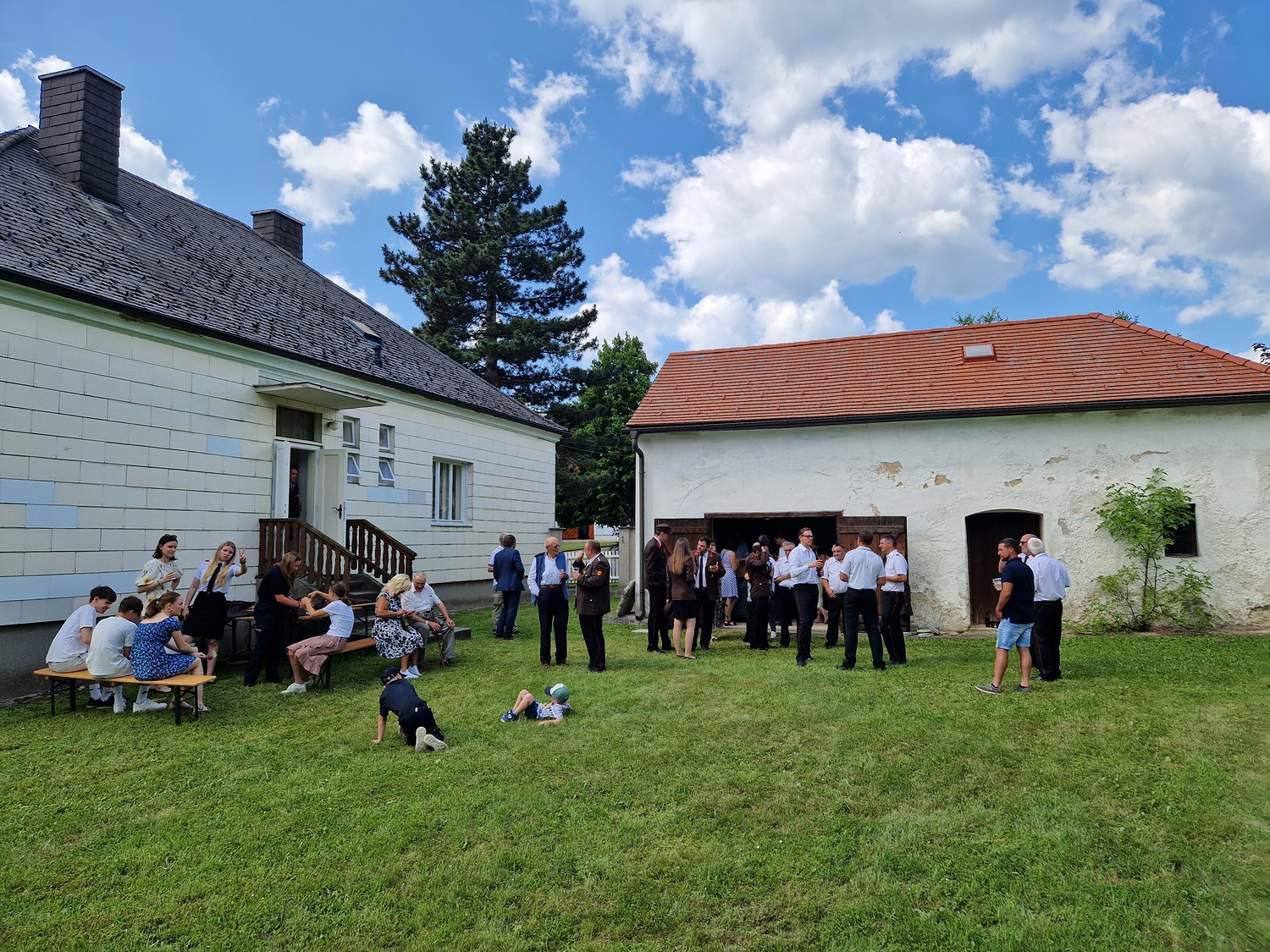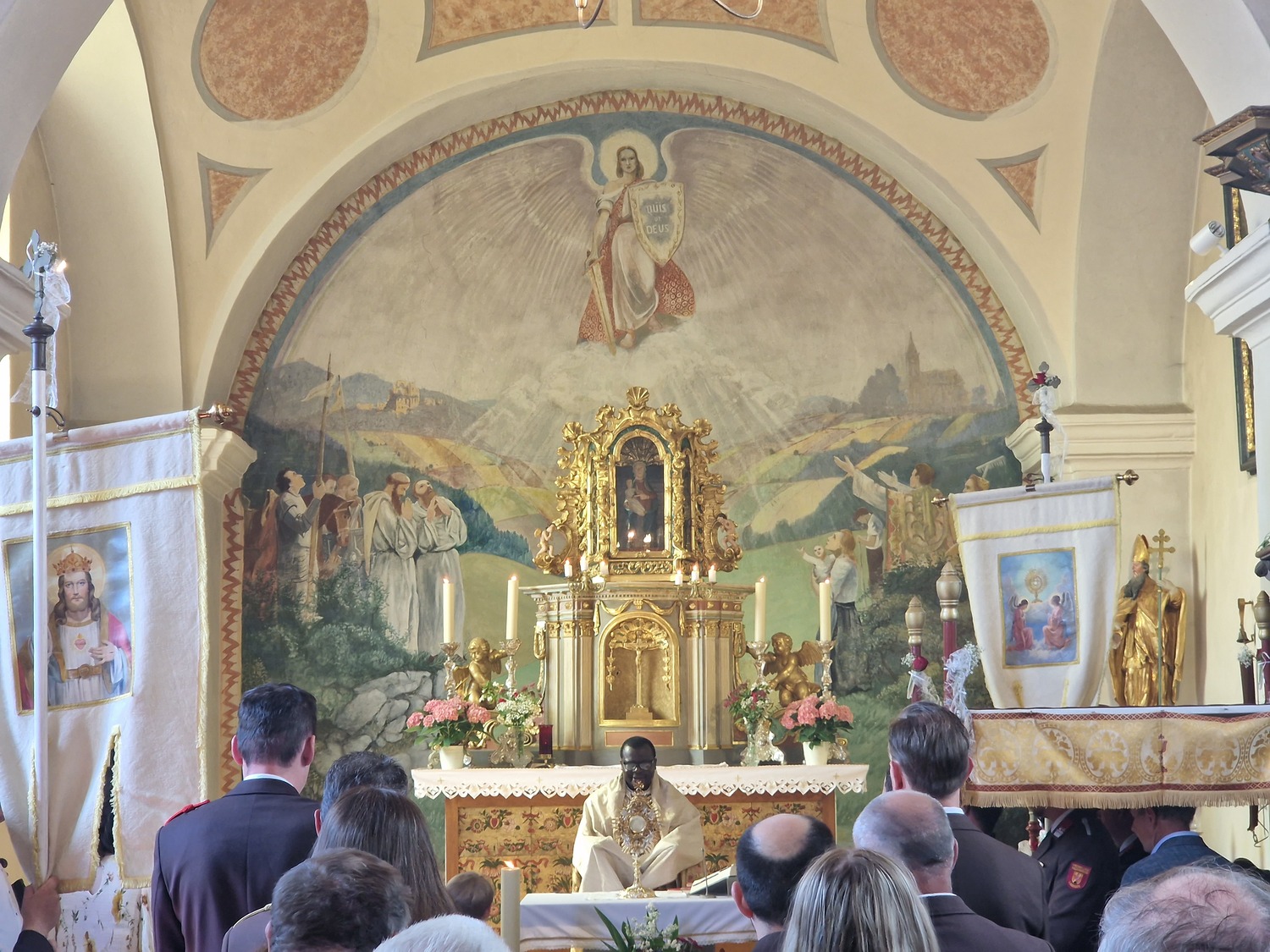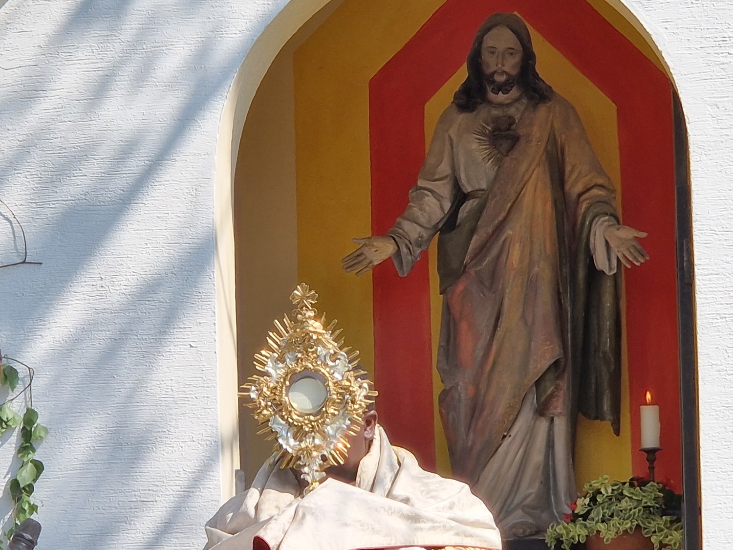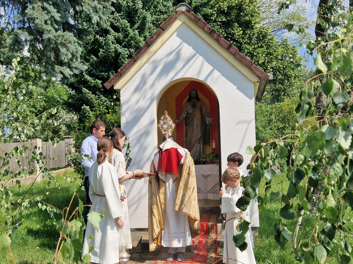 Bei sommerlichen Temperaturen fand nach der Heiligen Messe die Fronleichnamsprozession statt. Die Monstranz wurde durch die Ortschaft getragen und bei zwei Stationen spendete Pfarrer Basil den Eucharistischen Segen.