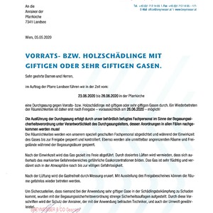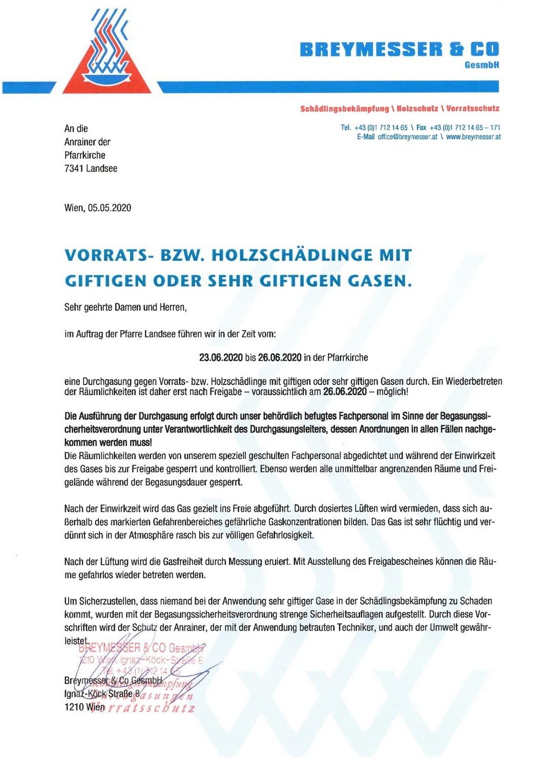 Im Zeitraum vom 23.06. bis 26.06.2020 werden in der Pfarrkirche Holzschädlinge bekämpft. Die Ausführung erfolgt mittels Durchgasung, das Betreten der Kirche in diesem Zeitraum ist verboten.