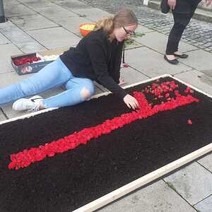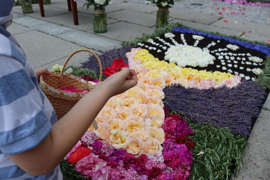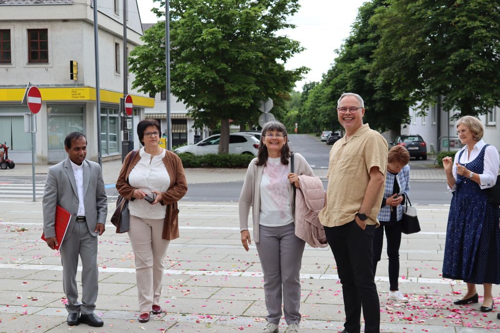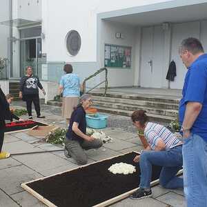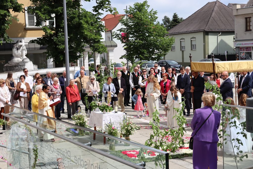Der geschmackvolle Blumenschmuck, die Musik der Stadtkapelle, das Tragen des Himmels von Vertreter:innen des Gemeinderates, das Blumenstreuen und Singen der Kinder und die ausgewählten Texte und Gebete trugen zur feierlichen Atmosphäre bei. Erstmals wurden auf Initiative von Pfarrgemeinderätin Irene Steiger mit Hilfe von den Ministrant:innen und einigen Frauen und Männern zwei wunderbare Blumenteppiche am Kirchenplatz gestaltet.