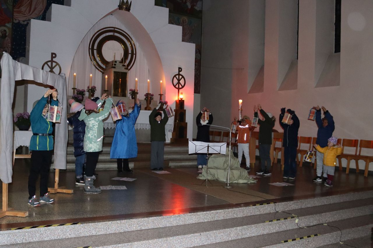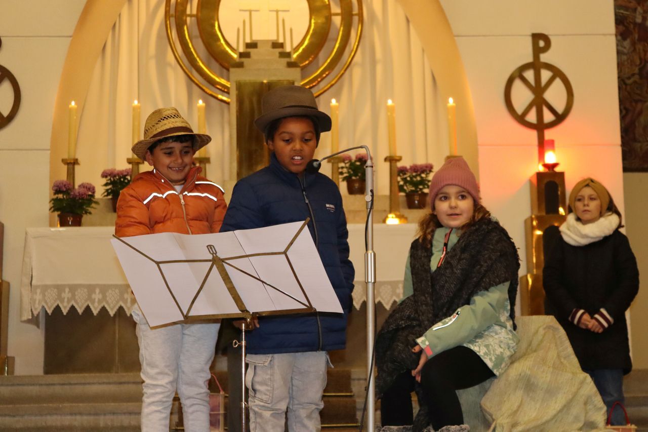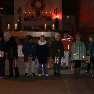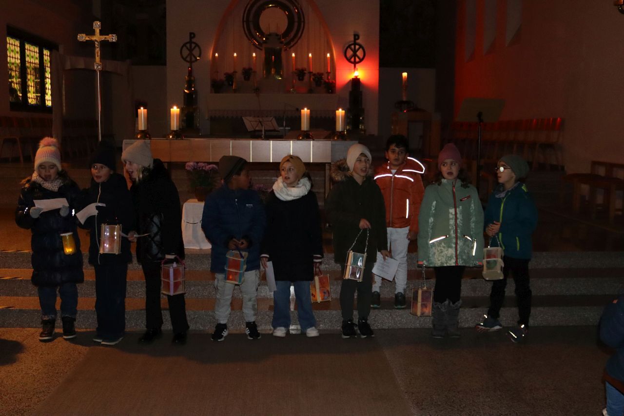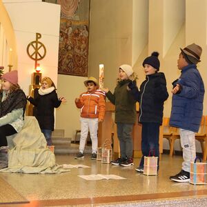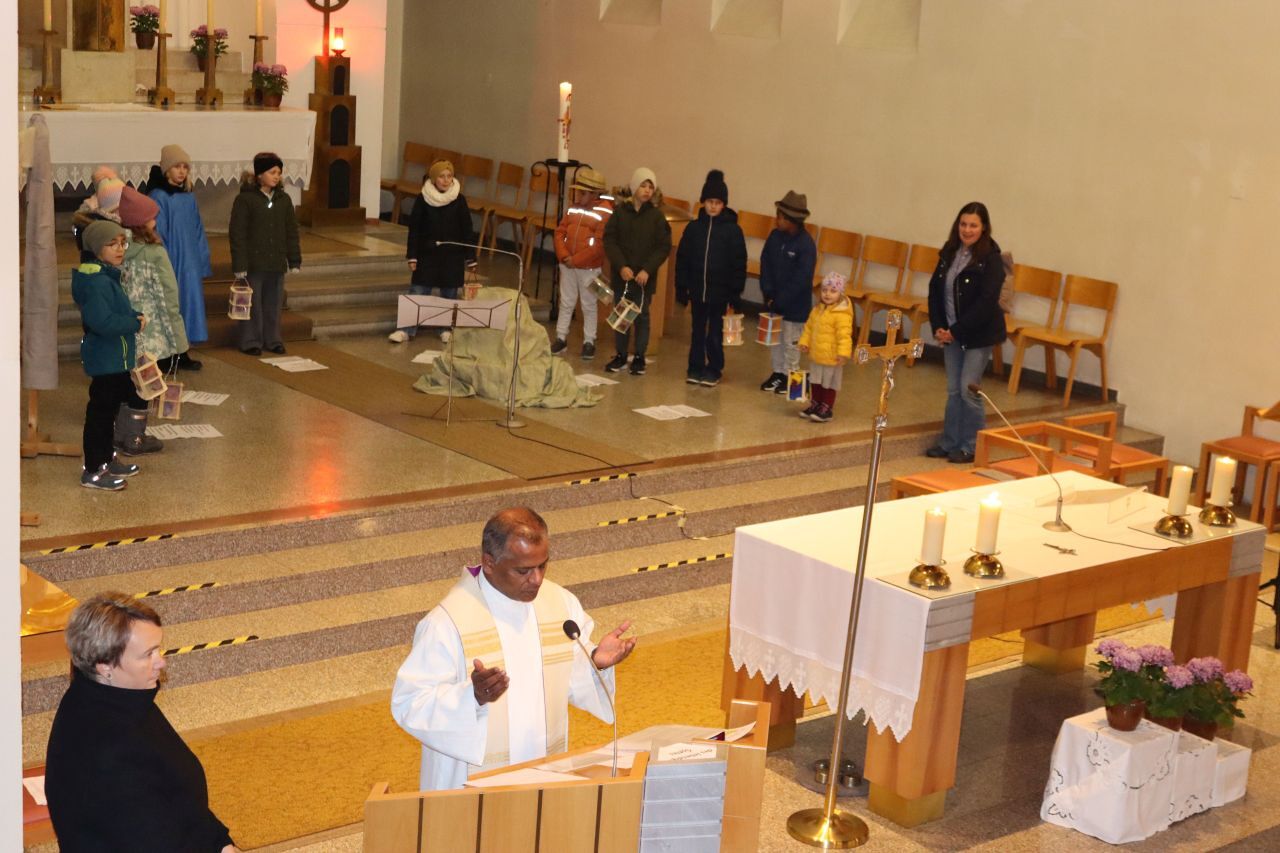 Die Martinsandacht nach dem Laternenzug vom Hauptplatz zur Kirche wurde von den Kindern der Volksschule unter der Leitung der Religionslehrerin Nicole Zagler gestaltet. Mit dem Lied "Ich gehe mit meiner Laterne" zogen die Kinder mit ihren Laternen in die dunkle Kirche ein. Die KInder der dritten Klassen spielten die bis heute beeindruckende Geschichte des Mantelteilens und beim Lichtertanz mit den Laternen brachten die Kinder Licht in die dunkle Kirche und in die Herzen der Mitfeiernden. Zum Abschluss segnete Pater Rayappan alle Kinder und ihre Familien, damit es allen gelinge, immer mehr nach dem Vorbild des Heiligen Martin zu handeln.