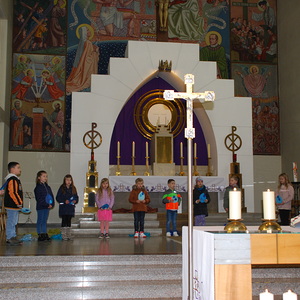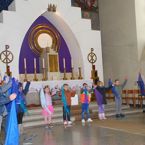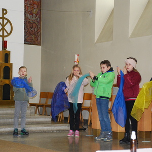14 Kinder machten sich im Gottesdienst Ende Feber auf den Weg zu Jesus, der Quelle des Lebens. In den Texten erinnerten sie die Gläubigen, welche guten Gaben – etwa Frieden, Freude, Hoffnung - aus der Quelle Gottes sprudeln. Die passenden Lieder begleitete die Musikgruppe Arabesque. Geschwister der Erstkommunionkinder verkündeten mit Pater Deiva in einem Spiel das Evangelium von der Verklärung Jesu am Berg Tabor. Die Eltern lasen Fürbitten, Lesung und ein gemeinsames Segensgebet, das die Kinder auch an die Gottesdienstbesucher verteilten. Bravo Kinder! Hoffentlich werden ihr noch öfter Messen in unserer Kirche mitgestalten