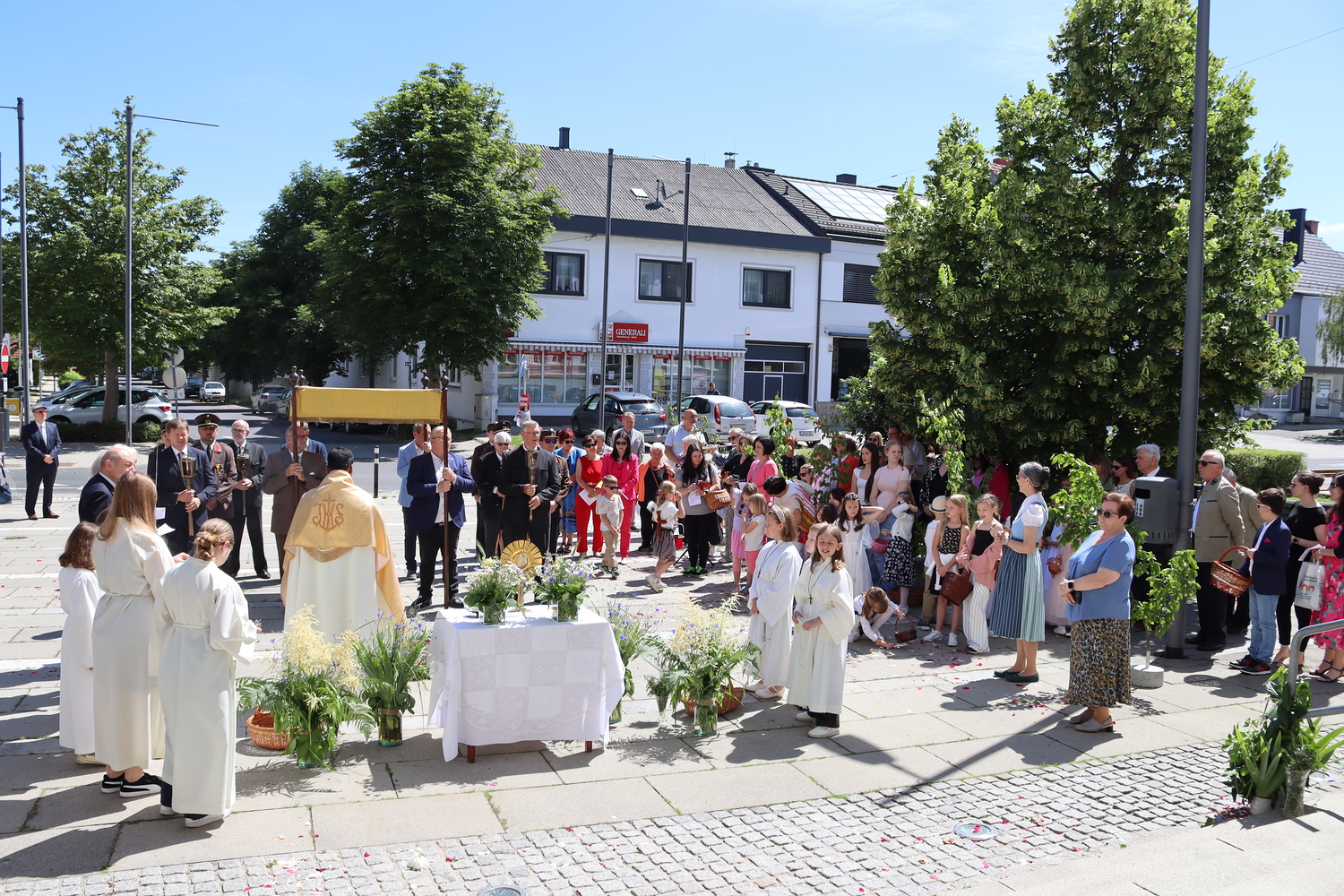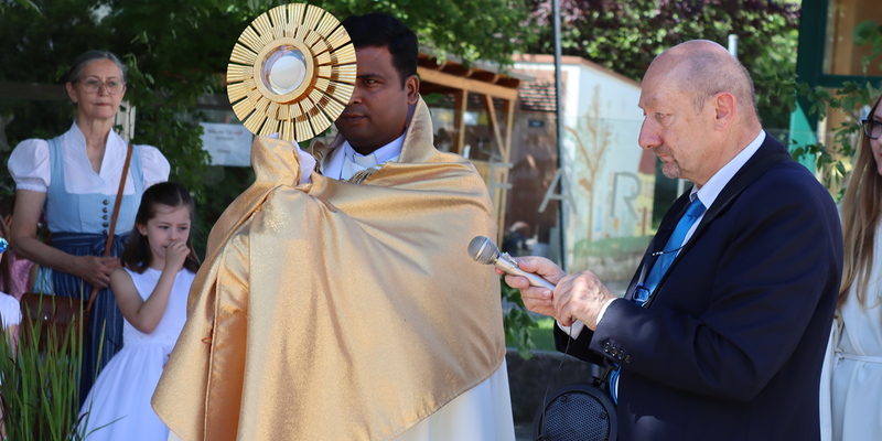 Nach der Messe begann die Prozession mit der konsekrierten Hostie durch Oberpullendorf. Ein Zeichen der Zuwendung Gottes zu Oberpullendorf, unserem Wohn-, Arbeits- und Lebensraum, zur Erde, zur Schöpfung und zur ganzen Wirklichkeit des Lebens. Diese Präsenz Gottes wurde in den Fürbitt- und Segensgebeten besonders zum Ausdruck gebracht.