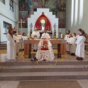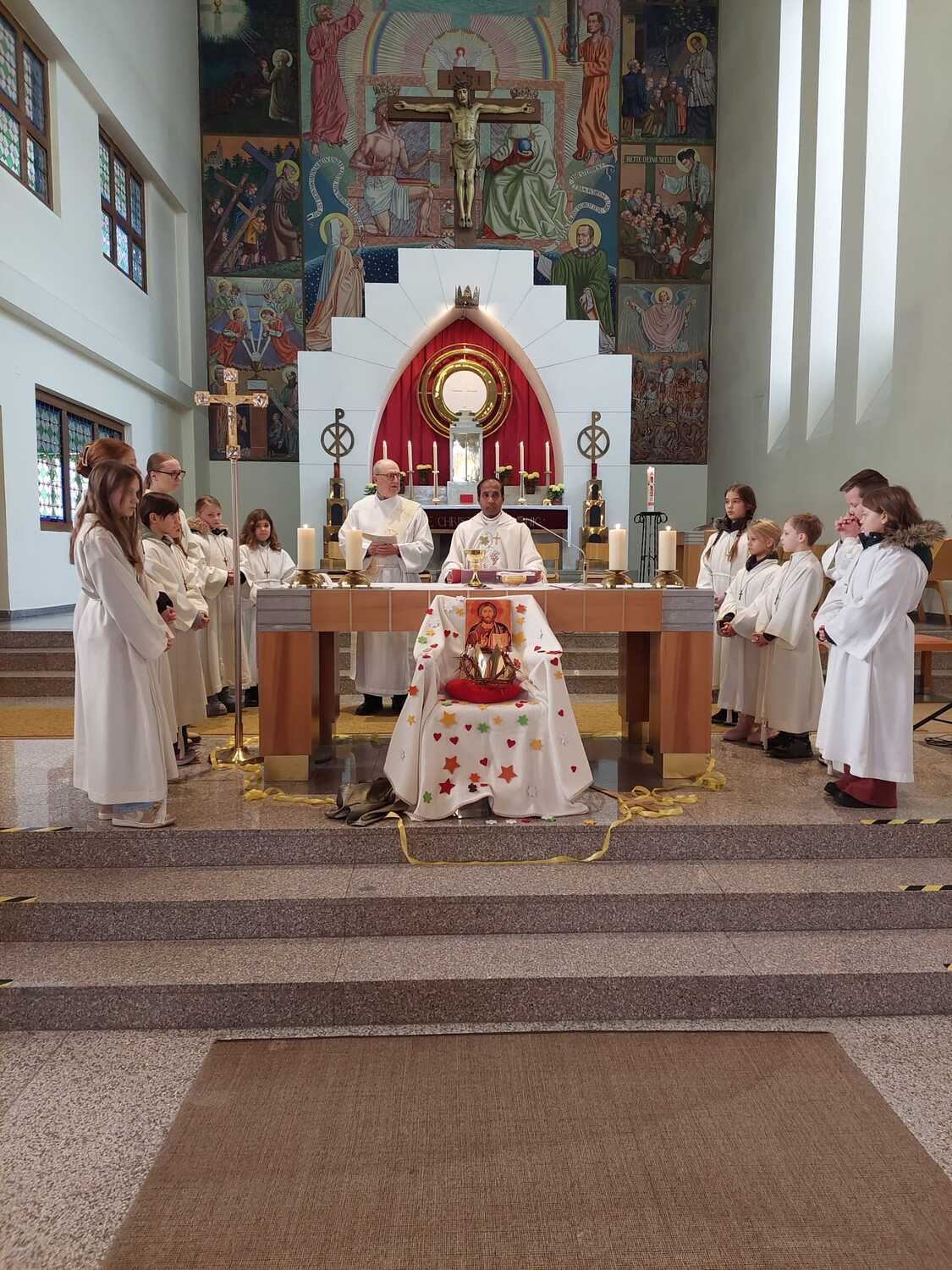 Am Beginn haben die Ministrant:innen Symbole wie ein Herz, einen Dornenkrone oder eine Jesus-Ikone, die an Christus als König erinnern, auf einen Thron vor den Altar gelegt.