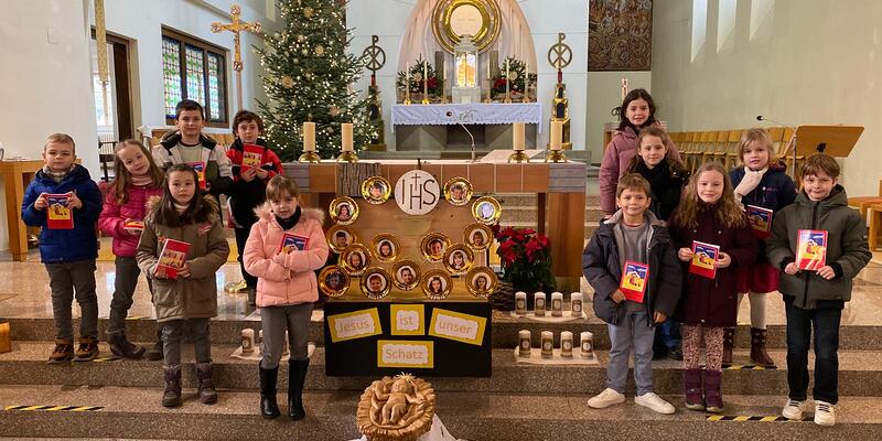 Dieses Motto haben unsere 15 Erstkommunionkinder als Thema ihrer Vorbereitung auf die Erstkommunion 2025 gewählt. Die Pfarre feierte am 12. Jänner bei ihrer Vorstellung mit. Trotz kurzer Probenzeit konnten die Kinder ihre Texte und Lieder super vortragen und singen. Die selbst gebastelten Kerzen und die von den Eltern gestaltete Schatzkiste glänzten dazu. Pater Deiva bezeichnete auch die Kinder selbst als Schatz für die Zukunft der Pfarre und wünschte viel Freude und Gottes Segen für die kommende Zeit. Am 29. Mai werden die Kinder den „Schatz“ Jesus empfangen dürfen. Wir alle freuen uns darauf!