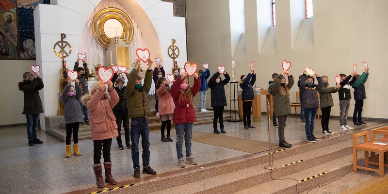 Am 27. Feber stellten sich die 22 Kinder (mittlerweile ist noch ein Kind dazugekommen) freudig aufgeregt der Pfarrgemeinde vor. Sie sangen und tanzten mit ihren bunten Herzen voll Begeisterung „Kinderherzen sind groß“ und andere schwungvolle Lieder, denn mit dieser Messe begann endlich die Vorbereitung auf die Erstkommunion. Im Evangelium hieß es auch: „Wovon das Herz überfließt, davon spricht der Mund.“ Pater Maria teilte an alle „Schatzkisten“ mit Kinderbibeln aus, die den Kindern das Leben Jesu und seine Liebe näher bringen sollen. Besonders schön, dass sich auch viele Geschwister und Eltern beim Lesen, Kerzen gestalten und Symbol anfertigen einbrachten: ein großer Kelch mit Hostie und Ähren trägt die Fotos aller Kinder. Zum Schluss der Messe bat jedes Kind die Gläubigen mit Gebetsherzen um ihr Gebet für die kommende Zeit.