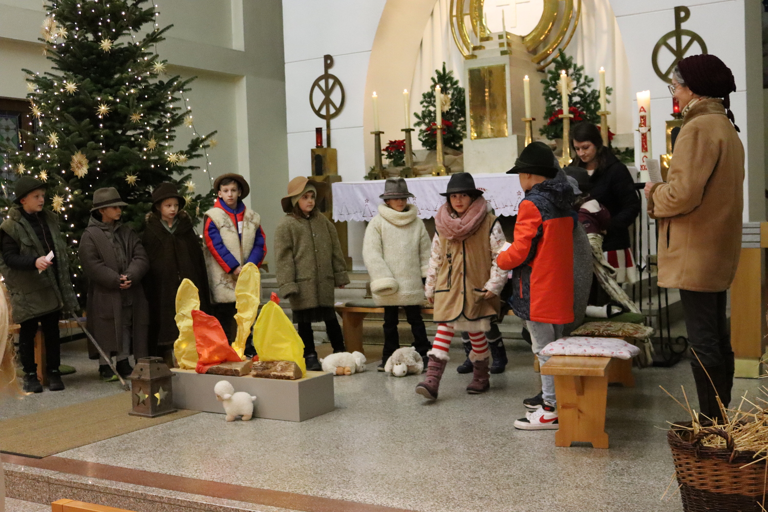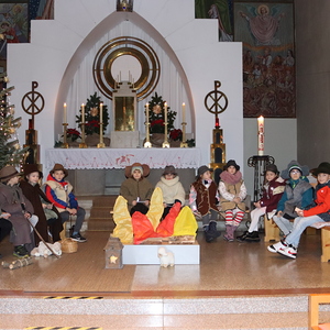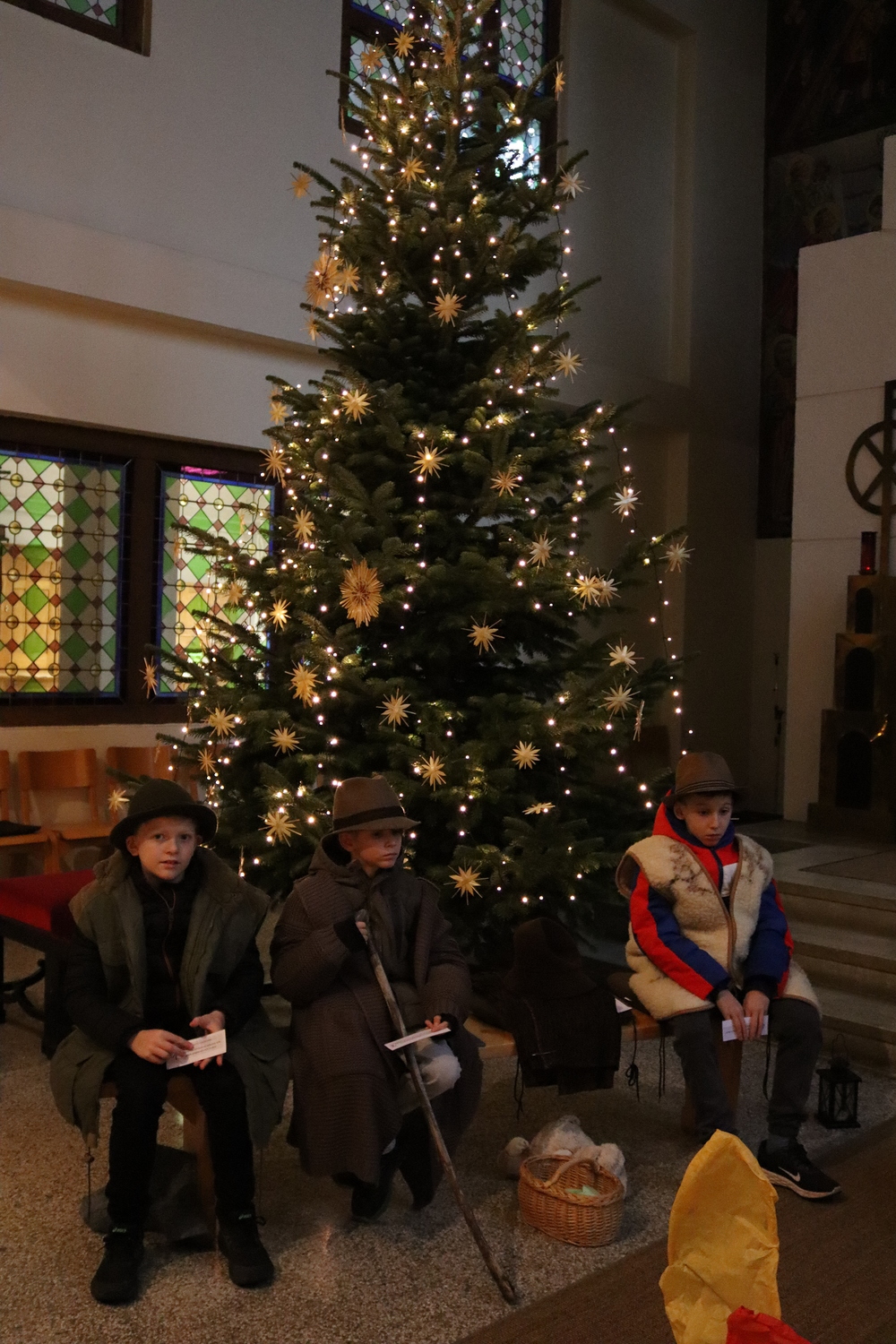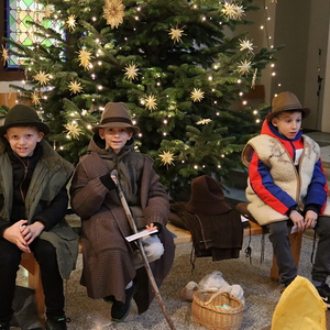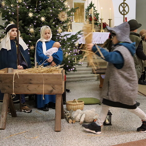 Ganz besonders viel Mühe gaben sich die Kinder am Heiligen Abend in der Kindermette. Sie verkündeten zusammen mit Pater Deiva das Evangelium von den Hirten, die auf den Feldern bei Betlehem sonderbare Zeichen und sogar Engel sehen. Die armen Hirten erzählten den Gottesdienstbesuchern, was sie in jener Nacht bewegte und wie sie Maria und Josef und das göttliche Kind fanden. Zu den Fürbitten legten sie Stroh in die Krippe, als Symbol für alles Armselige, scheinbar Wertlose, das Gott durch sein Wirken verwandeln kann. Die Musik von Arabesque machte die ganze Messe feierlich und stimmungsvoll, besonders als zum Schluss alle gemeinsam in der verdunkelten Kirche mit dem schönen, leuchtenden Christbaum das "Stille Nacht" anstimmten.