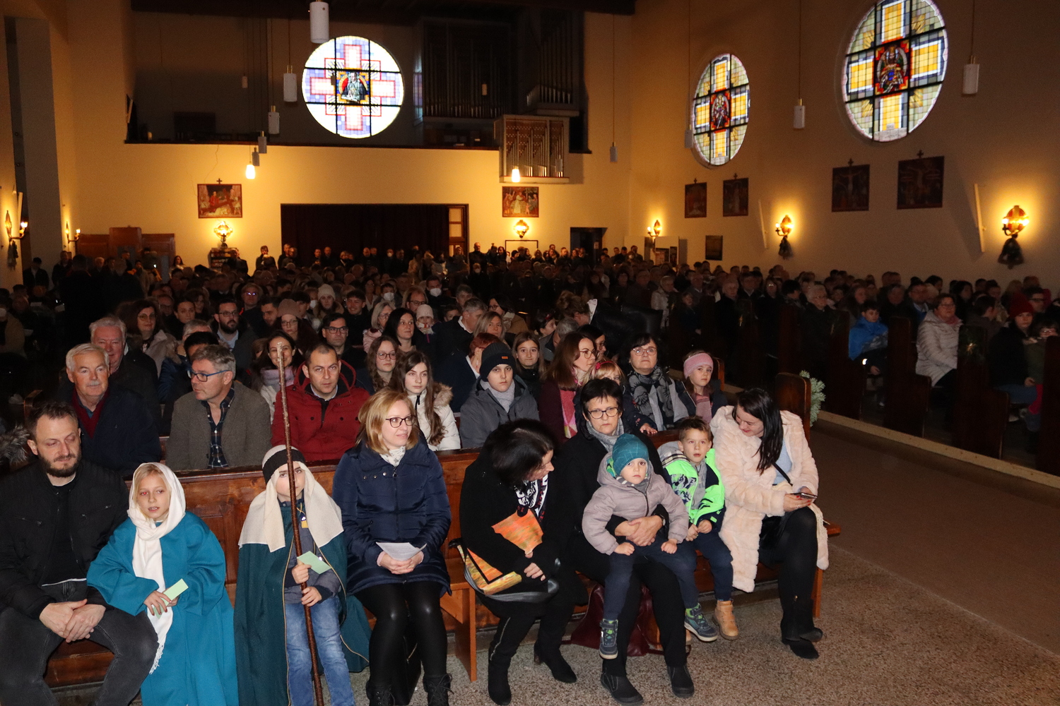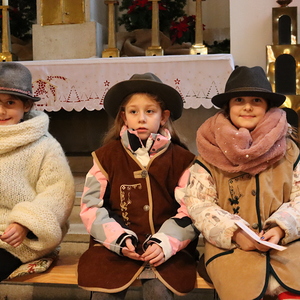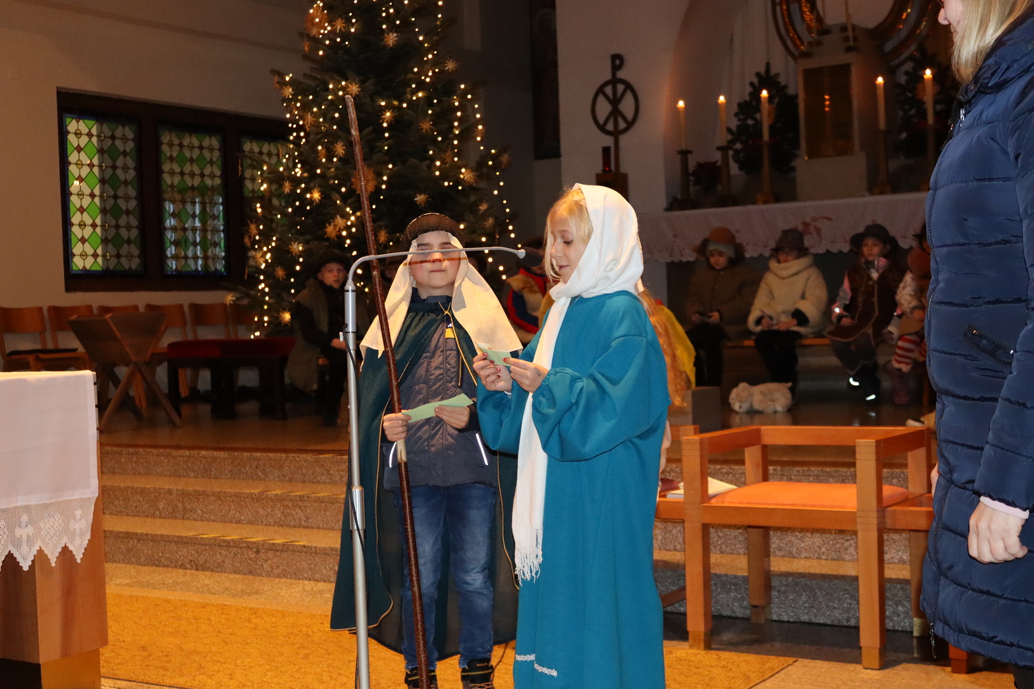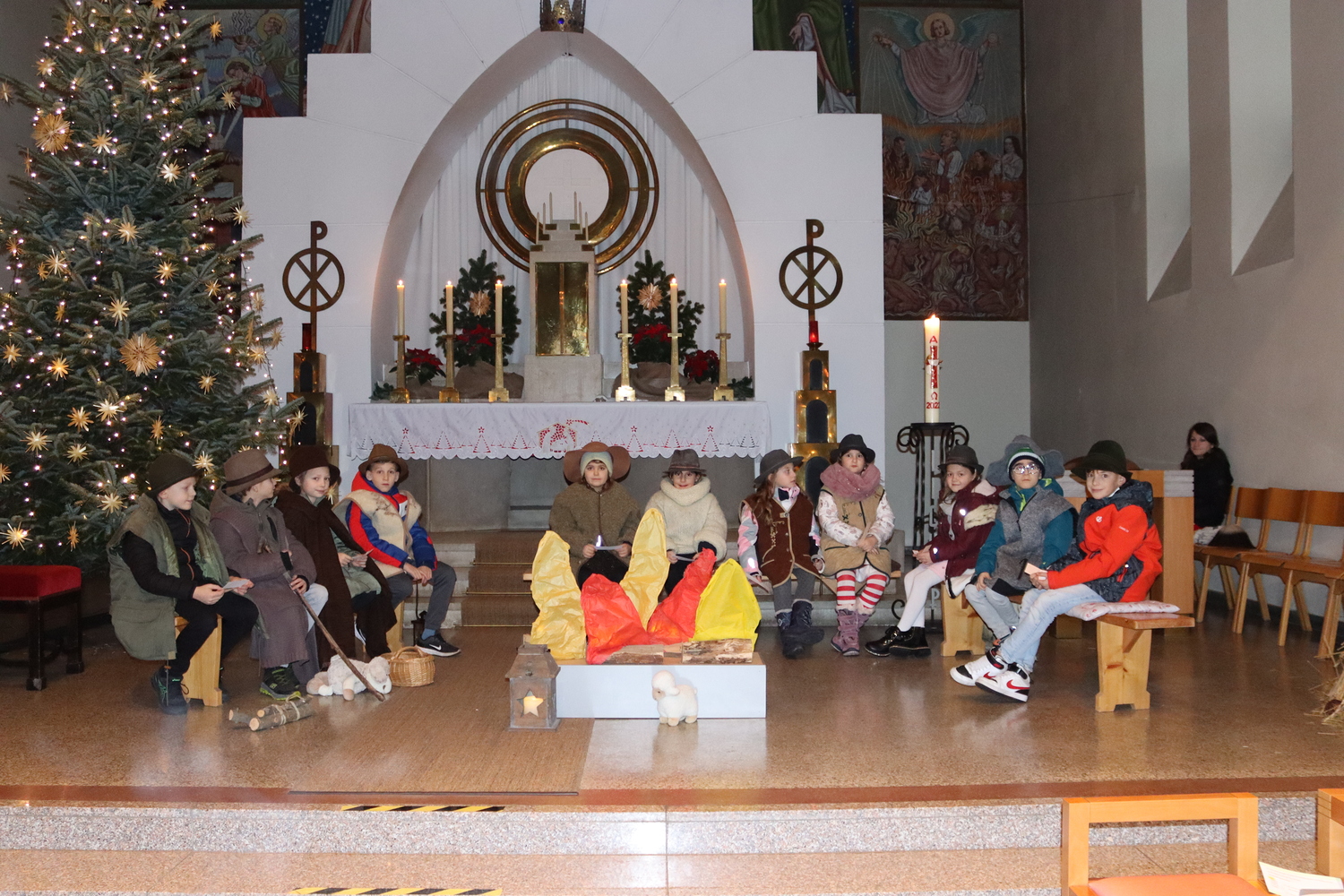 Ganz besonders viel Mühe gaben sich die Kinder am Heiligen Abend in der Kindermette. Sie verkündeten zusammen mit Pater Deiva das Evangelium von den Hirten, die auf den Feldern bei Betlehem sonderbare Zeichen und sogar Engel sehen. Die armen Hirten erzählten den Gottesdienstbesuchern, was sie in jener Nacht bewegte und wie sie Maria und Josef und das göttliche Kind fanden. Zu den Fürbitten legten sie Stroh in die Krippe, als Symbol für alles Armselige, scheinbar Wertlose, das Gott durch sein Wirken verwandeln kann. Die Musik von Arabesque machte die ganze Messe feierlich und stimmungsvoll, besonders als zum Schluss alle gemeinsam in der verdunkelten Kirche mit dem schönen, leuchtenden Christbaum das "Stille Nacht" anstimmten.
