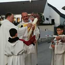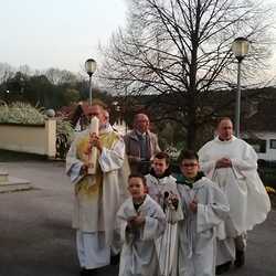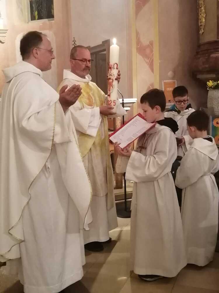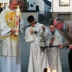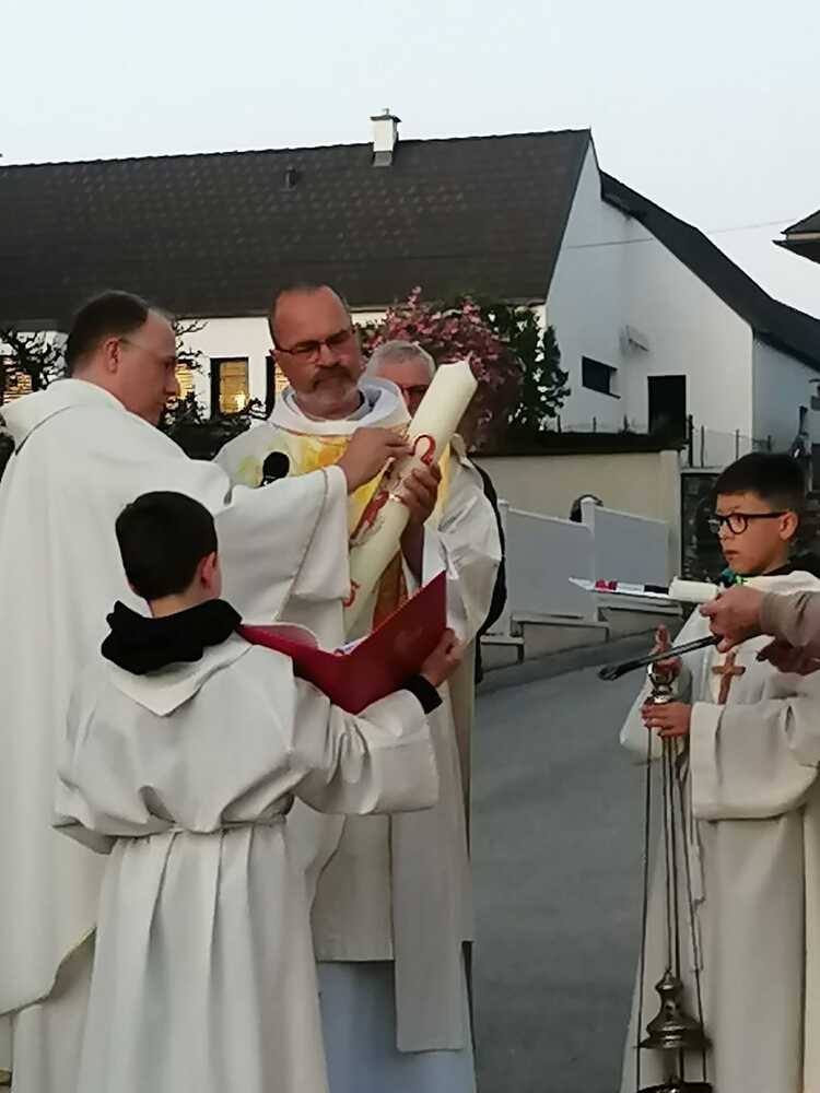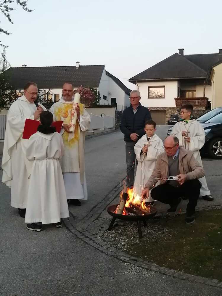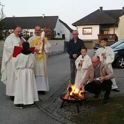 Am Karsamstag feierten Kaplan Andreas Gold und Diakon Rudolf Exel gemeinsam in der Pfarre Grafenschachen die Osternacht. Beginn der Liturgie war beim Osterfeuer vor der Kirche, wo auch die neue Osterkerze entzündet wurde.