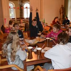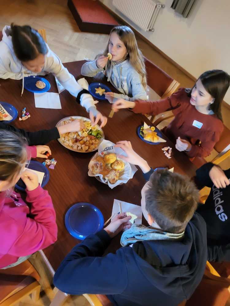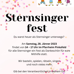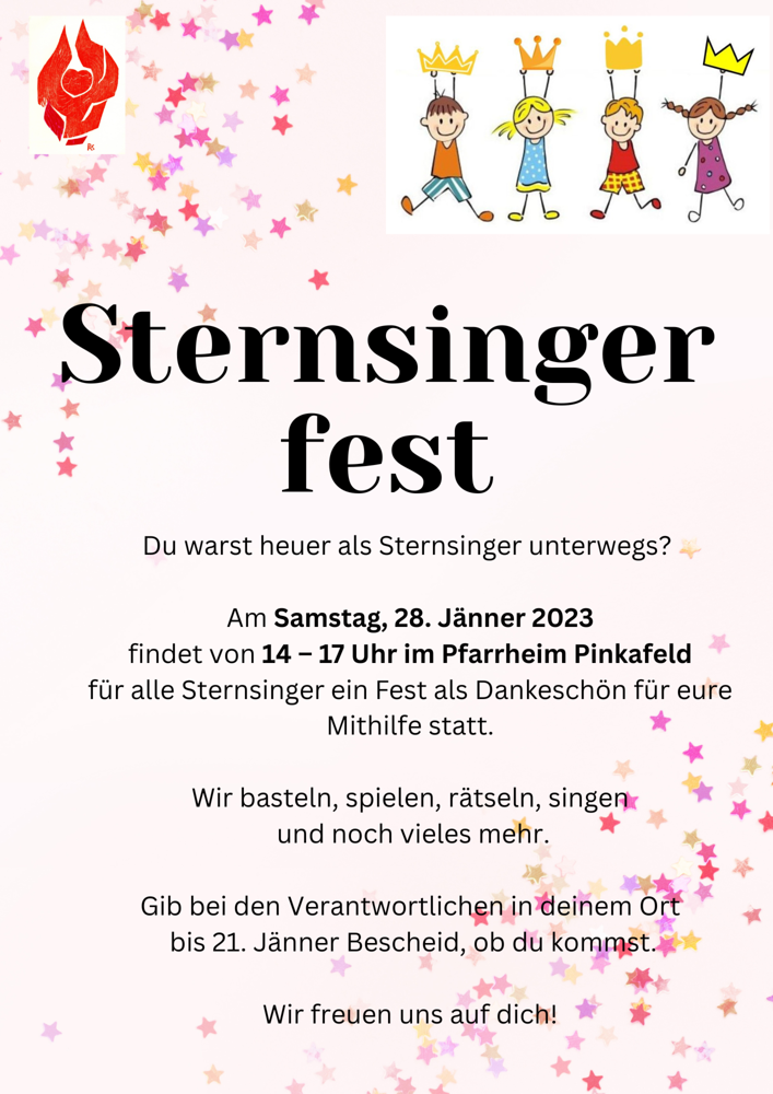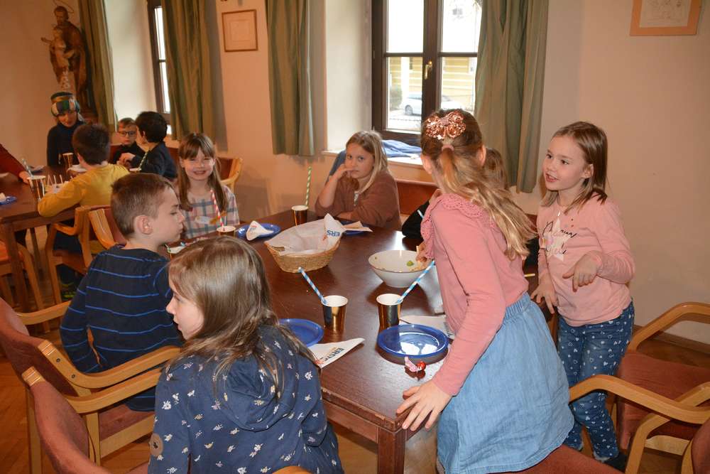 Am Samstag, 28. Jänner 2023 fand für alle Sternsingerkinder aus den Pfarren Grafenschachen, Kitzladen und Pinkafeld samt den Filialen ein Fest als Dankeschön für ihr Engagement statt. Zu Beginn tanzte Stephanie Reitlinger mit den Kindern zur Aufwärmung. Anschließend bastelten, kochten und spielten die Kinder in drei Gruppen bei den drei Stationen. Nach der Jause konnten sich die Kinder im "Pfarrheimkino" entspannen, bevor es Gemeinschaftsspiele gab. Ein letztes Mal dieses Jahr durften sich die Königinnen und Könige verkleiden und zogen gemeinsam mit Pfarrer Norbert Filipitsch in die Kirche ein, wo es eine kurze Andacht gab.