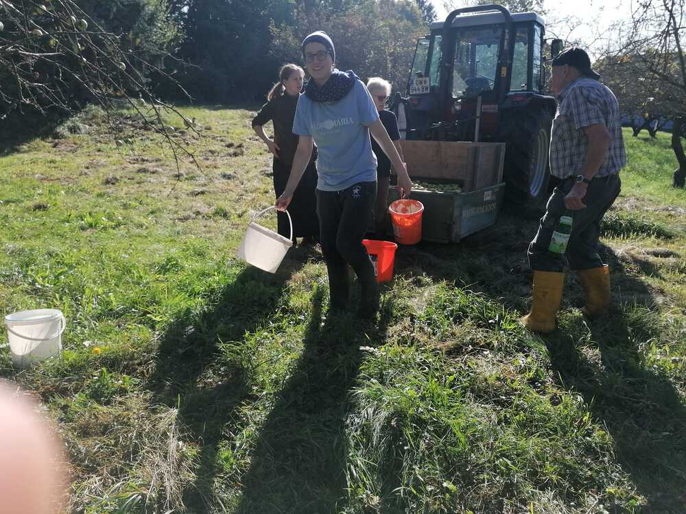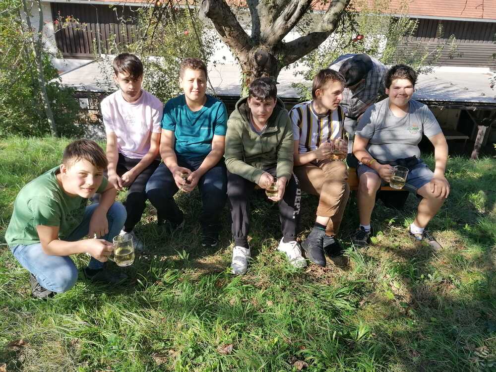 Die diesjährige Apfelernte fand wieder mit vielen fleißigen Händen statt. Herbert Rosner und Herbert Loidl freuten sich über die Unterstützung von Milli Köberl, von Tatjana, Julia und Anastasia von der Gemeinschaft des Vaters, sowie über die Hilfe der Förderklasse der VS Pinkafeld mit der Klassenlehrerin Julia Wagner und der BSA Susi. Die tüchtigen ErntehelferInnen erhielten zum Abschluss eine kräftige Jause von Heidi Posch.