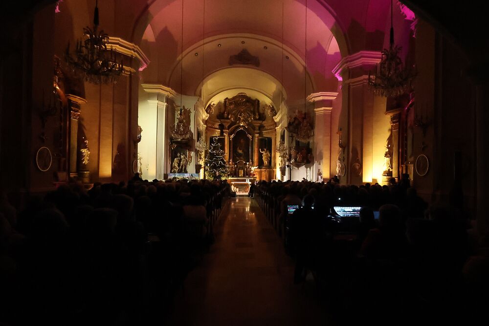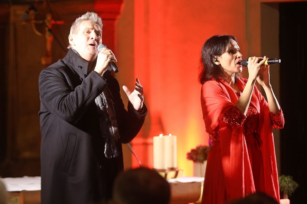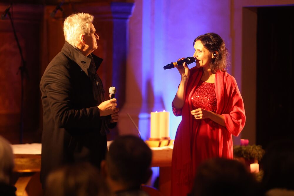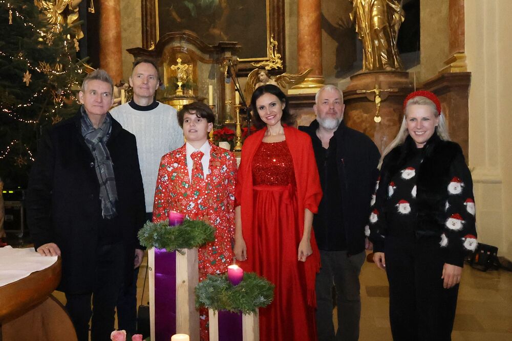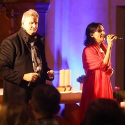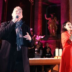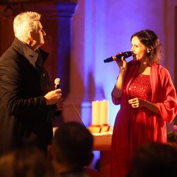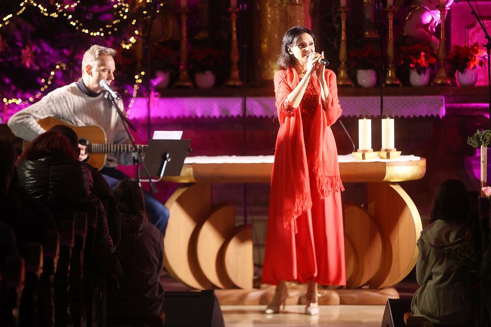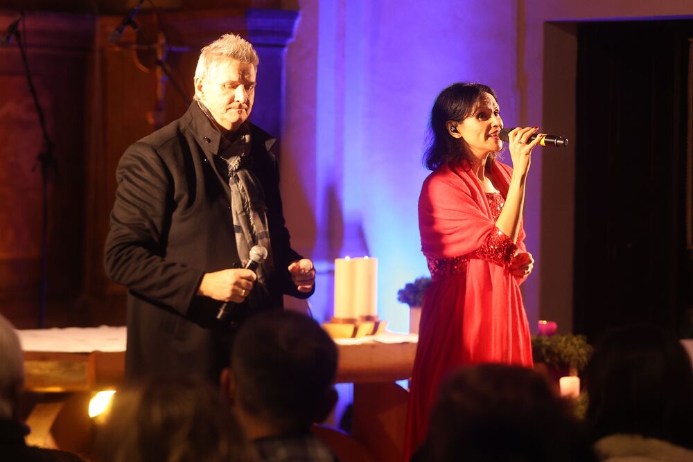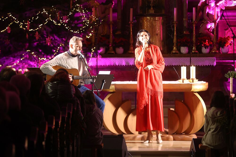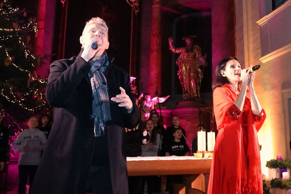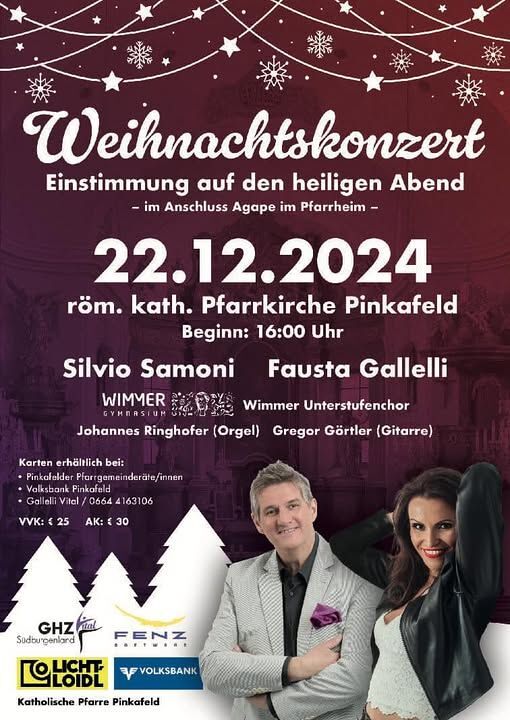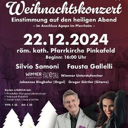 Sänger Silvio Samoni und die Pinkafelder Sängerin Fausta Gallelli konnten mit ihren Liedern am Sonntag vor Weihnachten die vielen Besucherinnen und Besucher in der röm.-kath. Pfarrkirche Pinkafeld auf den Heiligen Abend einstimmen. Begleitet wurden sie dabei vom Unterstufenchor des Wimmer Gymnasiums Oberschützen und von Johannes Ringhofer an der Orgel sowie Gregor Görtler an der Gitarre.