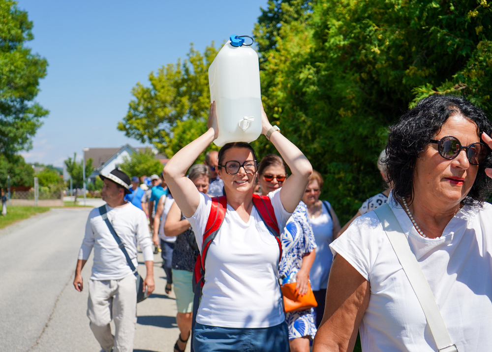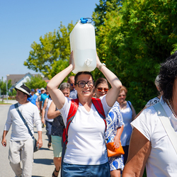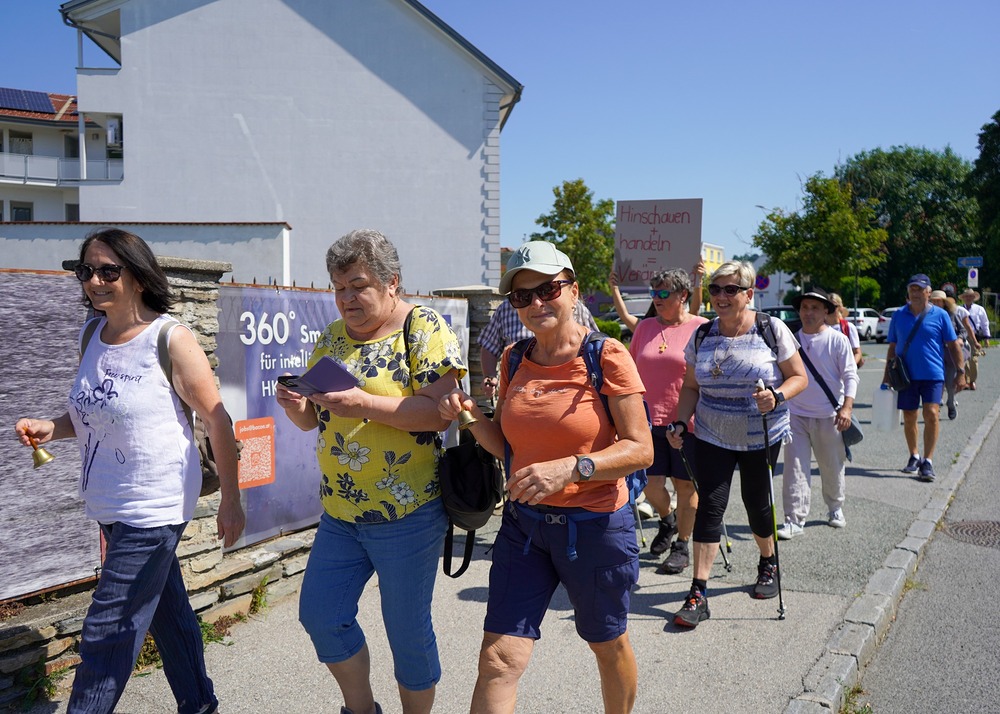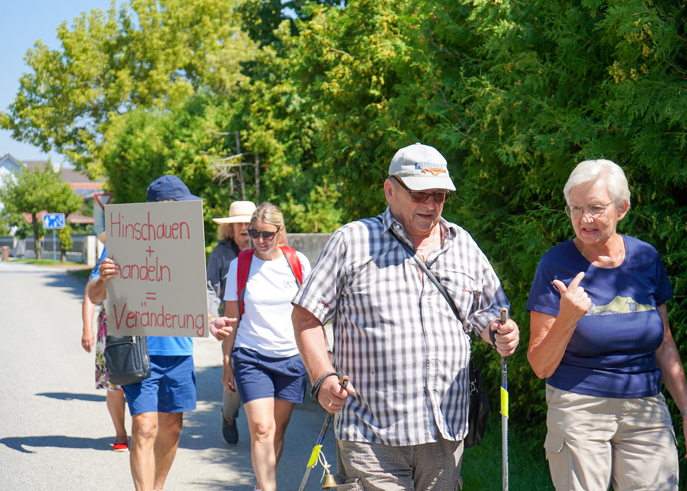 Über 2,3 Milliarden Menschen haben weltweit keinen sicheren Zugang zu Nahrung, 733 Millionen hungern. Diesem Trend versucht die Caritas entgegenzuwirken. Doch es kann nur etwas verändert werden, wenn die Not und der Hunger auch gesehen werden. Deshalb sollen im Juli besonders die beiden Aktionen „Wandern gegen den Hunger“ und „Glockenläuten gegen den Hunger“ auf die vielen Hungernden aufmerksam machen. Den Beginn machte am Montag, 21. Juli, „Wandern gegen Hunger“ bei uns in Pinkafeld. Engagierte und Vertreter*innen der Caritas wanderten Montagvormittag vom Hauptplatz zum Kalvarienberg. Ein Weg als Symbol für die bis zu 10 Kilometer, die Kinder im Südsudan täglich zurücklegen müssen, nur um die Schule besuchen und eine nahrhafte Mahlzeit bekommen zu können. Staubige Hitze während der Trockenperiode und Sumpfgebiet während der Regenzeit erschweren diesen Weg zusätzlich. Trinkwasser ist dabei alles andere als selbstverständlich und muss meist weit mitgetragen werden. Deshalb wurde auch in Pinkafeld ein 10-Liter-Kanister Wasser mitgetragen. Zudem machten Glocken und Plakate auf die Anliegen des Wanderns aufmerksam.