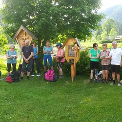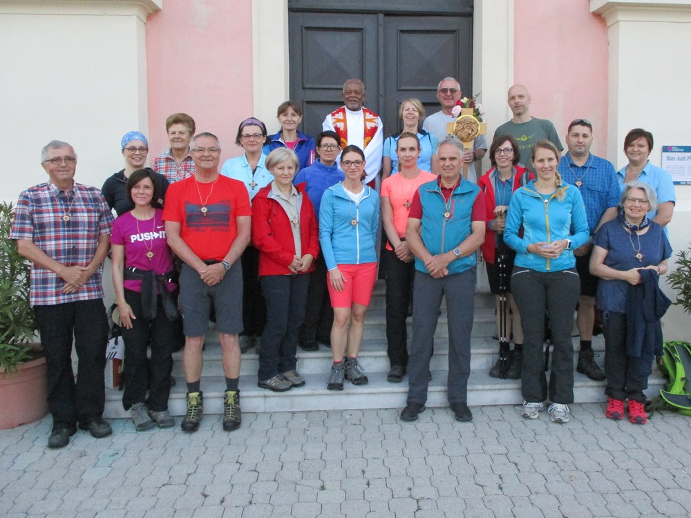Nach dem Reisesegen von Pfarrer Dr. Peter Okeke machten sich zwanzig Frauen und Männer am Samstag, dem 8. Juni 2019, auf den Weg nach Mariazell. Josef Reithofer hat für die Gruppe Kreuze geschnitzt, die nun bei jeder Wallfahrt dabei sein werden.