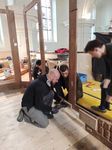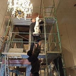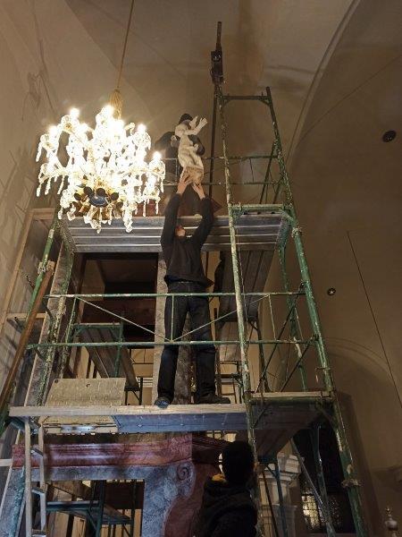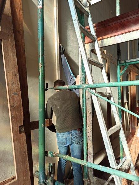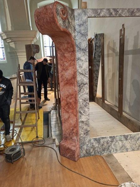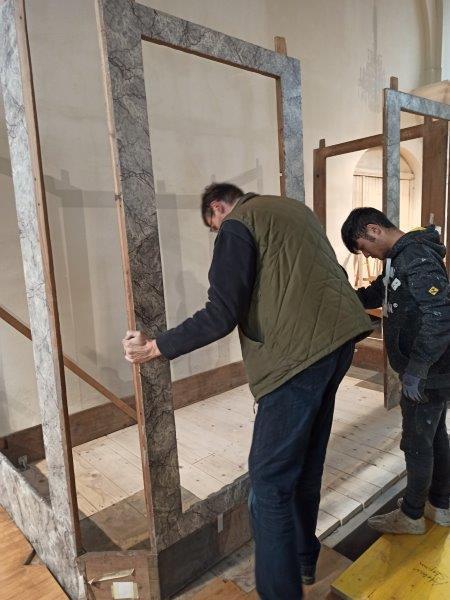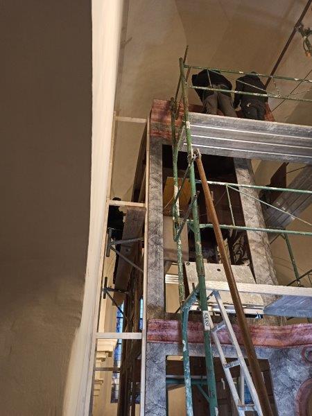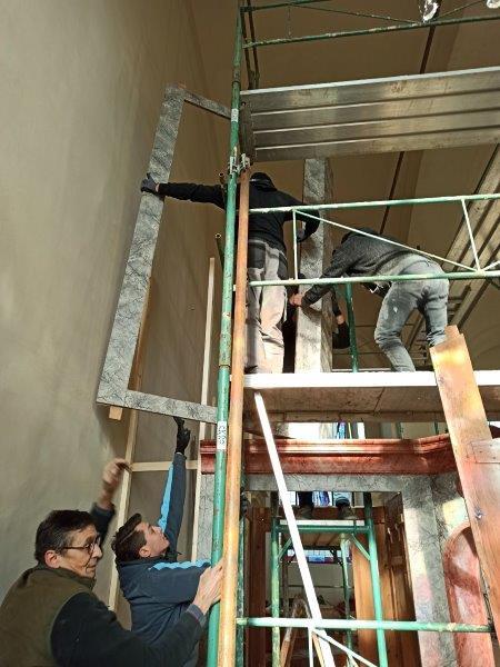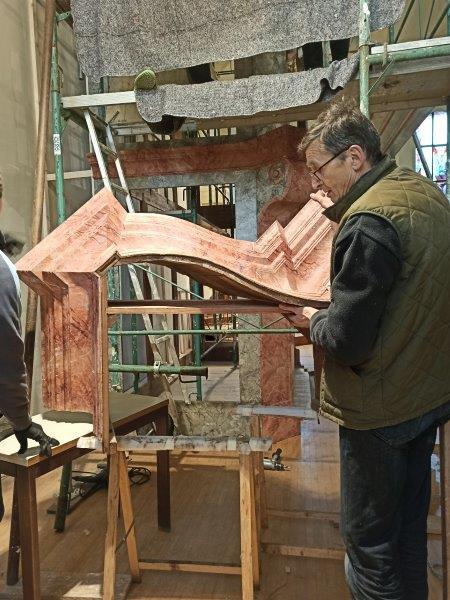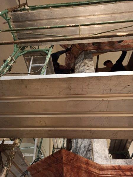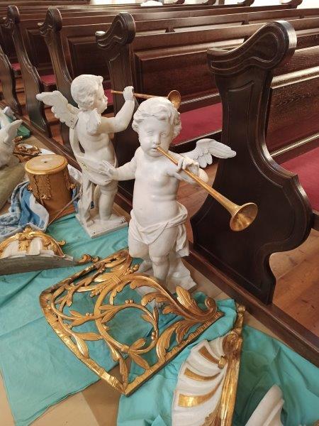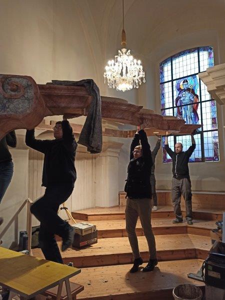 Das Orgelgehäuse steht. Die Putten mit ihren Instrumenten in luftiger Höhe sind montiert, die Schleierornamente angebracht. Seit Mitte Dezember können wir ein wunderschön restauriertes Gehäuse in der ursprünglichen Farbgebung bewundern.