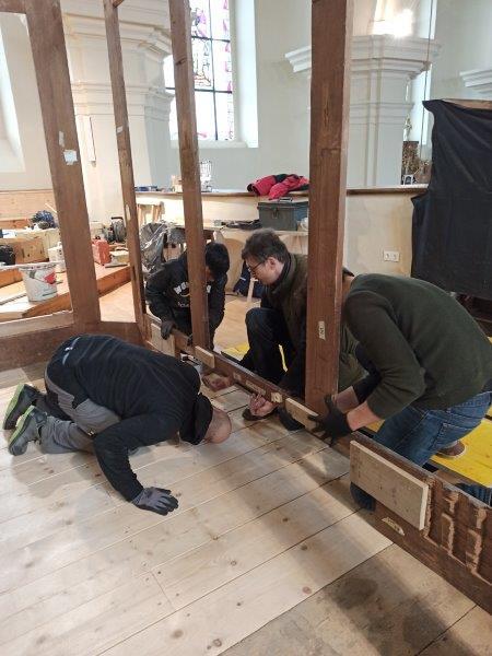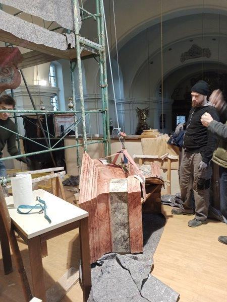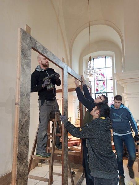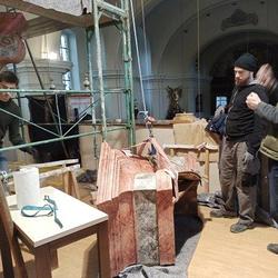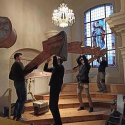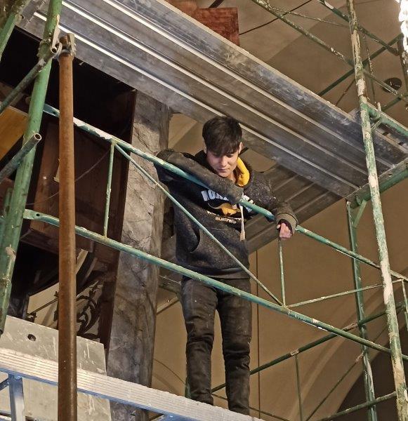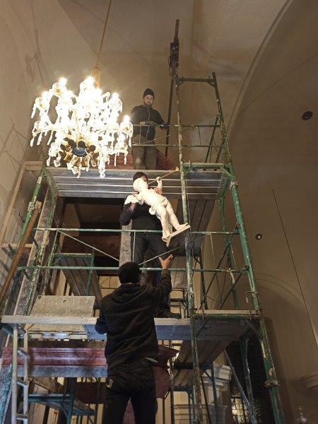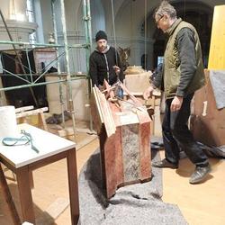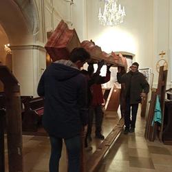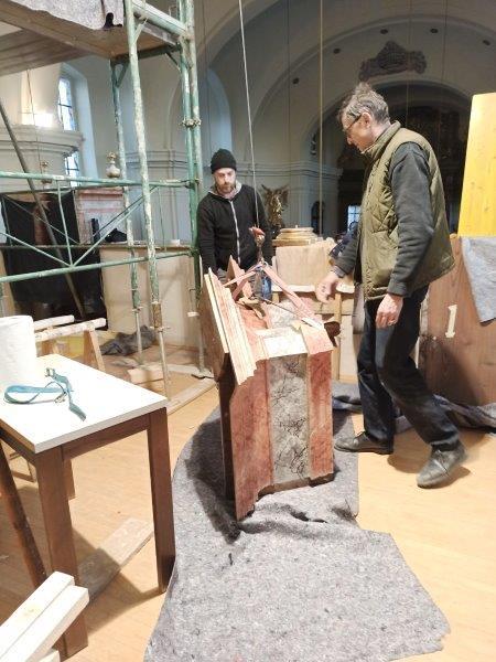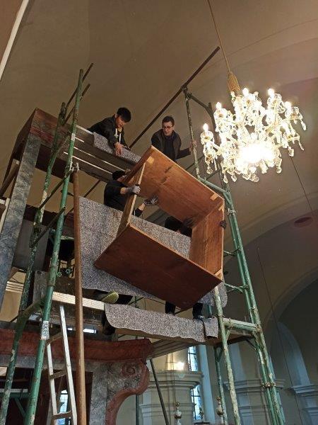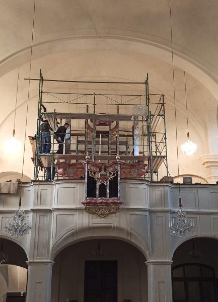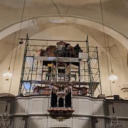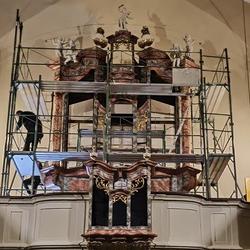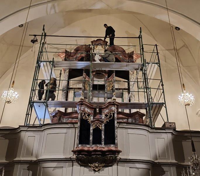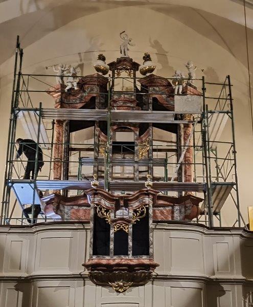 Die Aufbauarbeiten des restaurierten Orgelgehäuses in unserer Pfarrkirche haben am Montag der ersten Adventwoche, am 30. November 2020, begonnen. In der dritten Adventwoche erfolgte der Abbau des Gerüsts, wurden die Seitentüren eingehängt und Ornamente auf der Vorderseite montiert. Nach einer notwendigen Trocknung der angebrachten Retusche muss noch gefirnist werden. Der Anbau an das Gehäuse und das Rückpositiv können fertiggestellt werden, wenn die Orgel eingebaut ist.