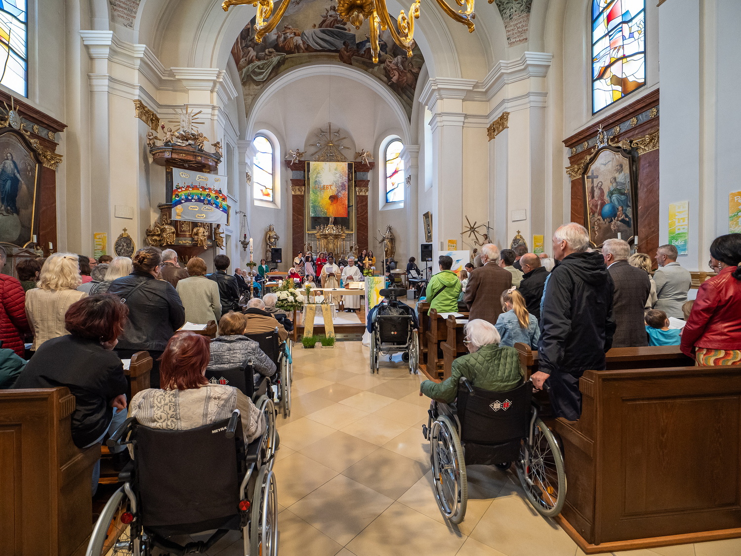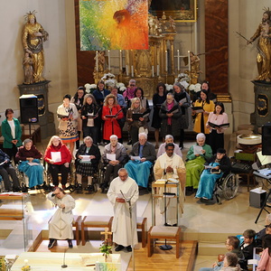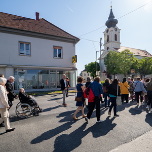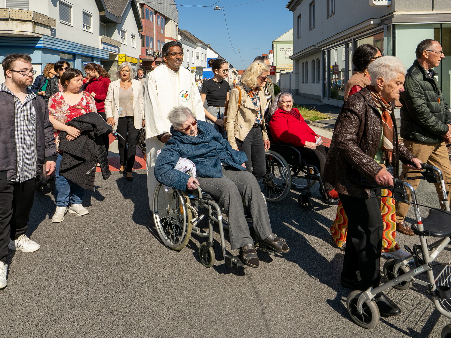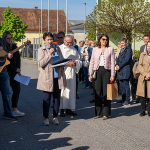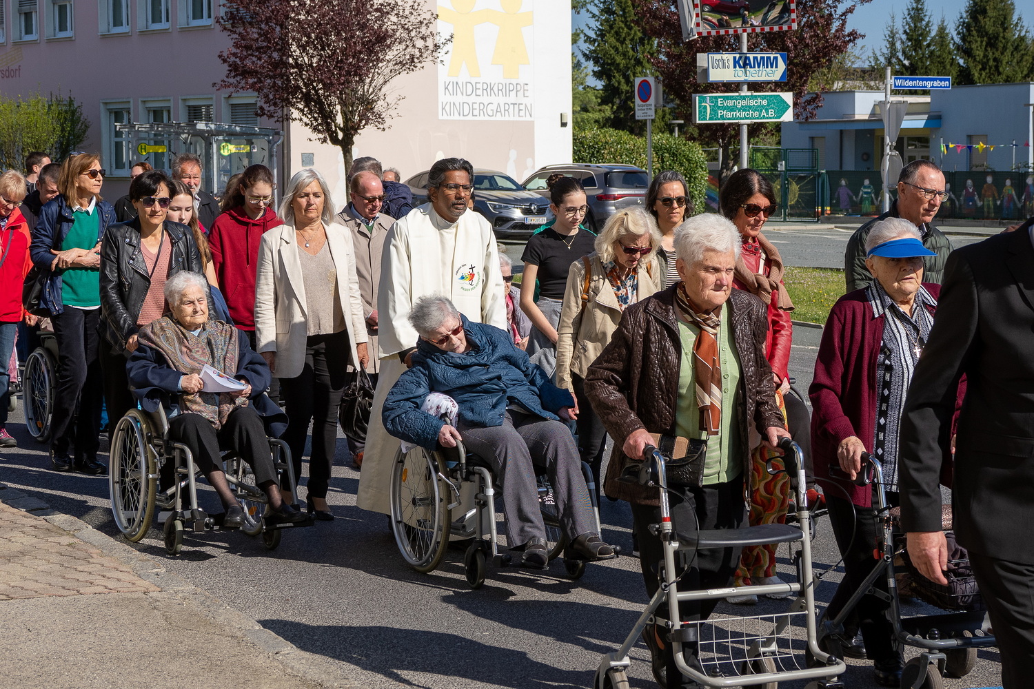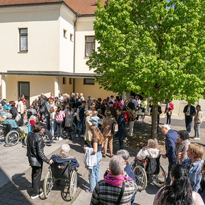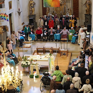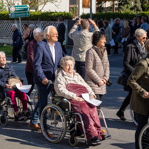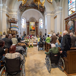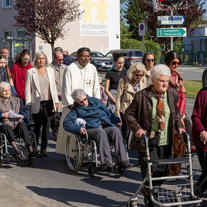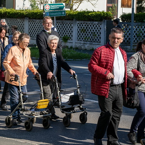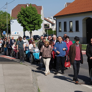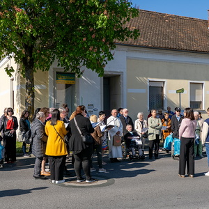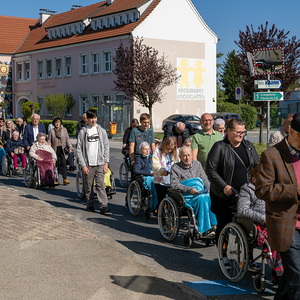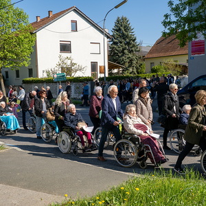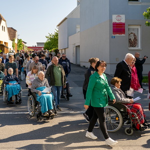 Am Sonntag, 27.04.2025 frühmorgens pilgerte eine große Menschenschar gemeinsam mit mehr als 30 Rollstuhlfahrerinnen und Fahrern bei herrlichem Sonnenschein singend und betend vom Pflegekompetenzzentrum Großpetersdorf in die römisch-katholische Pfarrkirche, die für die Pilgerschar an diesem Tag zur Wallfahrtskirche erklärt wurde.