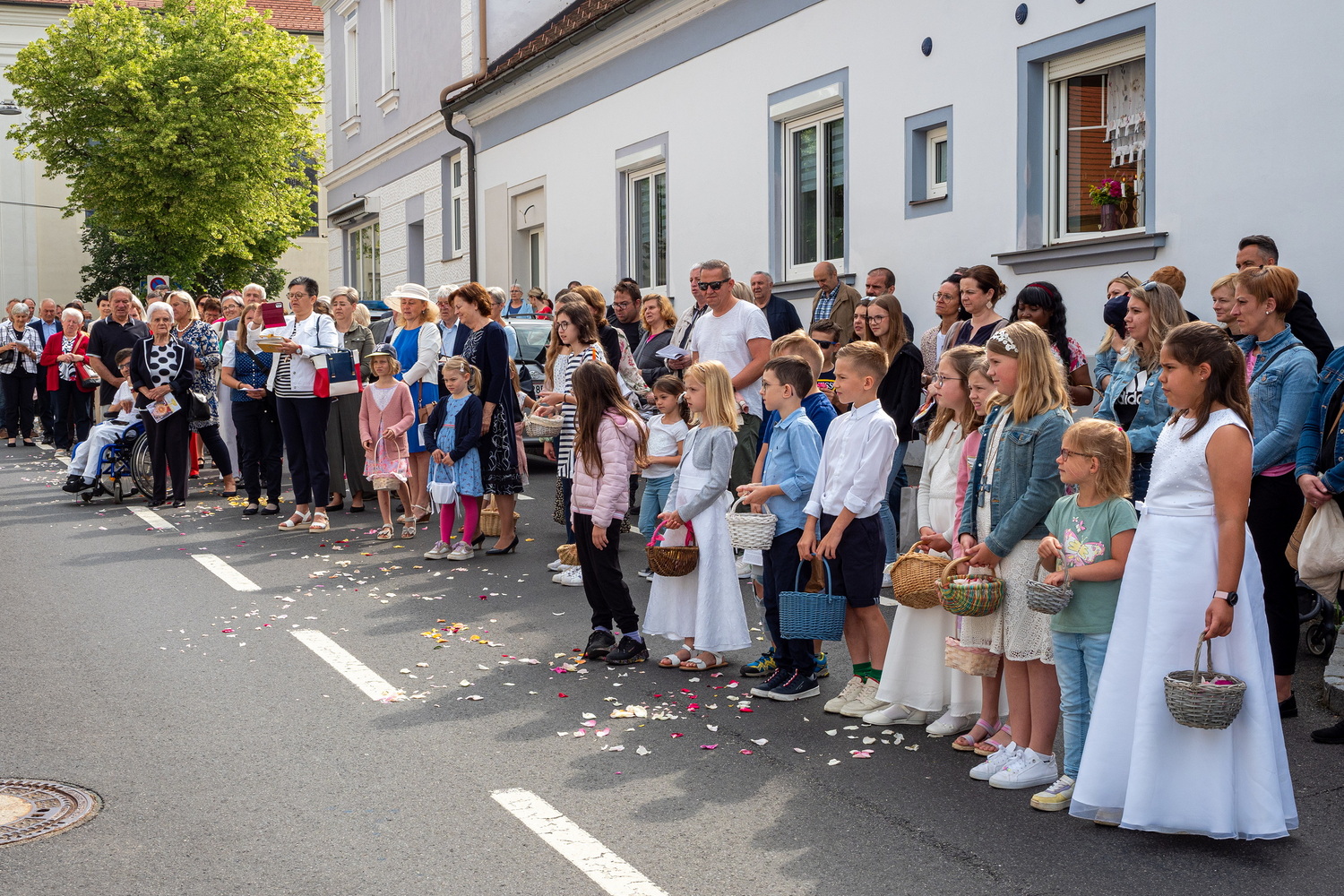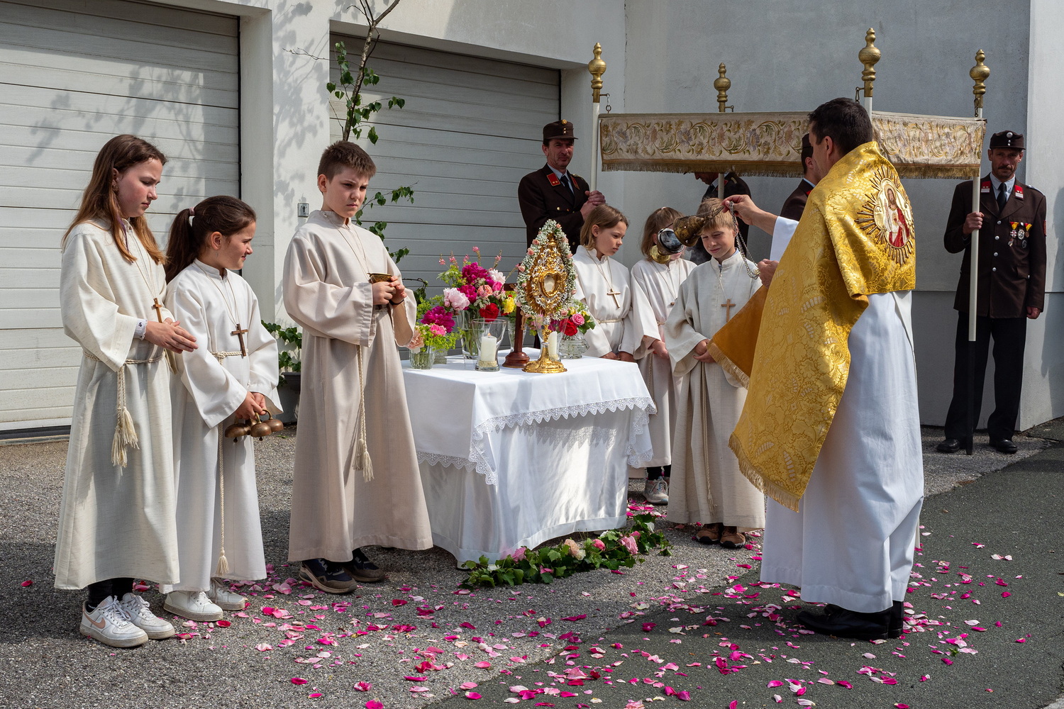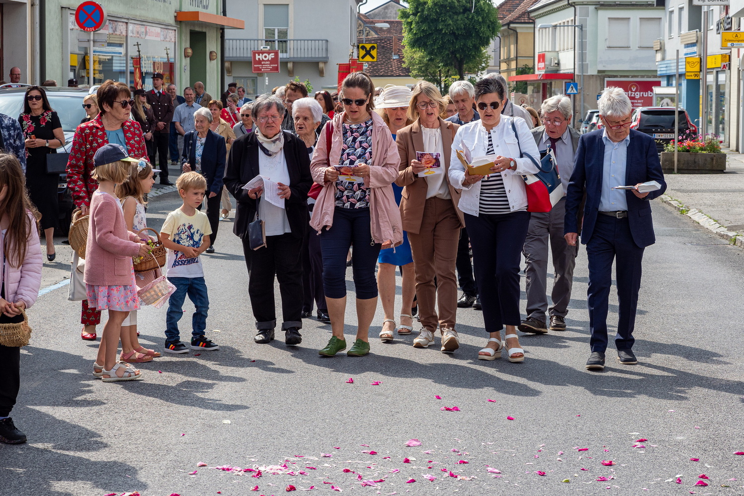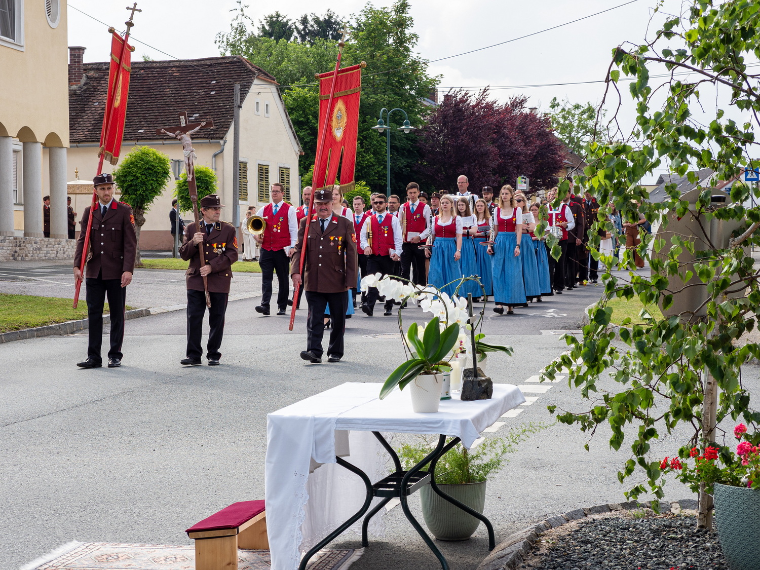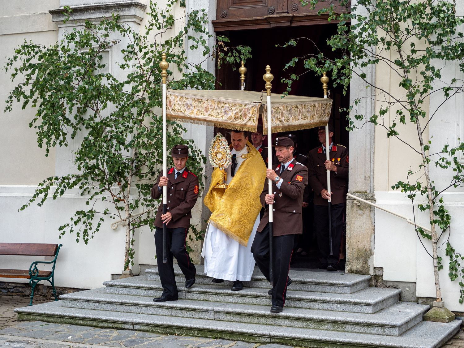 Viele Gottesdienstbesucher feierten mit Pfarrer Basil und Diakon Michael Marlovits an diesem eucharistischen Hochfest die heilige Messe. Die Prozession, bei der der Leib Christi in der Monstranz vorangetragen wird, wurde von den blumenstreuenden Kindern, der Jugendkapelle Großpetersdorf und der freiwilligen Feuerwehr begleitet und führte durch die Straßen rund um die Pfarrkirche.