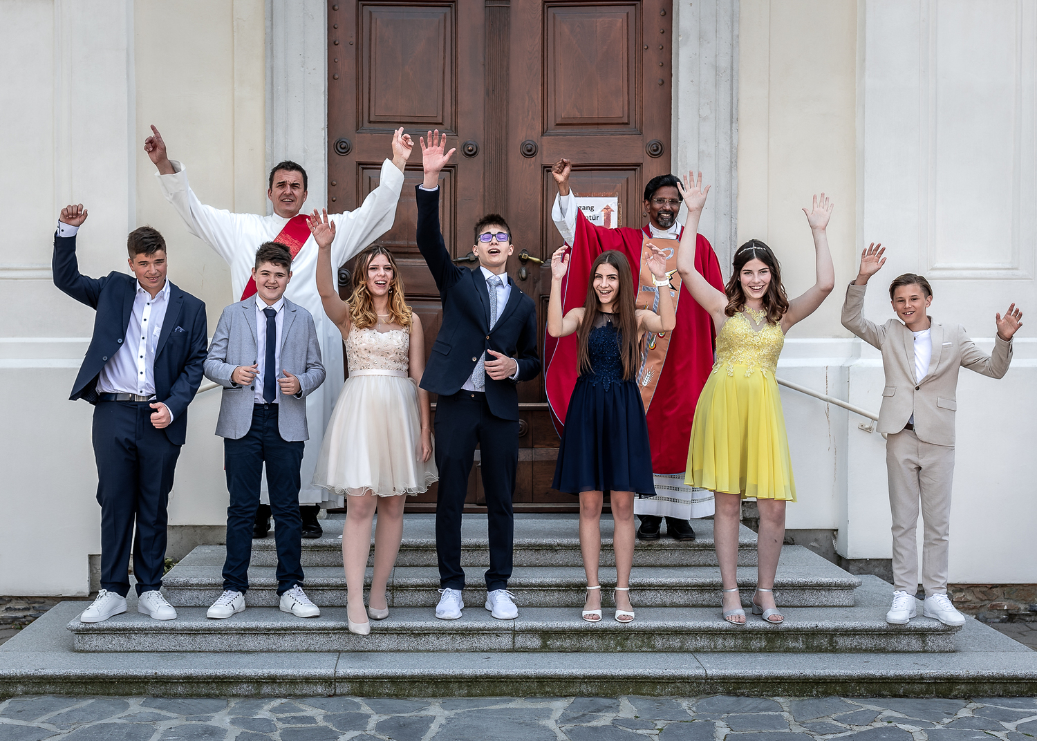 Pfarrer Sebastian konnte in diesen kleinen Gruppen jede und jeden einzelnen wirklich persönlich ansprechen. Da zum Glück auch die Coronaregelungen fast in letzter Minute etwas gelockert werden konnten, war es auch vielen Familienmitgliedern möglich, in der Kirche an diesem wunderschönen Fest teilzunehmen. Der Rest der Gäste konnte im Freien vor der Kirche Platz nehmen und die Messe dank Tonübertragung ebenfalls miterleben.