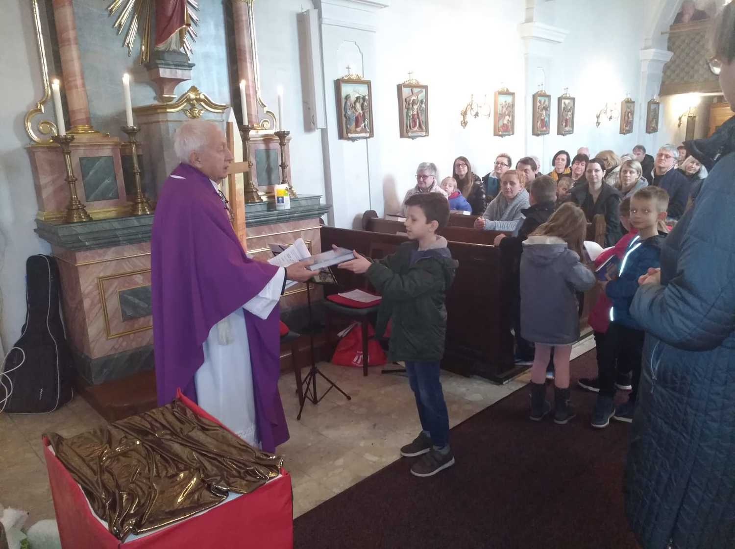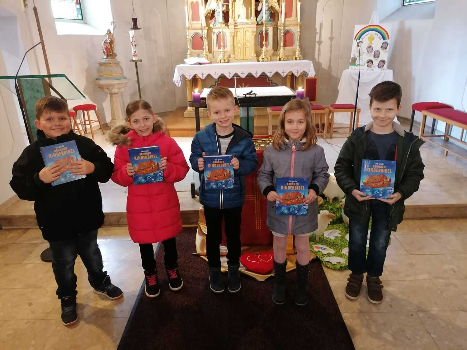 Am 8. März fand in Jabing die Bibelübergabe an die Erstkommunionkinder statt. Armin, Isabella, Leon, Max und Sarah freuen sich über ihre Kinderbibel.