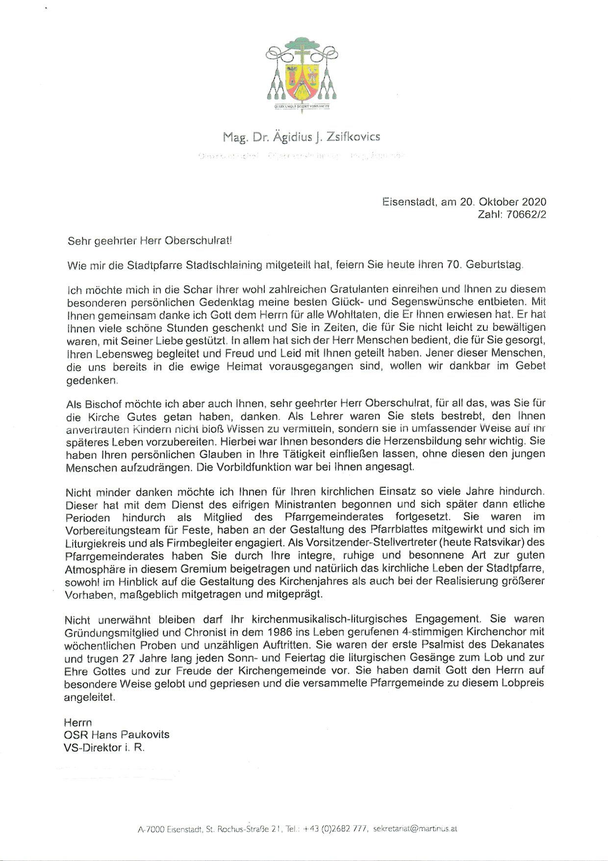 Unten finden Sie ein paar Worte von Herrn Bischof Zsifkovics an Herrn OSR Paukovits.