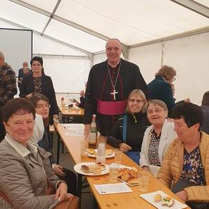 Ein großes Festzelt, das eigens für den Festgottesdienst aufgestellt worden ist und bereits am Nachmittag wieder zur Freigabe der Straße abgebaut war, wurde dank Videoübertragung zum erweiterten Kirchenraum, in dem zahlreiche Gläubige unseres Seelsorgeraums (und darüber hinaus) die Festmesse mitfeiern konnten und auch vor dem einsetzenden Regen geschützt waren. Trotz der langen Feier mit seiner Fülle an besonderen Riten ließen es sich viele nicht nehmen, noch zu einer Agape bei guter Stimmung zusammenzubleiben.