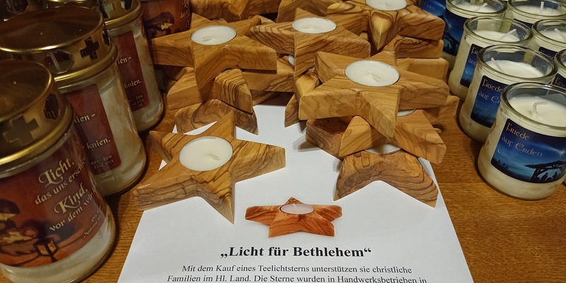 Nach den Hl. Messen bzw. am Schriftenstand der Kirche können Sie in diesen Tagen Olivenholzsterne mit Teelicht zum Preis von € 10,- erwerben. Damit unterstützen Sie die Handwerksbetriebe christlicher Familien in Bethlehem. Nicht erst in diesen Tagen des Kriegs verlassen viele unserer Geschwister im Glauben das Hl. Land, weil sie keine Perspektive zu bleiben sehen. Durch diese Aktion der Initiative Christlicher Orient leisten Sie einen bedeutenden Beitrag zur Unterstützung des Christentums im Hl. Land - und erwerben ein hochwertiges und sinnvolles Produkt, das sich auch als Weihnachtsgeschenk eignet.