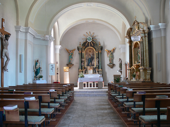 Erbaut 1853. Geweiht dem Heiligen Stephan. Rechteckbau mit eingezogenem, halbrund geschlossenem Chor und vorgebautem dreigeschoßigem Westturm mit Spitzhelm. Zweijochiges Schiff, Platzlgewölbe zwischen stuckverzierten Gurten auf breiten Pilastern. Dreiachsige Empore. Chorjoch durch rundgezogene Kehle vom östlichen Schiffspfeilerpaar zum Triumphbogen mit dem Schiff verbunden. Im Chorjoch quadratisches Platzl, in der Apsis Schalengewölbe. Volksaltar mit zwei barocken Engelfiguren an Apsiswand.