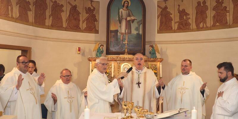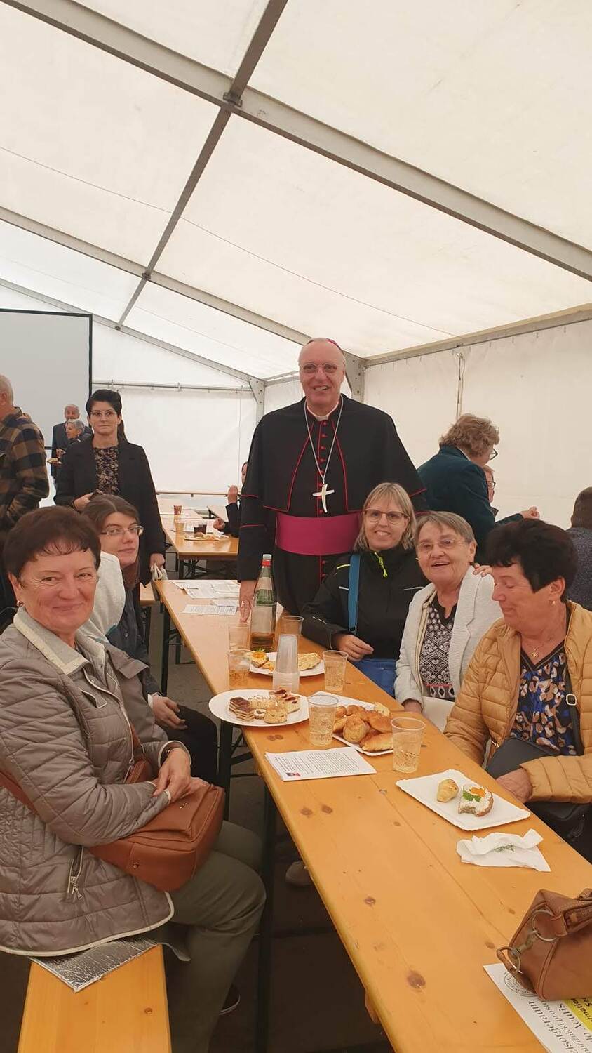 Ein großes Festzelt, das eigens für den Festgottesdienst aufgestellt worden ist und bereits am Nachmittag wieder zur Freigabe der Straße abgebaut war, wurde dank Videoübertragung zum erweiterten Kirchenraum, in dem zahlreiche Gläubige unseres Seelsorgeraums (und darüber hinaus) die Festmesse mitfeiern konnten und auch vor dem einsetzenden Regen geschützt waren. Trotz der langen Feier mit seiner Fülle an besonderen Riten ließen es sich viele nicht nehmen, noch zu einer Agape bei guter Stimmung zusammenzubleiben.