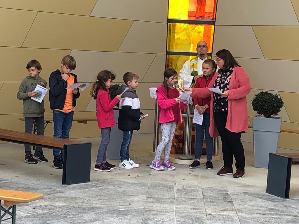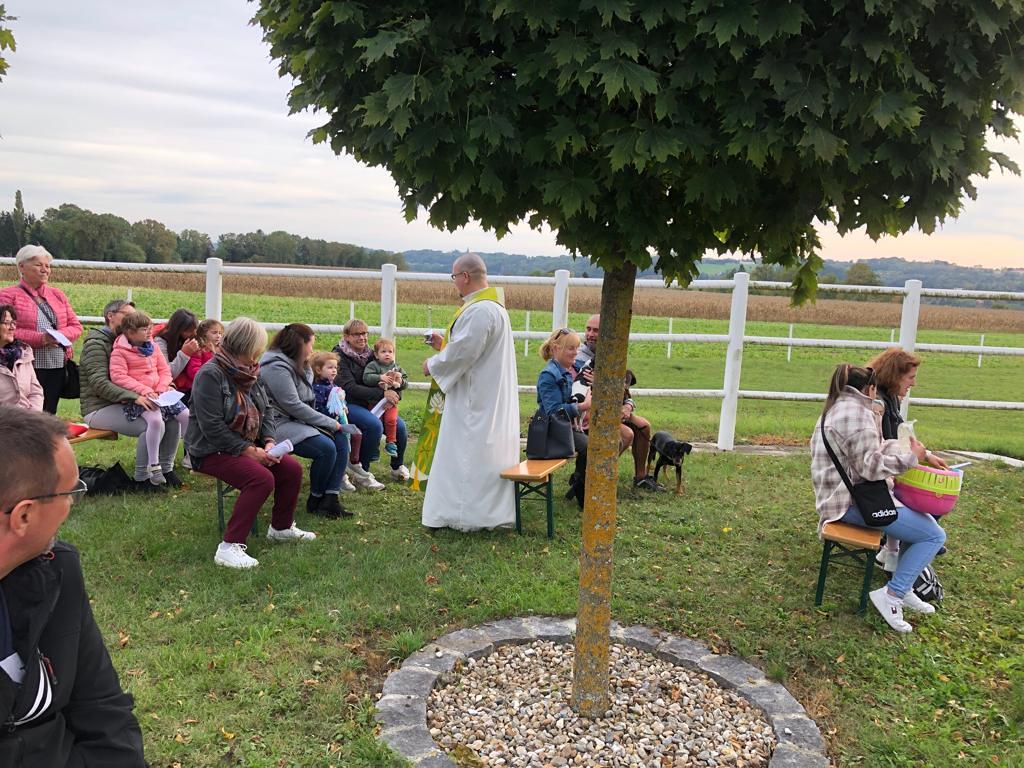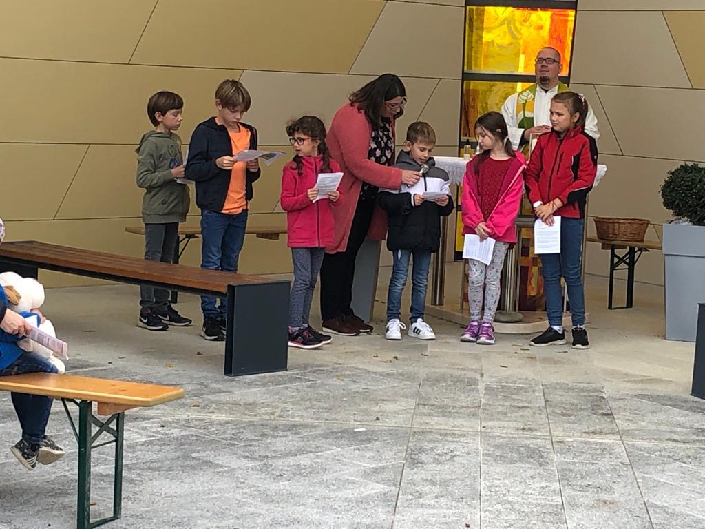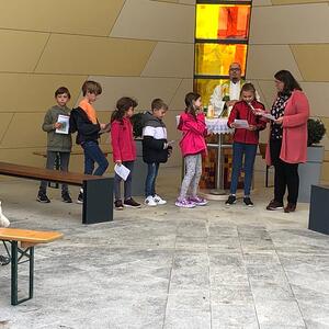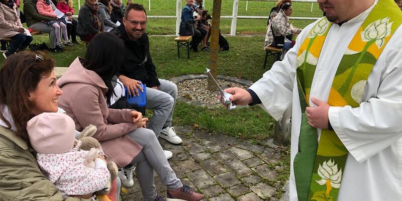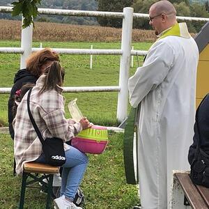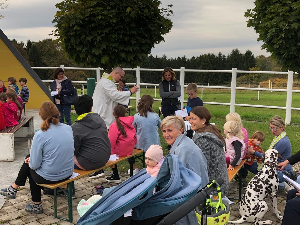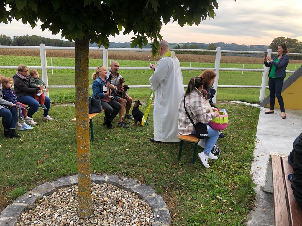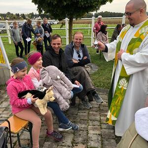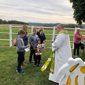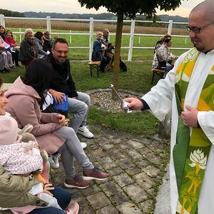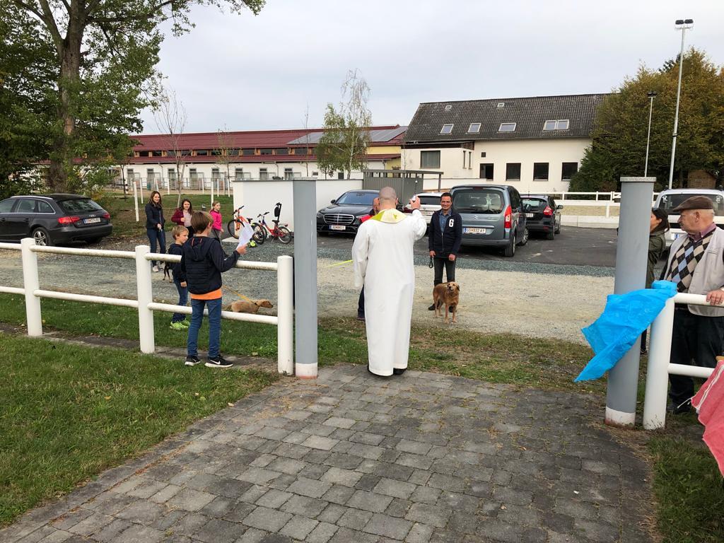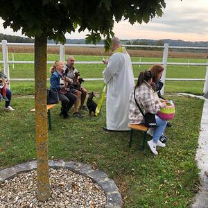 Hunde, Katzen, Hasen und weitere Tiere sowie alle Arten von Stofftieren fanden sich gemeinsam mit ihren Besitzern am 5. Oktober bei der Kreuzkapelle der Familie Jandrisic ein. Die Tiersegnung rund um den Gedenktag des Hl. Franz von Assisi und Welttierschutztag bei dieser besonderen Kapelle umgeben von einer Pferdekoppel hat schon Tradition. Wie in den Vorjahren kamen auch heuer wieder viele Zwei- und Vierbeiner, um sich den Segen von Pfarrer Thorsten Carich zu holen. Pastoralassistentin Sandra Krammer hatte die kindgerechte Gestaltung vorbereitet und die Gastgeberinnen Silvia und Sonja Jandrisic luden anschließend zu einer kleinen Stärkung ein. Vergelt's Gott!