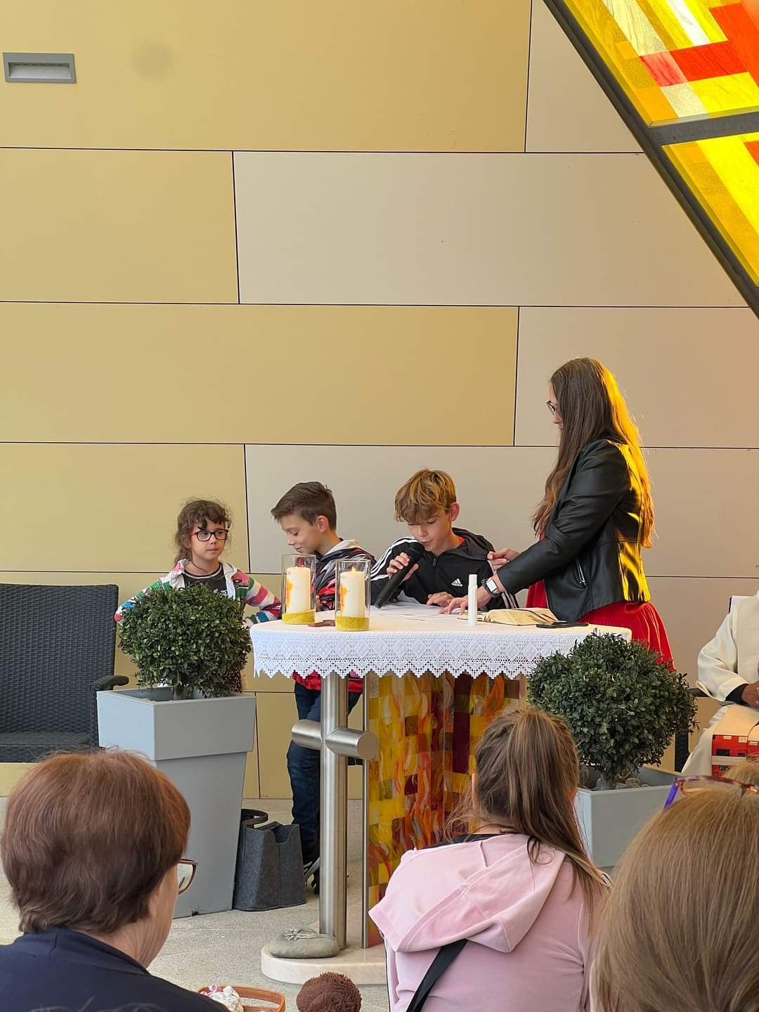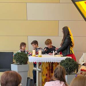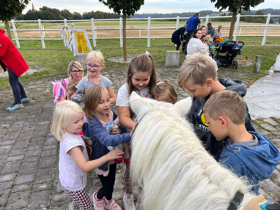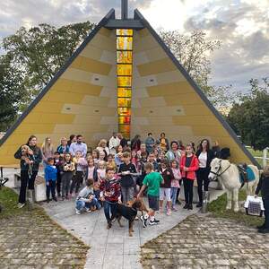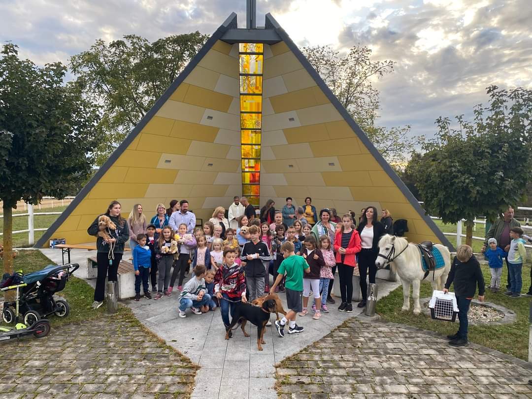 Die Regenwolken haben sich rechtzeitig verzogen und so stand der Segensfeier bei der Kreuzkapelle von Fam. Jandrisic nichts im Weg. Religionslehrerin Katharina Stipsits gestaltete die Tiersegnung mit kindgerechten Texten gemeinsam mit einigen Schüler_innen. Danke an Familie Jandrisic für die tolle Location inmitten der Pferdekuppel und die Agape im Anschluss.