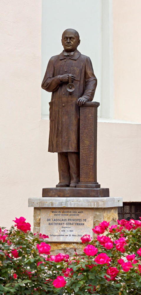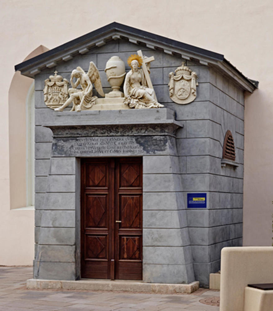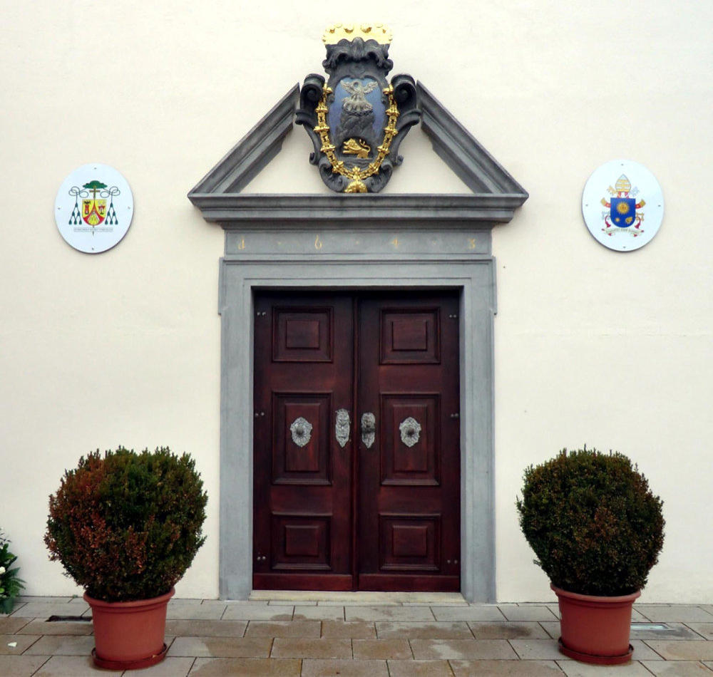 Der Eingang in unsere Basilika befindet sich an der Westseite mit dem darüber liegenden Wappen der Familie Batthyány. Seit der Erhebung zur ‚Basilica minor‘ im Jahr 2013 sind auch die Wappen von Papst Franziskus (rechts) und Bischof Ägidius Zsifkovics (links) angebracht.