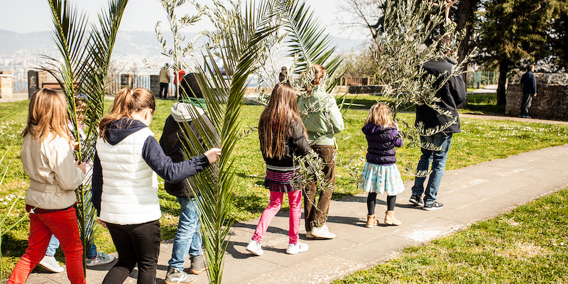 Am Palmsonntag versammeln sich vielerorts die Gläubigen nicht wie sonst in der Kirche, sondern ziehen als Gemeinde mit geschmückten und gesegneten Zweigen singend und betend zur Kirche, so wie Christus in Jerusalem eingezogen ist. Waren es in Jerusalem Palmen- und Ölzweige, so sind es bei uns die Palmbuschen, die wir als Zeichen der Verehrung Christi in Händen halten. Sie werden aus je drei Zweigen verschiedener Sträucher gebunden: Palmkätzchen, Buchsbaum, Kranawitt (Wacholder), Sevenbaum (Segenbaum), Giehbaum (Eibe), Immergrün oder Efeu; mancherorts ist auch eine Stechpalme darunter, ein Hinweis auf das Leiden Jesu. Rote Bänder erinnern wie die Gewänder des Priesters an das Blut Jesu, das er für uns vergossen hat. Diese Zweige werden geweiht, das Evangelium vom Einzug Jesu in Jerusalem verkündet, eine große Prozession setzt sich betend und singend in Bewegung: „Singt `Hosanna!´“, das Wort kommt aus dem Hebräischen und bedeutet: „Herr, hilf doch!“ Es ist das jubelnde Bekenntnis, dass Christus unser Helfer ist – und niemand sonst!
