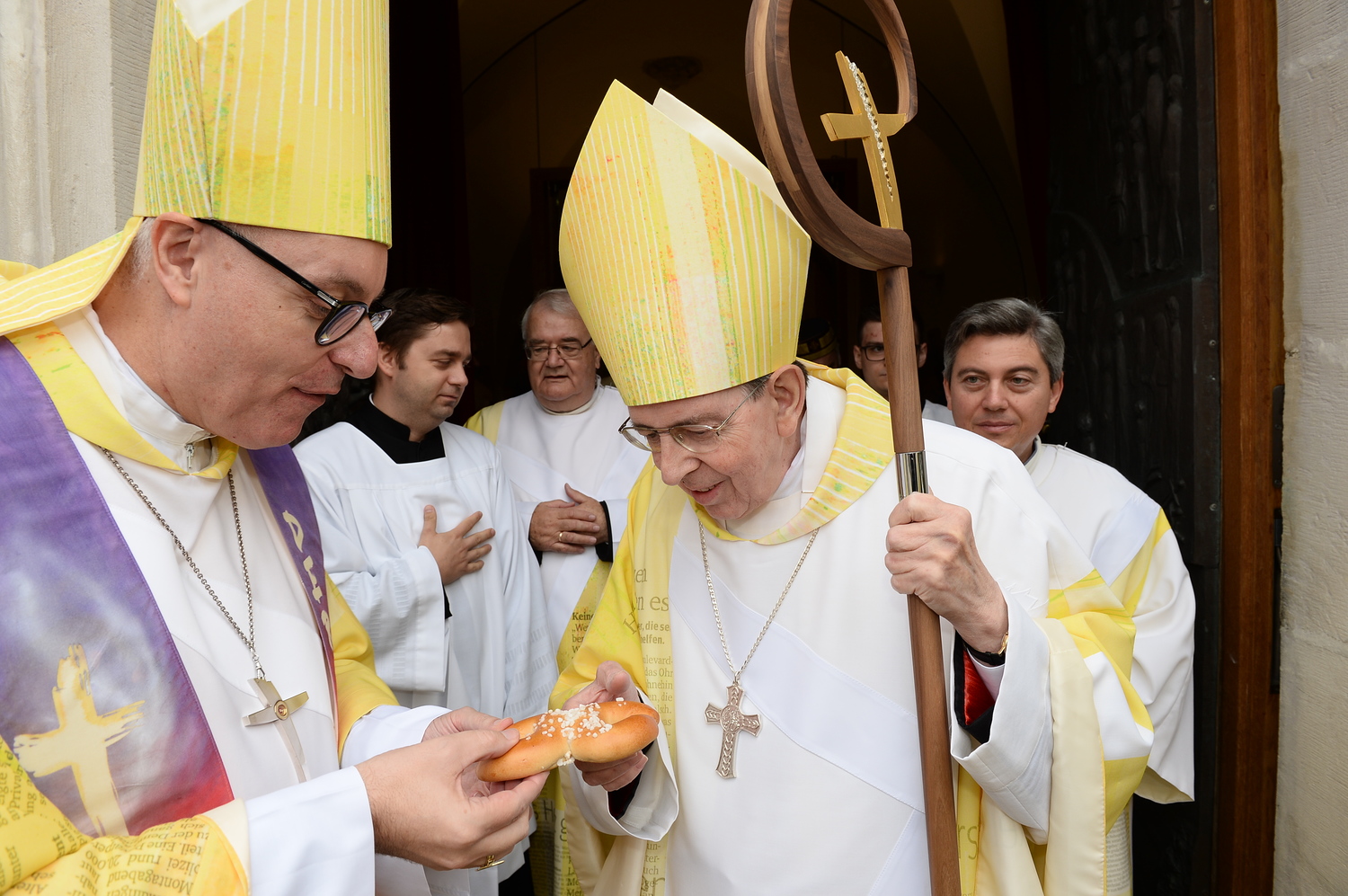 Hoher Besuch beim Martinsfest am Sonntag in Eisenstadt: Kurienkardinal Kurt Koch, Präsident des Päpstlichen Rates zur Förderung der Einheit der Christen, hielt im Rahmen des feierlichen Pontifikalamts die Festpredigt – Bischof Ägidius Zsifkovics erhielt als "Einladung" für die Jugendmesse "FeelTheDome" eine von Jugendlichen kreierte Stola.
