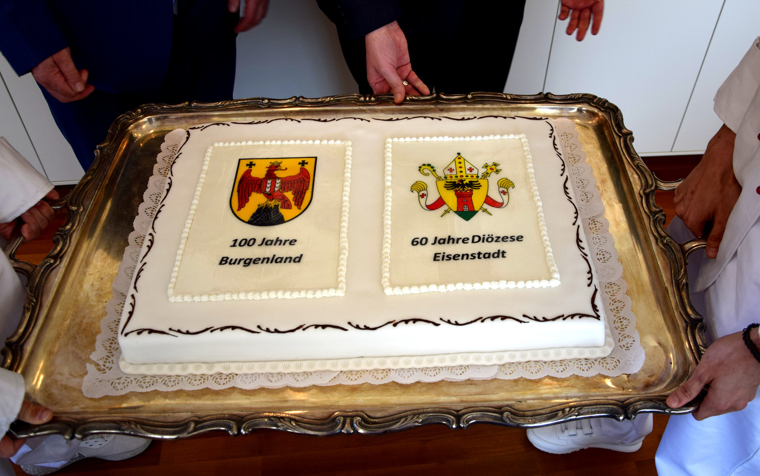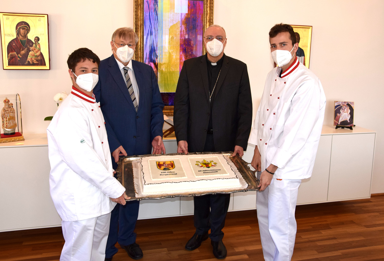 Stellvertretend für alle Lehrenden und Schülerinnen und Schüler statteten der Direktor der Berufsschule Eisenstadt Johannes Fenz und die Lehrlinge im zweiten Lehrjahr, Stefan Ruiter aus Buchschachen und Roman Till aus Neufeld, Bischof Ägidius J. Zsifkovics einen Besuch ab. Auf der Torte befindet sich neben dem Wappen der Diözese auch das burgenländische Landeswappen. Das Burgenland begeht in diesem Jahr sein 100jähriges Bestehen.