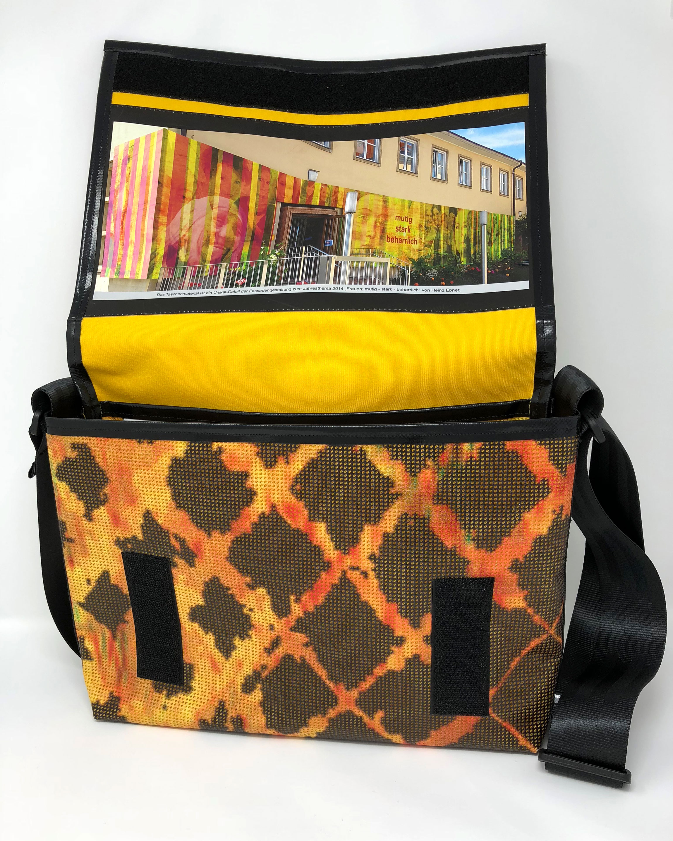 Laptop-Tasche aus PVC Mesh Netzvinyl mit Klettverschluss und Trageriemen. Auf der Innenseite des Taschendeckels ist eine Ansicht des Gesamtwerkes abgedruckt. Die Tasche besteht aus einem verstellbaren Tragegurt (Material: Autosicherheitsgurt), einer Innenfütterung und hat ein zusätzliches Innenfach.