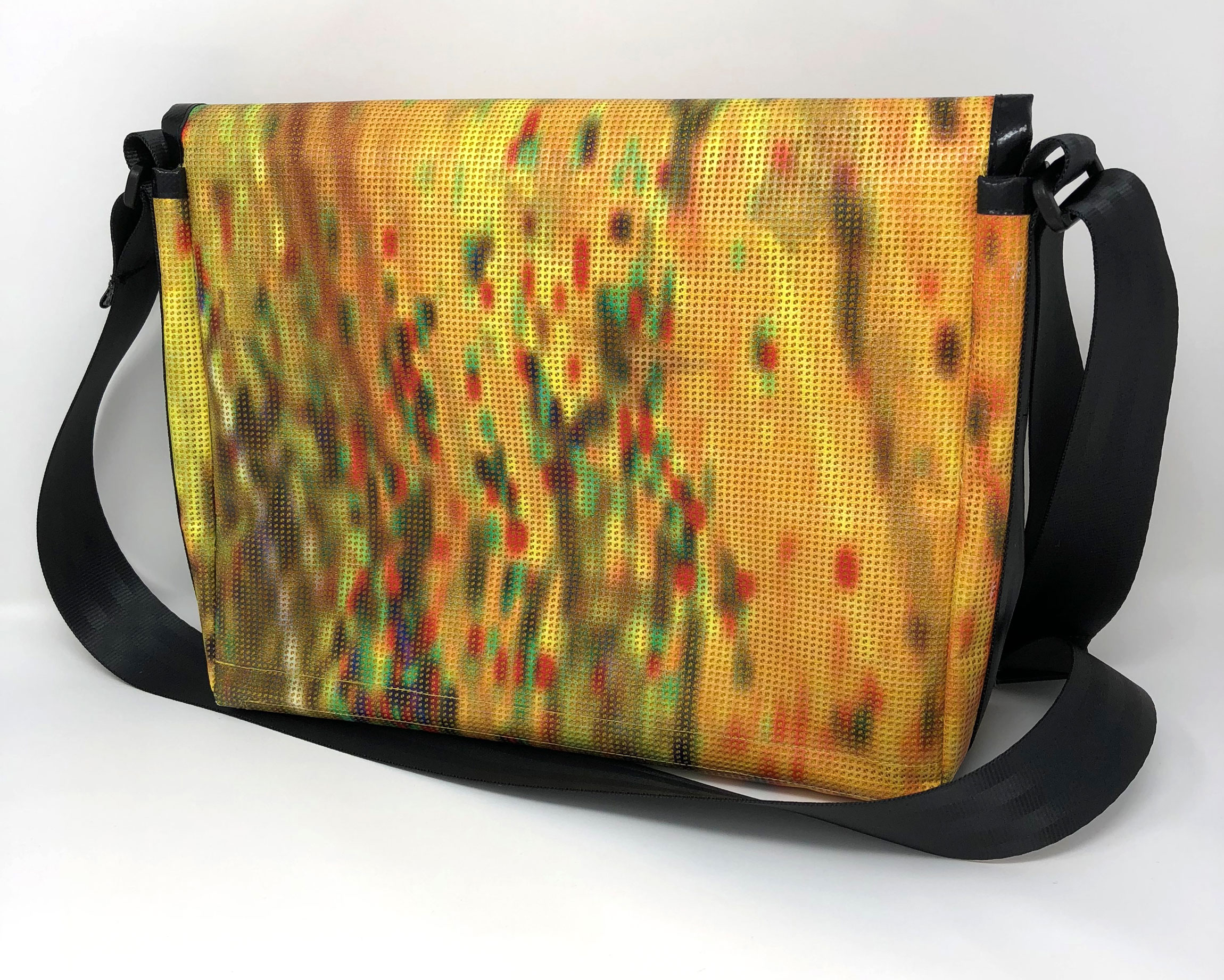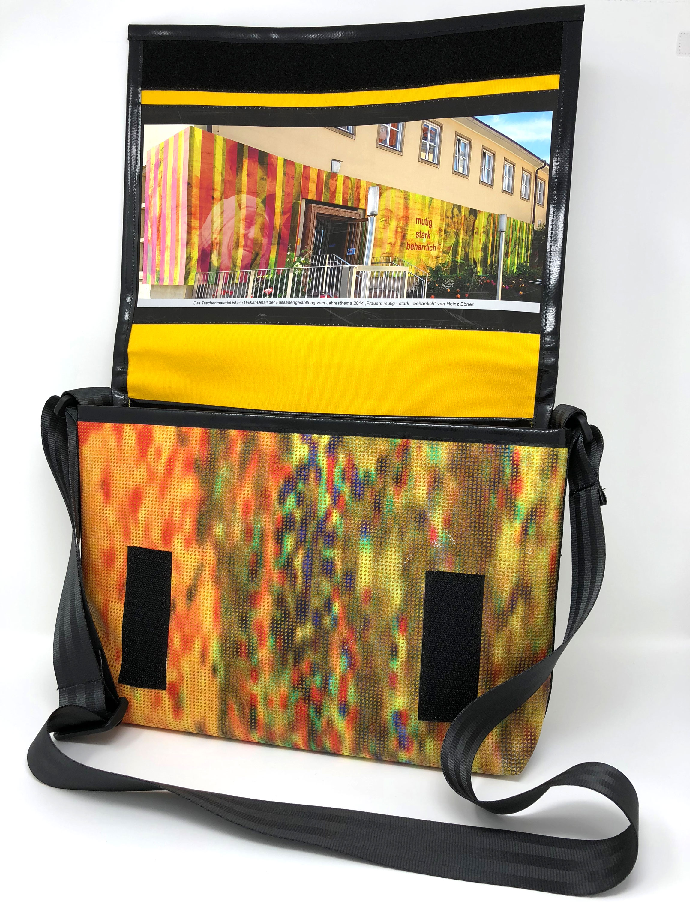 Laptop-Tasche aus PVC Mesh Netzvinyl mit Klettverschluss und Trageriemen. Auf der Innenseite des Taschendeckels ist eine Ansicht des Gesamtwerkes abgedruckt. Die Tasche besteht aus einem verstellbaren Tragegurt (Material: Autosicherheitsgurt), einer Innenfütterung und hat ein zusätzliches Innenfach.
