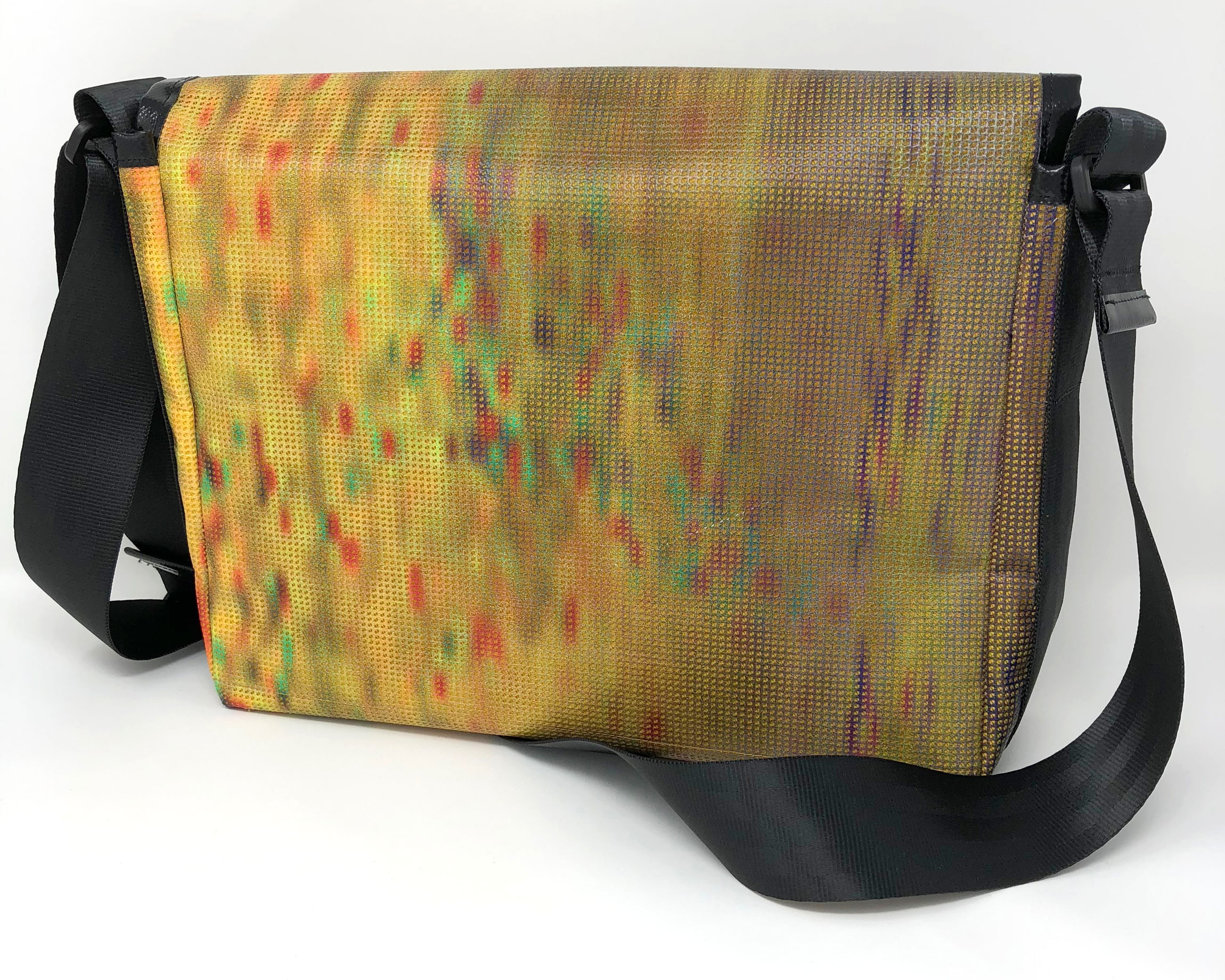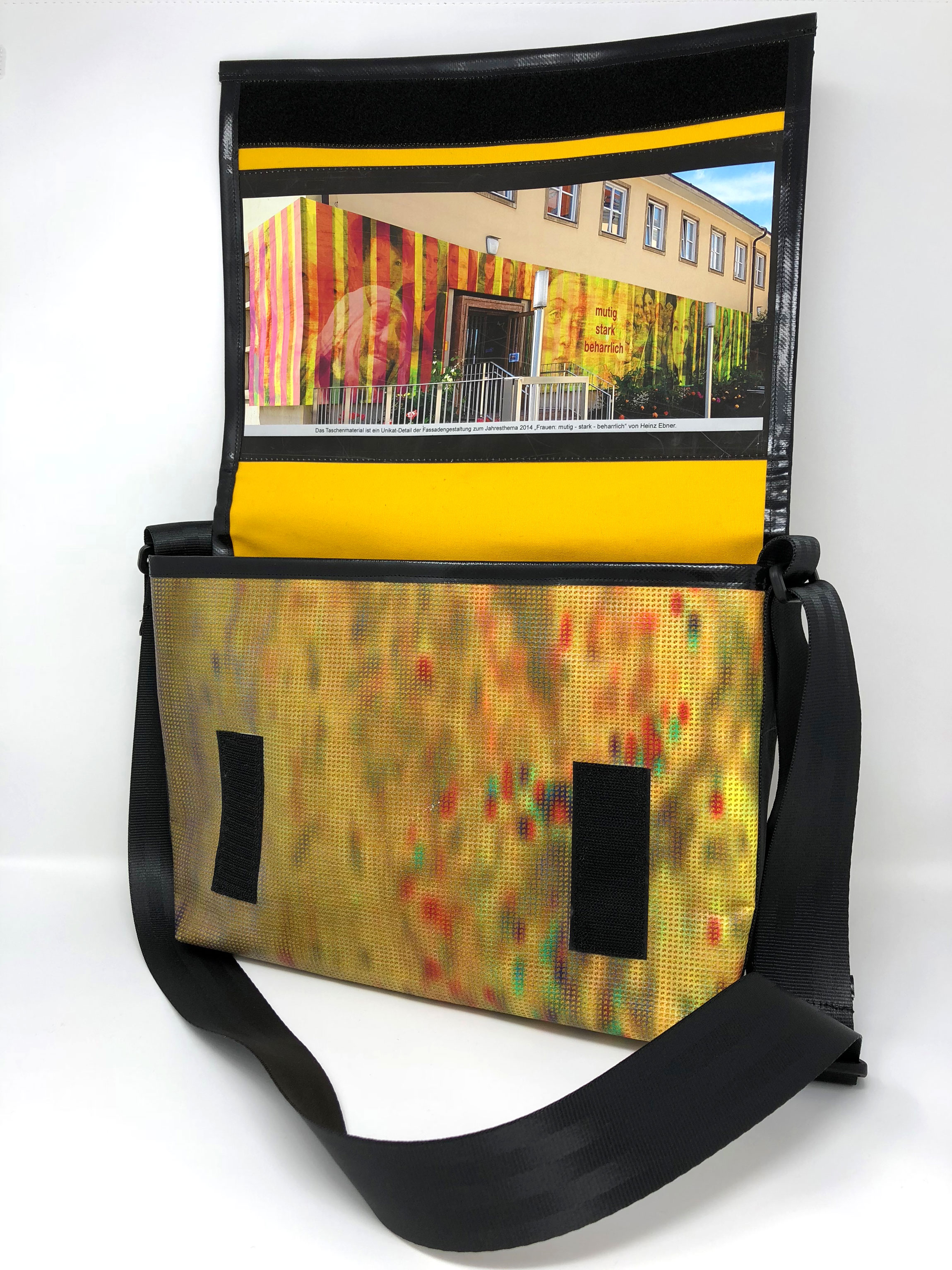 Laptop-Tasche aus PVC Mesh Netzvinyl mit Klettverschluss und Trageriemen. Auf der Innenseite des Taschendeckels ist eine Ansicht des Gesamtwerkes abgedruckt. Die Tasche besteht aus einem verstellbaren Tragegurt (Material: Autosicherheitsgurt), einer Innenfütterung und hat ein zusätzliches Innenfach.