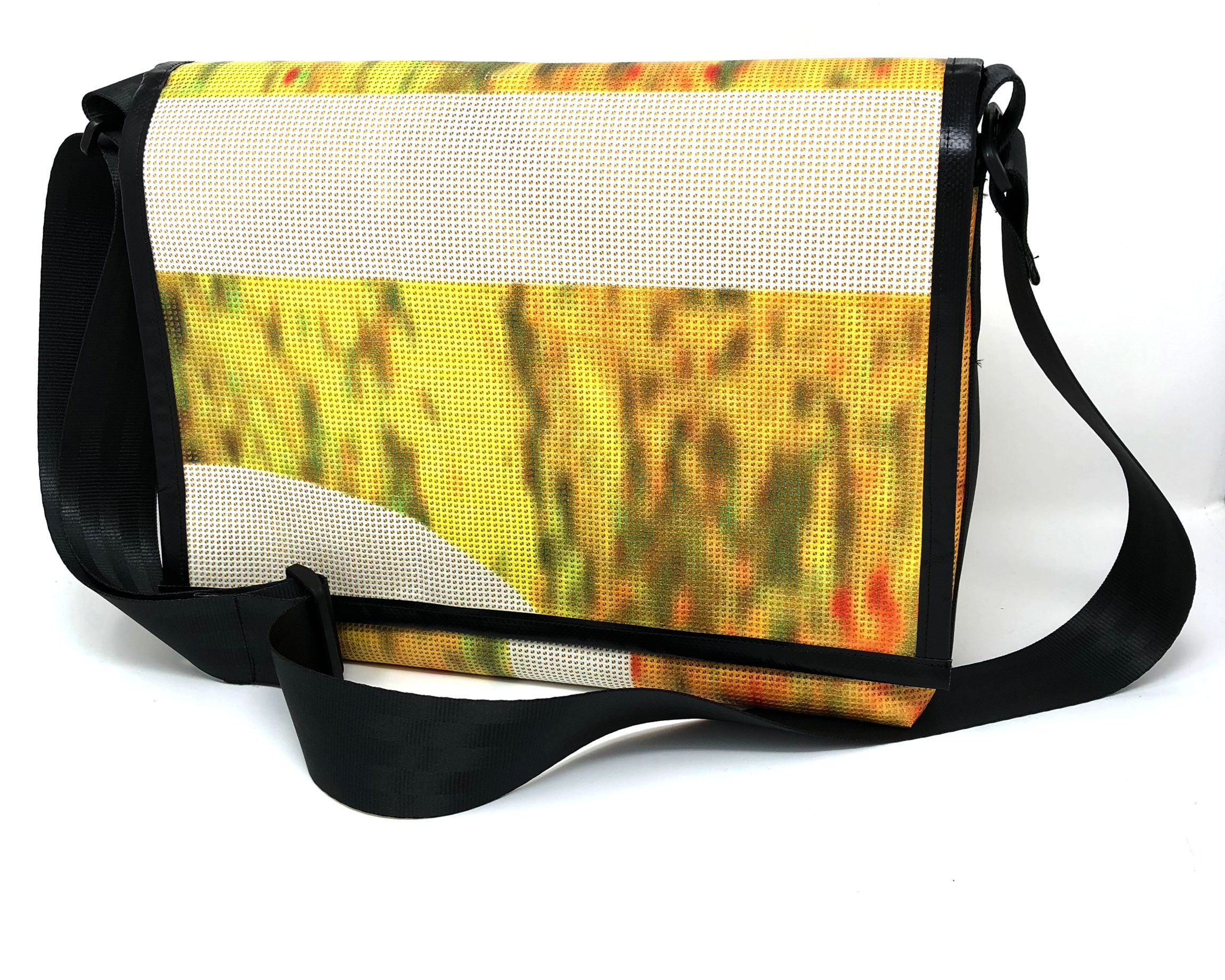Laptop-Tasche aus PVC Mesh Netzvinyl mit Klettverschluss und Trageriemen. Auf der Innenseite des Taschendeckels ist eine Ansicht des Gesamtwerkes abgedruckt. Die Tasche besteht aus einem verstellbaren Tragegurt (Material: Autosicherheitsgurt), einer Innenfütterung und hat ein zusätzliches Innenfach.