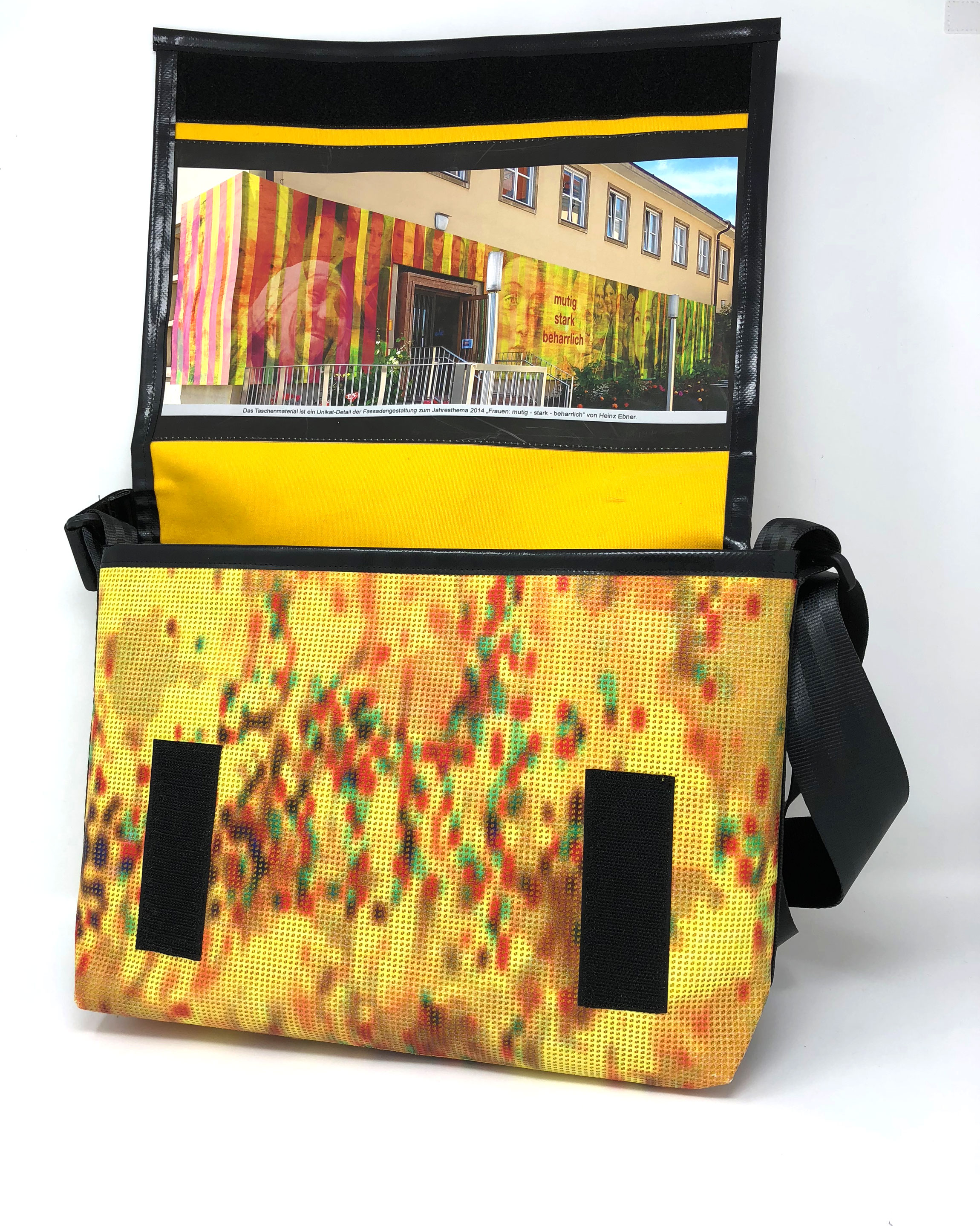 Laptop-Tasche aus PVC Mesh Netzvinyl mit Klettverschluss und Trageriemen. Auf der Innenseite des Taschendeckels ist eine Ansicht des Gesamtwerkes abgedruckt. Die Tasche besteht aus einem verstellbaren Tragegurt (Material: Autosicherheitsgurt), einer Innenfütterung und hat ein zusätzliches Innenfach.