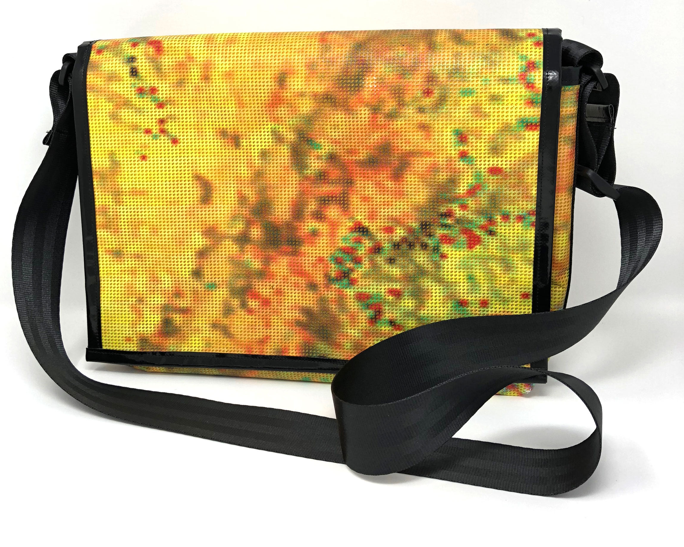 Laptop-Tasche aus PVC Mesh Netzvinyl mit Klettverschluss und Trageriemen. Auf der Innenseite des Taschendeckels ist eine Ansicht des Gesamtwerkes abgedruckt. Die Tasche besteht aus einem verstellbaren Tragegurt (Material: Autosicherheitsgurt), einer Innenfütterung und hat ein zusätzliches Innenfach.