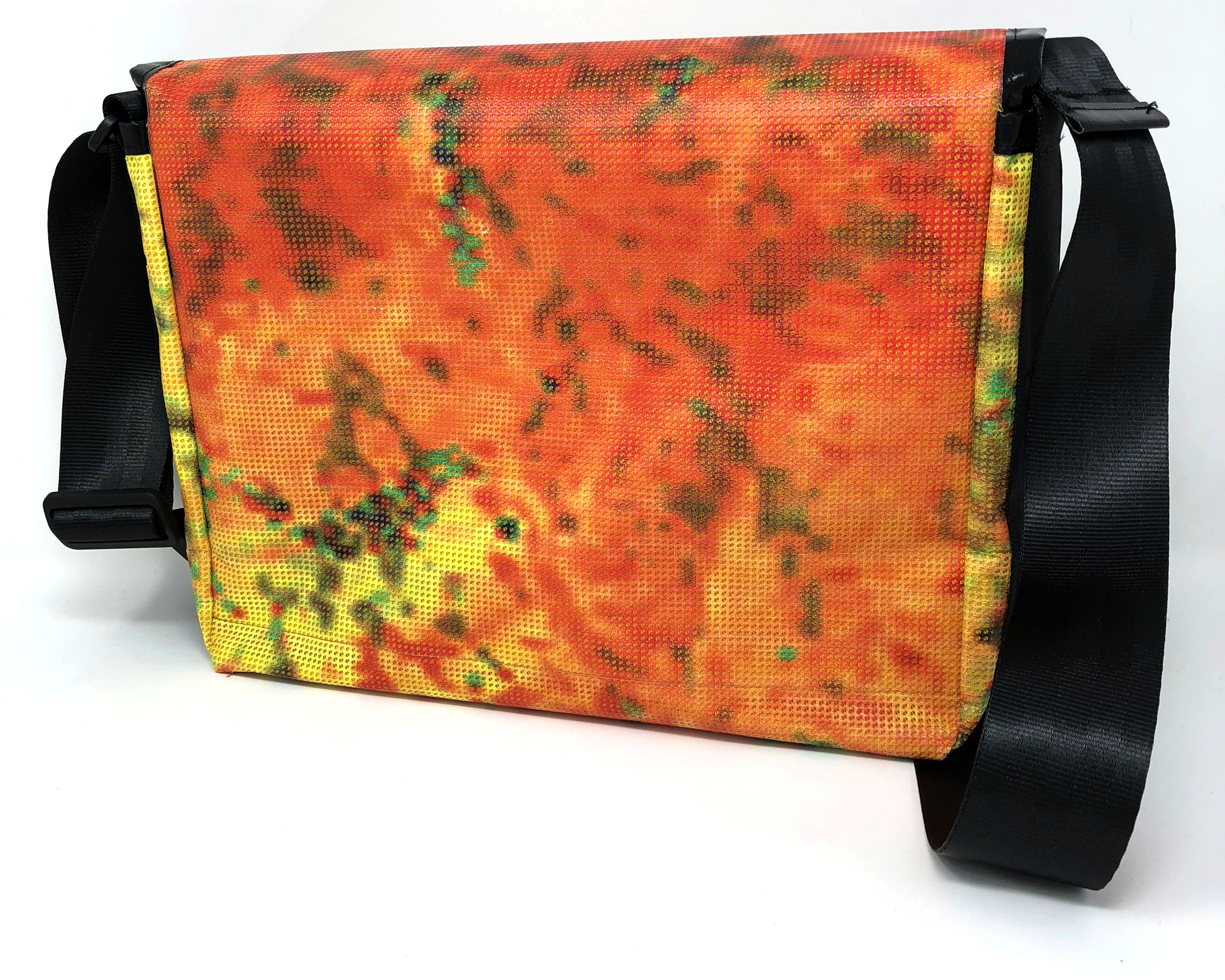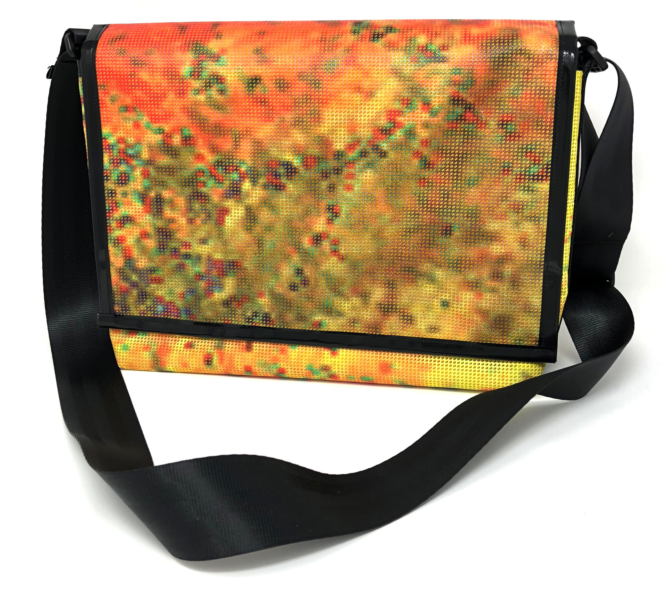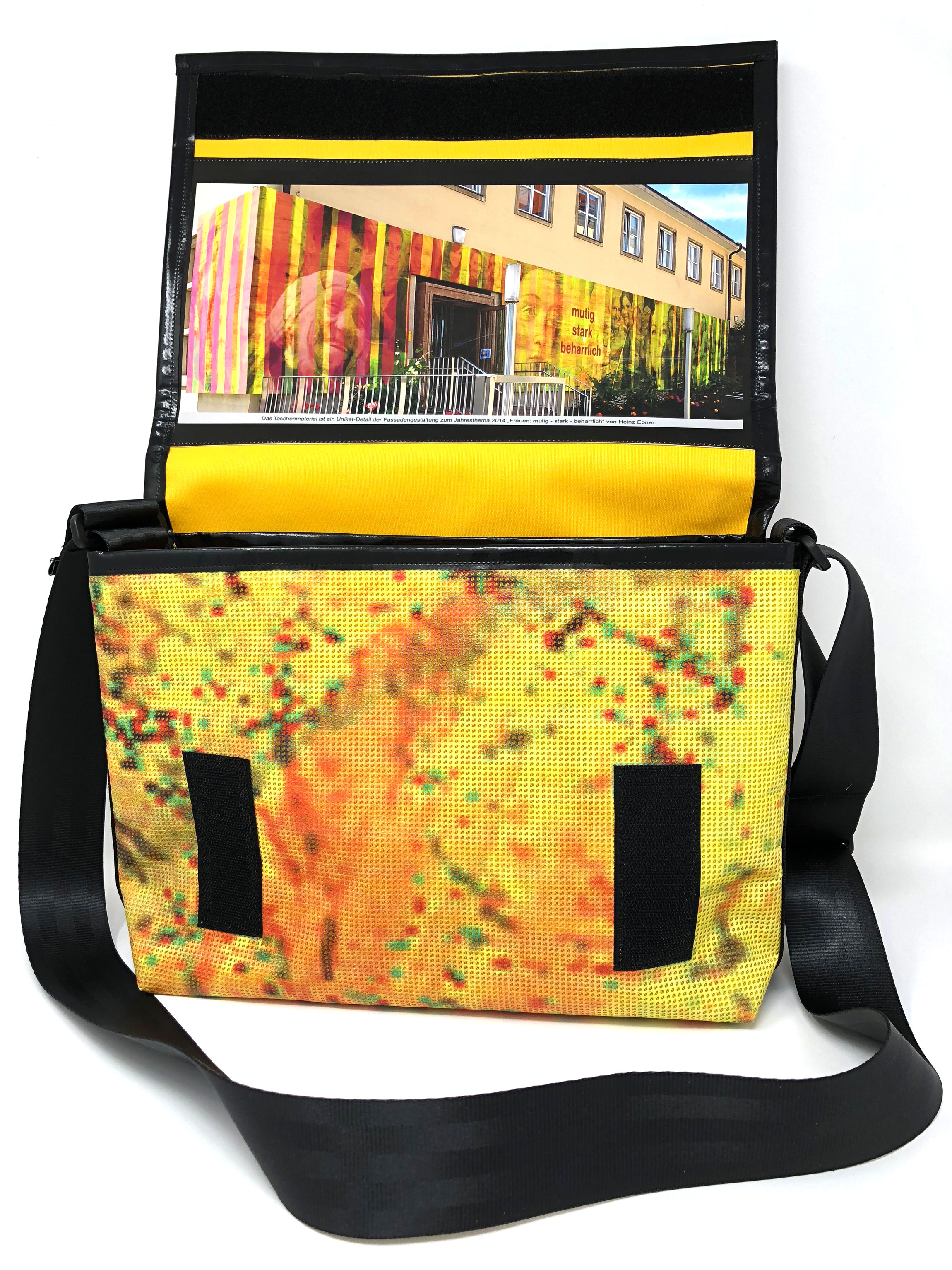 Laptop-Tasche aus PVC Mesh Netzvinyl mit Klettverschluss und Trageriemen. Auf der Innenseite des Taschendeckels ist eine Ansicht des Gesamtwerkes abgedruckt. Die Tasche besteht aus einem verstellbaren Tragegurt (Material: Autosicherheitsgurt), einer Innenfütterung und hat ein zusätzliches Innenfach.