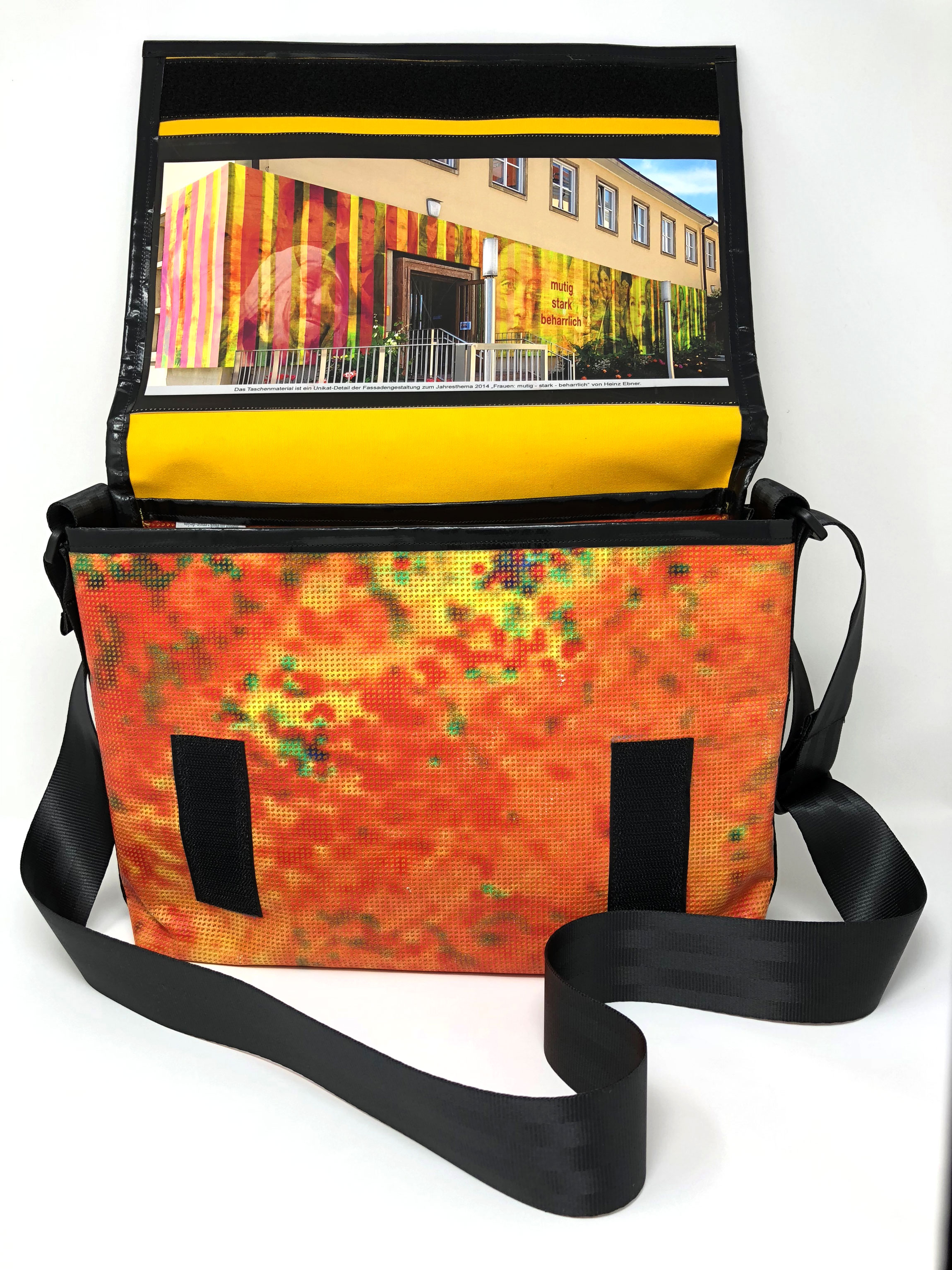 Laptop-Tasche aus PVC Mesh Netzvinyl mit Klettverschluss und Trageriemen. Auf der Innenseite des Taschendeckels ist eine Ansicht des Gesamtwerkes abgedruckt. Die Tasche besteht aus einem verstellbaren Tragegurt (Material: Autosicherheitsgurt), einer Innenfütterung und hat ein zusätzliches Innenfach.