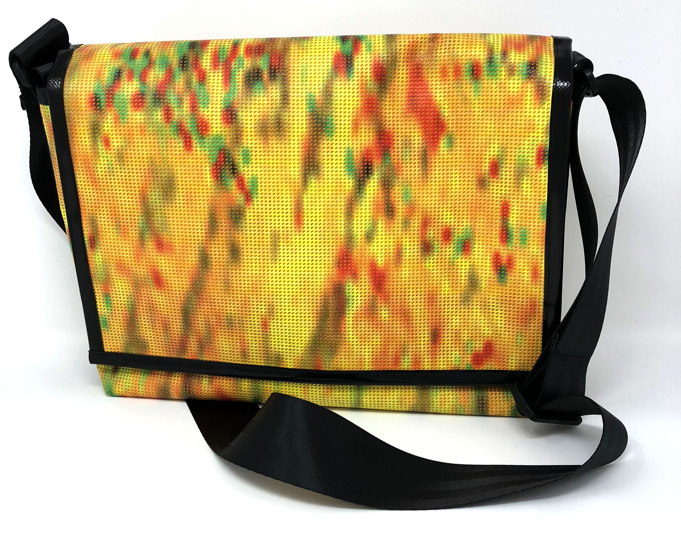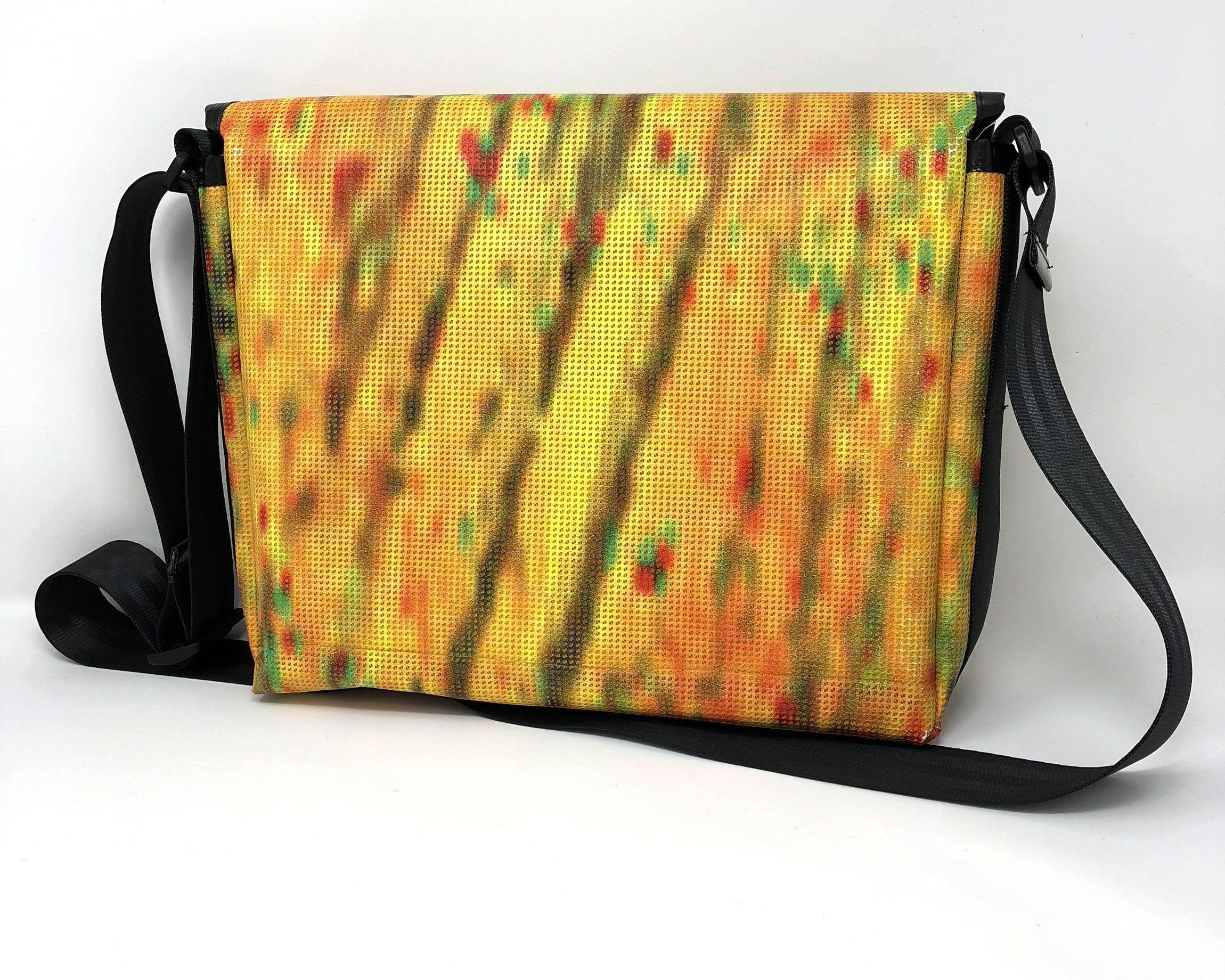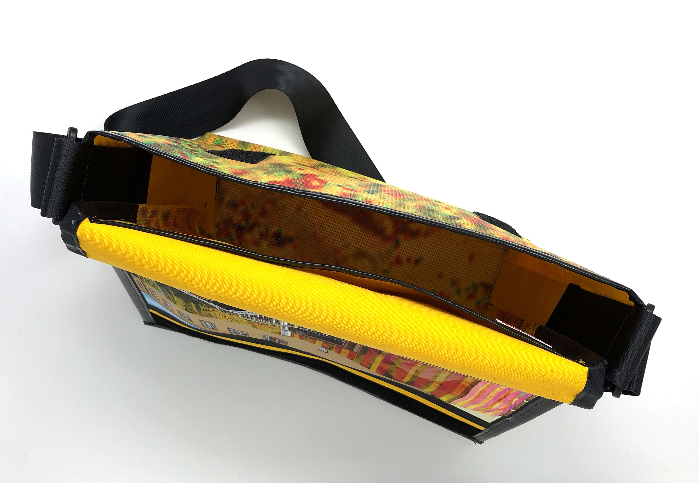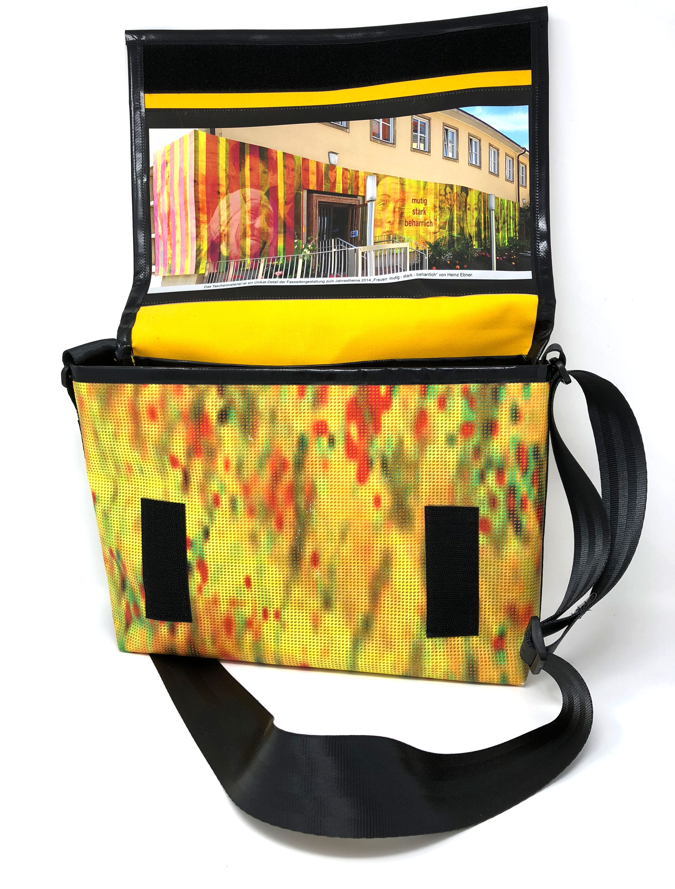 Laptop-Tasche aus PVC Mesh Netzvinyl mit Klettverschluss und Trageriemen. Auf der Innenseite des Taschendeckels ist eine Ansicht des Gesamtwerkes abgedruckt. Die Tasche besteht aus einem verstellbaren Tragegurt (Material: Autosicherheitsgurt), einer Innenfütterung und hat ein zusätzliches Innenfach.