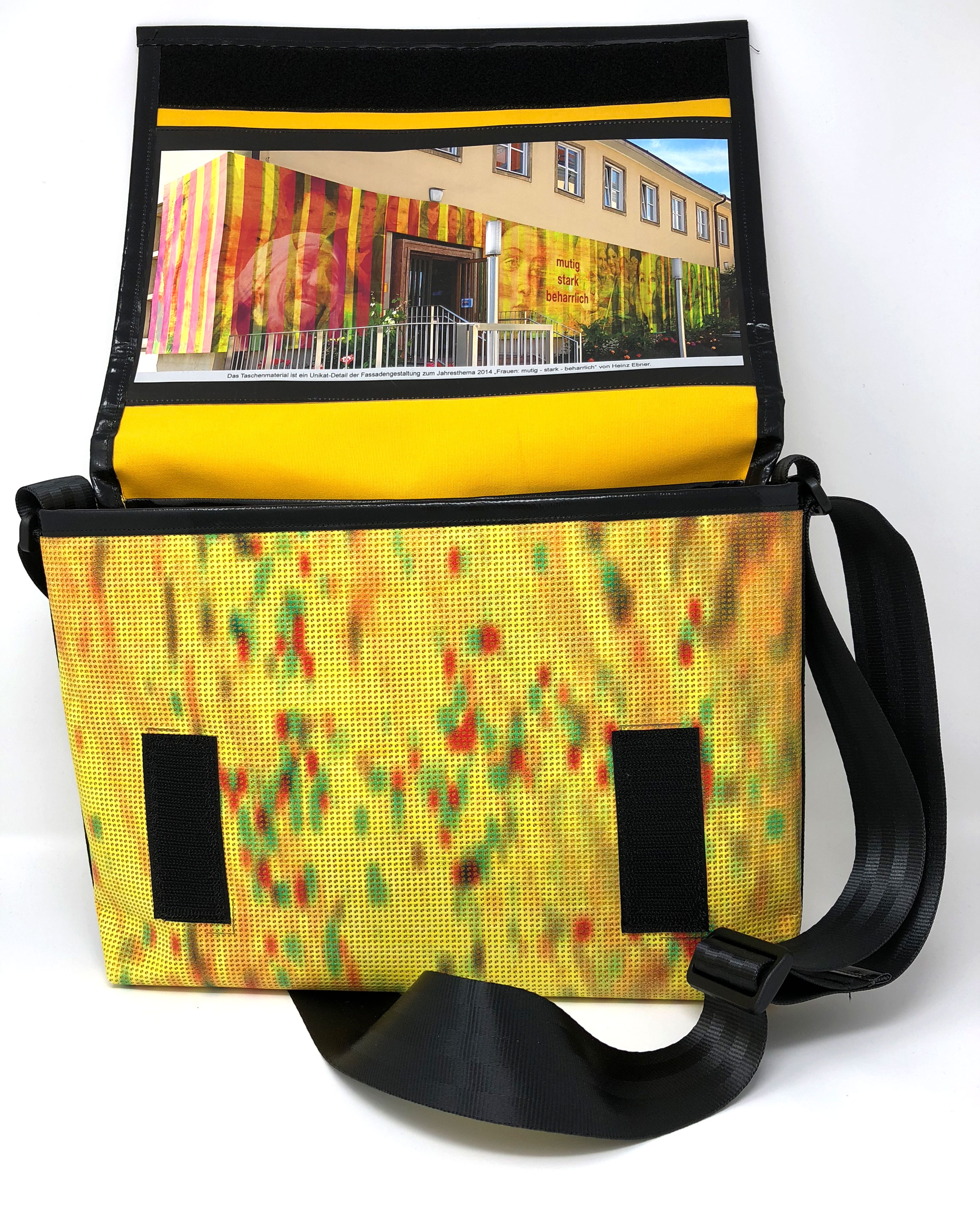 Laptop-Tasche aus PVC Mesh Netzvinyl mit Klettverschluss und Trageriemen. Auf der Innenseite des Taschendeckels ist eine Ansicht des Gesamtwerkes abgedruckt. Die Tasche besteht aus einem verstellbaren Tragegurt (Material: Autosicherheitsgurt), einer Innenfütterung und hat ein zusätzliches Innenfach.